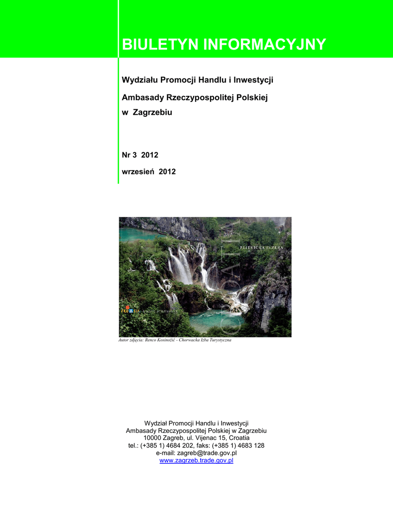 BIULETYN INFORMACYJNY Wydziału Promocji Handlu i Inwestycji Ambasady Rzeczypospolitej Polskiej w Zagrzebiu Nr 3 2012 wrzesień 2012 Autor zdjęcia: Renco Kosinožić - Chorwacka Izba Turystyczna Wydział Promocji Handlu i Inwestycji Ambasady Rzeczypospolitej Polskiej w Zagrzebiu 10000 Zagreb, ul. Vijenac 15, Croatia tel.: (+385 1) 4684 202, faks: (+385 1) 4683 128 e-mail: [email protected] www.zagrzeb.trade.gov.pl WPHI Zagrzeb, wrzesień 2012 BIULETYN INFORMACYJNY Nr 3 2012 SPIS TREŚCI: 1. Produkt Krajowy Brutto ......................................................................................3 2. Produkcja przemysłowa .....................................................................................3 3. Budownictwo ......................................................................................................5 4. Turystyka ...........................................................................................................5 5. Handel detaliczny ...............................................................................................6 6. Inflacja ................................................................................................................6 7. Bezrobocie ..........................................................................................................7 8. Płace ..................................................................................................................8 9. Wymiana towarowa z zagranicą ........................................................................8 10. Bezpośrednie inwestycje zagraniczne.………………………………………….……….15 Biuletyn informacyjny WPHI Zagrzeb, wrzesień 2012 | 2 WPHI Zagrzeb, wrzesień 2012 BIULETYN INFORMACYJNY Nr 3 2012 1. Produkt Krajowy Brutto Po spadku PKB w I kwartale b.r. o 1,3% również w II kwartale zanotowano spadek aktywności gospodarczej. Według wstępnych danych Chorwackiego Urzędu Statystycznego (DZS) spadek PKB w II kwartale wyniósł 2,1% w skali roku. Pomimo niskiej bazy odniesienia i wieloletniej spadkowej tendencji PKB wielkość spadku w II kwartale była najwyższa od II kwartału 2010 r., co potwierdza występowanie poważnych problemów w chorwackiej gospodarce. Zmniejszenie produkcji przemysłowej i usług wynika przede wszystkim ze spadku konsumpcji krajowej spowodowanej zmniejszeniem realnych dochodów i zatrudnienia, a także ograniczeniem inwestycji. Niewątpliwy wpływ na taką sytuację miał wysoki poziom zadłużenia wszystkich sektorów, które w aktualnej sytuacji kryzysowej wpłynęło na ograniczenie nowych kredytów, które w minionych latach umożliwiały wzrost PKB. 2. Produkcja przemysłowa Negatywne tendencje produkcji przemysłowej, notowane od listopada 2011 r. w dalszym ciągu występowały w I półroczu b.r. W I półroczu produkcja przemysłowa była o 6% niższa w porównaniu z analogicznym okresem 2011 r., na co w największym stopniu wpłynęły słaby popyt wewnętrzny jak również niekorzystna sytuacja w UE, która wpłynęła na zmniejszenie zagranicznego popytu. Równolegle z tym poszczególne branże przemysłu były w trakcie restrukturyzacji, co także miało negatywny wpływ na wielkość produkcji. W I półroczu brak było inwestycji, które mogłyby zmienić dotychczasową tendencję spadkową i taka sytuacja trwa już od czterech lat. Niekorzystne warunki atmosferyczne mogą także pogorszyć dodatkowo sytuację w poszczególnych dziedzinach przemysłu, szczególnie w branżach przetwórstwa owocowowarzywnego, produkcji żywności i pasz i dlatego w najbliższym czasie nie oczekuje się poprawy wyników. Dane dotyczące kształtowania się produkcji przemysłowej w I półroczu 2012 r. w poszczególnych branżach przedstawia poniższa tabela Biuletyn informacyjny WPHI Zagrzeb, wrzesień 2012 | 3 WPHI Zagrzeb, wrzesień 2012 BIULETYN INFORMACYJNY Nr 3 2012 WSKAŹNIKI WIELKOŚCI PRODUKCJI PRZEMYSŁOWEJ wg NKD KLASYFIKACJI 2007 W CZERWCU 2012 r. VI 2012 2011 VI 2012 VI 2011 100,00 93,9 93,1 94,0 6,83 83,5 77,5 85,4 06 Wydobywanie ropy naftowej i gazu ziemnego 4,94 84,1 83,0 85,2 08 Górnictwo i wydobywanie gdzie indziej niesklasyfikowane 1,06 81,9 64,8 71,7 09 Działalność usługowa wspomagająca pozostałe górnictwo i wydobywanie 0,83 82,0 84,0 94,9 80,04 97,3 95,0 94,5 17,96 95,9 96,6 99,9 11 Produkcja napojów 5,11 128,7 102,0 102,2 12 Produkcja wyrobów tytoniowych 1,28 102,7 101,4 104,9 13 Produkcja tkanin 0,95 100,9 101,4 93,8 14 Produkcja odzieży 2,16 75,7 79,3 87,9 15 Produkcja wyrobów futrzarskich 0,90 93,4 94,1 95,0 16 Produkcja wyrobów z drewna, korka, oprócz mebli; produkcja wyrobów ze słomy i materiałów używanych do wyplatania 2,77 88,0 86,7 87,6 17 Produkcja papieru i wyrobów papierniczych 2,13 95,4 86,5 101,3 18 Reprodukcja zapisanych nośników informacji 2,74 87,4 86,4 90,4 19 Produkcja koksu i produktów rafinacji ropy naftowej 2,68 130,7 119,2 91,4 20 Produkcja chemikaliów i wyrobów chemicznych 2,97 96,3 98,7 91,5 21 Produkcja podstawowych substancji farmaceutycznych i pozostałych wyrobów farmaceutycznych 3,07 101,2 120,9 100,9 22 Produkcja wyrobów z gumy i z tworzyw sztucznych 2,63 99,3 100,8 99,8 23 Produkcja pozostałych wyrobów z mineralnych surowców niemetalicznych 5,21 100,0 87,7 88,1 24 Produkcja stali 1,28 76,2 75,0 77,3 25 Produkcja gotowych wyrobów metalowych, oprócz maszyn i urządzeń 6,56 97,9 102,6 93,9 26 Produkcja komputerów oraz sprzętu elektronicznego i urządzeń optycznych 0,74 101,5 82,1 62,3 27 Produkcja sprzętu elektrycznego 2,99 73,4 79,1 90,6 28 Produkcja maszyn ogólnego i urządzeń przeznaczenia 4,01 82,2 79,4 70,8 29 Produkcja pojazdów samochodowych, naczep i przyczep 0,46 105,5 107,6 103,5 30 Produkcja sprzętu transportowego, gdzie indziej niesklasyfikowana 3,44 85,5 65,7 107,1 31 Produkcja mebli 2,48 97,0 92,5 98,0 32 Produkcja wyrobów, gdzie indziej niesklasyfikowana 0,53 75,4 78,0 74,5 33 Naprawa i instalacja maszyn i 