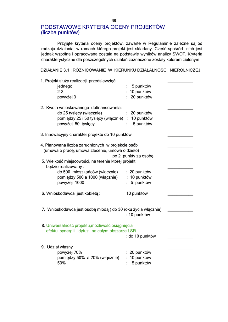 - 69 - PODSTAWOWE KRYTERIA OCENY PROJEKTÓW (liczba punktów) Przyjęte kryteria oceny projektów, zawarte w Regulaminie zależne są od rodzaju działania, w ramach którego projekt jest składany. Część spośród nich jest jednak wspólna i opracowana została na podstawie wyników analizy SWOT. Kryteria charakterystyczne dla poszczególnych działań zaznaczone zostały kolorem zielonym. Działanie 3.1 ; różnicowanie w kierunku działalności nierolniczej 1. Projekt służy realizacji przedsięwzięć: ___________ jednego ; 5 punktów 2-3 : 10 punktów powyżej 3 : 20 punktów 2. Kwota wnioskowanego dofinansowania: ___________ do 25 tysięcy (włącznie) : 20 punktów pomiędzy 25 i 50 tysięcy (włącznie) : 10 punktów powyżej 50 tysięcy : 5 punktów 3. Innowacyjny charakter projektu do 10 punktów ___________ 4. Planowana liczba zarudnionych w projekcie osób (umowa o pracę, umowa zlecenie, umowa o dzieło) po 2 punkty za osobę 5. Wielkość miejscowości, na terenie której projekt będzie realizowany : do 500 mieszkańców (włącznie) : 20 punktów pomiędzy 500 a 1000 (włącznie) : 10 punktów powyżej 1000 : 5 punktów ___________ 6. Wnioskodawca jest kobietą: ___________ 10 punktów ___________ 7. Wnioskodawca jest osobą młodą ( do 30 roku życia włącznie) ___________ : 10 punktów 8. Uniwersalność projektu,możliwość osiągnięcia efektu synergiii i dyfuzji na całym obszarze LSR : do 10 punktów ___________ 9. Udział własny powyżej 70% : 20 punktów pomiędzy 50% a 70% (włącznie) : 10 punktów 50% : 5 punktów ___________ - 70 dZIAŁANIE 3.2: TWORZENIE I ROZWÓJ MIKROPRZEDSIĘBIORSTW 1. Projekt służy realizacji przedsięwzięć: ___________ jednego ; 5 punktów 2-3 : 10 punktów powyżej 3 : 20 punktów 2. Kwota wnioskowanego dofinansowania: ___________ do 50 tysięcy (włącznie) : 20 punktów pomiędzy 50 i 150 tysięcy (włącznie): 10 punktów powyżej 150 tys : 5 punktów 3. Innowacyjny charakter projektu: do 10 punktów ___________ 4. Planowana liczba zatrudnionych w projekcie osób (umowa o pracę, umowa o dzieło, umowa zlecenie) po 2 punkty za osobę 5. Wielkość miejscowości, na terenie której projekt będzie realizowany : do 500 mieszkańców (włącznie) : 20 punktów pomiędzy 500 a 1000 (włącznie) : 10 punktów powyżej 1000 : 5 punktów 6. Wnioskodawca jest kobietą : 10 punktów ___________ ___________ ___________ 7. Wnioskodawca jest osobą młodą ( do 30 roku życia włącznie) ___________ : 10 punktów 8. Utworzenie nowego przedsiębiorstwa w formie : ___________ osoby prawnej : 20 punktów spółki cywilnej lub, spólki pr. handl. osobowej : 15 punktów osoby fizycznej : 10 punktów 9. Rozwój istniejącego przedsiębiorstwa : 5 punktów ___________ 10. Wykorzystanie środków endogenicznych ___________ : do 10 punktów 11. Udział własny powyżej 70% : 20 punktów pomiędzy 50% a 70%(włącznie) : 10 punktów 50% : 5 punktów ___________ - 71 - DZIAŁANIE 3.4: oDNOWA I ROZWÓJ WSI 1. Projekt służy realizacji przedsięwzięć: ___________ jednego ; 5 punktów 2-3 : 10 punktów powyżej 3 : 20 punktów 2. Kwota wnioskowanego dofinansowania: ___________ do 100 tysięcy (włącznie) : 20 punktów pomiędzy 100 i 200 tys. : 10 punktów powyżej 200 tys : 5 punktów 3. Innowacyjny charakter projektu : do 10 punktów ___________ 4. Planowa liczba zatrudnionych wprojkecie osób (umowa o pracę, umowa o dzieło, umowa zlecenie) po 2 punkty za osobę 5. Wielkość miejscowości, na terenie której projekt będzie realizowany : do 500 mieszkańców(włącznie) : 20 punktów pomiędzy 500 a 1000 (włącznie) : 10 punktów powyżej 1000 : 5 punktów ___________ ___________ 6. Udział partnerów w realizacji projektu: powyżej 3 : 20 punktów 2 partnetrów : 10 punktów 1 partner : 5 punktów 7. Uniwersalność projektu,możliwość osiągnięcia efektu synergiii i dyfuzji na całym obszarze LSR : do 10 punktów ___________ 8. Liczba beneficjentów ostatecznych projektu (rocznie) powyżej 500 osób : 20 punktów pomiędzy 100 a 500 (włącznie) : 10 punktów do 100 osób (włącznie) : 5 punktów ___________ 9. Udział własny powyżej 50% : 20 punktów pomiędzy 25% a 50%(włącznie) : 10 punktów 25% : 5 punktów ___________ 10. Realizacja projektu zwiększa atrakcyjność obszaru : : do 10 punktów ___________ ___________ - 72 - DZIAŁANIE 4.1: „MAŁE PROJEKTY” 1. Projekt służy realizacji przedsięwzięć: ___________ jednego ; 5 punktów 2-3 : 10 punktów powyżej 3 : 20 punktów 2. Kwota wnioskowanego dofinansowania: ___________ do 15 tysięcy (włącznie) : 20 punktów pomiędzy 15 i 20 tysięcy(włacznie). : 10 punktów powyżej 20 tys : 5 punktów 3. Innowacyjny charakter projektu : do 10 punktów 4. Planowana liczba zatrudnionych wprojekcie osób (umowa o pracę, umowa o dzieło, umowa zlecenie) po 2 punkty za osobę 5. Wielkość miejscowości, na terenie której projekt będzie realizowany : do 500 mieszkańców(włącznie) : 20 punktów pomiędzy 500 a 1000(włącznie) : 10 punktów powyżej 1000 : 5 punktów ___________ ___________ ___________ 6. Wnioskodawca jest kobietą: : 10 punktów ___________ 7. Wnioskodawca jest osobą młodą ( do 30 roku życia włącznie) ___________ : 10 punktów 8. Udział partnerów w realizacji projektu: ___________ 3 i więcej : 20 punktów 2 partnetrów : 10 punktów 1 partner : 5 punktów 9. Uniwersalność projektu,możliwość osiągnięcia efektu synergiii i dyfuzji na całym obszarze LSR ___________ : do 10 punktów 10. Liczba beneficjentów ostatecznych: powyżej 500 osób między 100 a 500(włącznie) do 100 osób (włącznie) : 20 punktów : 10 punktów : 5 punktów ___________ 11. Udział własny powyżej 50% : 20 punktów pomiędzy 30% a 50%(włącznie) : 10 punktów 30% : 5 punktów ___________ - 73 12. Realizacja projektu przyczyni się pobudzenia aktywności mieszkańców obszaru: ; do 10 punktow ___________ Uzasadniene przyjętych kryteriów : Stwierdzona charaktery