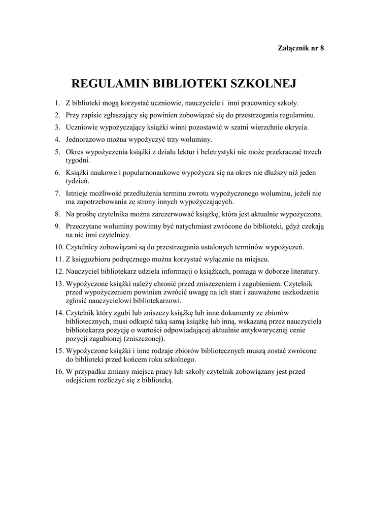 Załącznik nr 8 REGULAMIN BIBLIOTEKI SZKOLNEJ 1. Z biblioteki mogą korzystać uczniowie, nauczyciele i inni pracownicy szkoły. 2. Przy zapisie zgłaszający się powinien zobowiązać się do przestrzegania regulaminu. 3. Uczniowie wypożyczający książki winni pozostawić w szatni wierzchnie okrycia. 4. Jednorazowo można wypożyczyć trzy woluminy. 5. Okres wypożyczenia książki z działu lektur i beletrystyki nie może przekraczać trzech tygodni. 6. Książki naukowe i popularnonaukowe wypożycza się na okres nie dłuższy niż jeden tydzień. 7. Istnieje możliwość przedłużenia terminu zwrotu wypożyczonego woluminu, jeżeli nie ma zapotrzebowania ze strony innych wypożyczających. 8. Na prośbę czytelnika można zarezerwować książkę, która jest aktualnie wypożyczona. 9. Przeczytane woluminy powinny być natychmiast zwrócone do biblioteki, gdyż czekają na nie inni czytelnicy. 10. Czytelnicy zobowiązani są do przestrzegania ustalonych terminów wypożyczeń. 11. Z księgozbioru podręcznego można korzystać wyłącznie na miejscu. 12. Nauczyciel bibliotekarz udziela informacji o książkach, pomaga w doborze literatury. 13. Wypożyczone książki należy chronić przed zniszczeniem i zagubieniem. Czytelnik przed wypożyczeniem powinien zwrócić uwagę na ich stan i zauważone uszkodzenia zgłosić nauczycielowi bibliotekarzowi. 14. Czytelnik który zgubi lub zniszczy książkę lub inne dokumenty ze zbiorów bibliotecznych, musi odkupić taką samą książkę lub inną, wskazaną przez nauczyciela bibliotekarza pozycję o wartości odpowiadającej aktualnie antykwarycznej cenie pozycji zagubionej (zniszczonej). 15. Wypożyczone książki i inne rodzaje zbiorów bibliotecznych muszą zostać zwrócone do biblioteki przed końcem roku szkolnego. 16. W przypadku zmiany miejsca pracy lub szkoły czytelnik zobowiązany jest przed odejściem rozliczyć się z biblioteką.