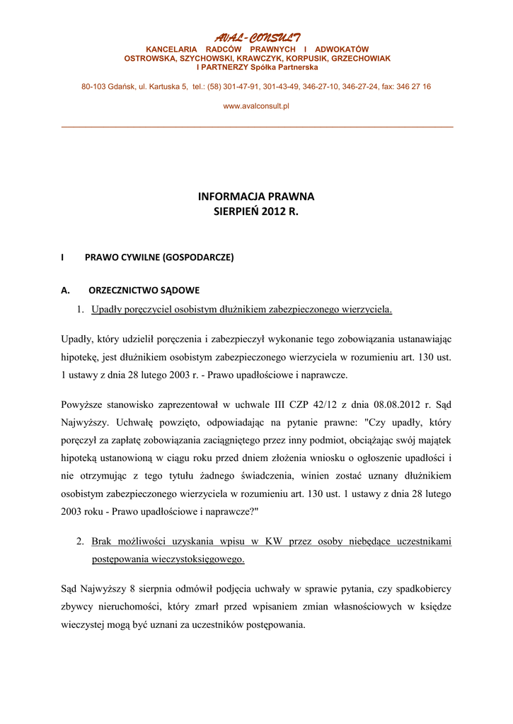 AVAL-CONSULT KANCELARIA RADCÓW PRAWNYCH I ADWOKATÓW OSTROWSKA, SZYCHOWSKI, KRAWCZYK, KORPUSIK, GRZECHOWIAK I PARTNERZY Spółka Partnerska 80-103 Gdańsk, ul. Kartuska 5, tel.: (58) 301-47-91, 301-43-49, 346-27-10, 346-27-24, fax: 346 27 16 www.avalconsult.pl _________________________________________________________________ INFORMACJA PRAWNA SIERPIEŃ 2012 R. I A. PRAWO CYWILNE (GOSPODARCZE) ORZECZNICTWO SĄDOWE 1. Upadły poręczyciel osobistym dłużnikiem zabezpieczonego wierzyciela. Upadły, który udzielił poręczenia i zabezpieczył wykonanie tego zobowiązania ustanawiając hipotekę, jest dłużnikiem osobistym zabezpieczonego wierzyciela w rozumieniu art. 130 ust. 1 ustawy z dnia 28 lutego 2003 r. - Prawo upadłościowe i naprawcze. Powyższe stanowisko zaprezentował w uchwale III CZP 42/12 z dnia 08.08.2012 r. Sąd Najwyższy. Uchwałę powzięto, odpowiadając na pytanie prawne: "Czy upadły, który poręczył za zapłatę zobowiązania zaciągniętego przez inny podmiot, obciążając swój majątek hipoteką ustanowioną w ciągu roku przed dniem złożenia wniosku o ogłoszenie upadłości i nie otrzymując z tego tytułu żadnego świadczenia, winien zostać uznany dłużnikiem osobistym zabezpieczonego wierzyciela w rozumieniu art. 130 ust. 1 ustawy z dnia 28 lutego 2003 roku - Prawo upadłościowe i naprawcze?" 2. Brak możliwości uzyskania wpisu w KW przez osoby niebędące uczestnikami postępowania wieczystoksięgowego. Sąd Najwyższy 8 sierpnia odmówił podjęcia uchwały w sprawie pytania, czy spadkobiercy zbywcy nieruchomości, który zmarł przed wpisaniem zmian własnościowych w księdze wieczystej mogą być uznani za uczestników postępowania. AVAL-CONSULT KANCELARIA RADCÓW PRAWNYCH I ADWOKATÓW OSTROWSKA, SZYCHOWSKI, KRAWCZYK, KORPUSIK, GRZECHOWIAK I PARTNERZY Spółka Partnerska 80-103 Gdańsk, ul. Kartuska 5, tel.: (58) 301-47-91, 301-43-49, 346-27-10, 346-27-24, fax: 346 27 16 www.avalconsult.pl _________________________________________________________________ Zdaniem Sądu Najwyższego, pytania zadanego przez Sąd Okręgowy we Wrocławiu nie można uznać za istotne i budzące poważne wątpliwości. Przedmiotowa kwestia powstała na kanwie następującej sprawy. Sąd Rejonowy odrzucił wniosek Gabrieli S. o wpis w księdze wieczystej prawa własności na jej rzecz. W uzasadnieniu sąd ten wskazał, iż księga wieczysta prowadzona jest dla samoistnego lokalu mieszkalnego położonego we W. przy ul. M. Właścicielem nieruchomości według stanu ujawnionego w tej księdze jest Ludwika S. Wnioskodawczyni wskazała, iż uczestniczka postępowania Ludwika S. zmarła w dniu 26 marca 2011 r. Sąd Rejonowy powołując się na treść art. 199 § 1 pkt 3 k.p.c. odrzucił wniosek uznając, iż brak zdolności sądowej którejkolwiek ze stron stanowi bezwzględną ujemną przesłankę procesową. Wskazał również na art. 64 § 1 k.p.c. i art. 8 k.c., który stanowi, iż osoba fizyczna posiada zdolność prawną określoną jako zdolność do występowania w charakterze strony, od chwili urodzenia do chwili śmierci. Skoro zaś uczestniczka postępowania Ludwika S. zmarła w dniu 26 marca 2011 r. nie miała zdolności sądowej w dacie złożenia wniosku o wpis w dniu 16 maja 2011 r. Zażalenie na powyższe postanowienie złożyła wnioskodawczyni, zaskarżając je w całości i wnosząc o jego zmianę poprzez dokonanie wpisu zgodnie z wnioskiem lub uchylenie zaskarżonego postanowienia. Orzeczeniu temu wnioskodawczyni zarzuciła naruszenie przepisów postępowania mające istotny wpływ na treść wydanego orzeczenia. Zdaniem SN, art. 6261 § 2 k.p.c. został wyjaśniony w orzecznictwie dość dogłębnie. Wystarczy wymienić choćby wyrok SN z 16 czerwca 2004 r. , który stwierdził, że art. 626 1 § 2 k.p.c., jako przepis szczególny w stosunku do art. 510 k.p.c., reguluje wyczerpująco krąg uczestników postępowania wieczysto-księgowego ( sygn. akt I CZ 48/04). Zgodnie z nim uczestnikami postępowania oprócz wnioskodawcy są tylko te osoby, których prawa zostały wykreślone lub obciążone bądź na rzecz których wpis ma nastąpić. A zatem nie jest uczestnikiem postępowania wieczysto-księgowego osoba, która jedną z tych osób nie jest. Nie AVAL-CONSULT KANCELARIA RADCÓW PRAWNYCH I ADWOKATÓW OSTROWSKA, SZYCHOWSKI, KRAWCZYK, KORPUSIK, GRZECHOWIAK I PARTNERZY Spółka Partnerska 80-103 Gdańsk, ul. Kartuska 5, tel.: (58) 301-47-91, 301-43-49, 346-27-10, 346-27-24, fax: 346 27 16 www.avalconsult.pl _________________________________________________________________ możliwe jest wiec odrzucenie wniosku o wpis do księgi wieczystej spadkobiercy, który jest uczestnikiem postępowania. B. CIEKAWOSTKI PRAWNE 1. Czy kłamstwo na temat własnego majątku będzie ścigane karnie? Zgodnie z założeniami Ministerstwa Sprawiedliwości, by przepis dotyczący wyjaśnień składanych przez dłużnika co do własnego majątku był zaopatrzony w sankcję odpowiedzialności karnej za składanie fałszywych wyjaśnień. Odmowa składania wyjaśnień zostanie ukarana grzywną. Według obecnie obowiązujących przepisów komornik ma prawo wezwać dłużnika do składania wyjaśnień dotyczących posiadanego przez niego majątku. Przepis ten nie jest jednak skuteczny, ponieważ nie wprowadza sankcji za uchybienie temu obowiązkowi. Zmienić ma to nowelizacja kodeksu postępowania cywilnego, którą planuje resort sprawiedliwości. Zdaniem pomysłodawców nowelizacji złożenie fałszywych wyjaśnień powinno skutkować dla dłużnika odpowiedzialnością karną z art. 233 kodeksu karnego. Negatywne skutki dla dłużnika pociągać ma za sobą także składanie wyjaśnień niepełnych. Komornik pouczy dłużnika, że w razie nieujawnienia majątku, poszukiwanie jego składników będzie odbywać się na koszt dłużnika. Niezależnie od odpowiedzialności karnej, dłużnik zapłaci grzywnę za składanie niepełnych lub fałszywych wyjaśnień. Nałoży ją kom