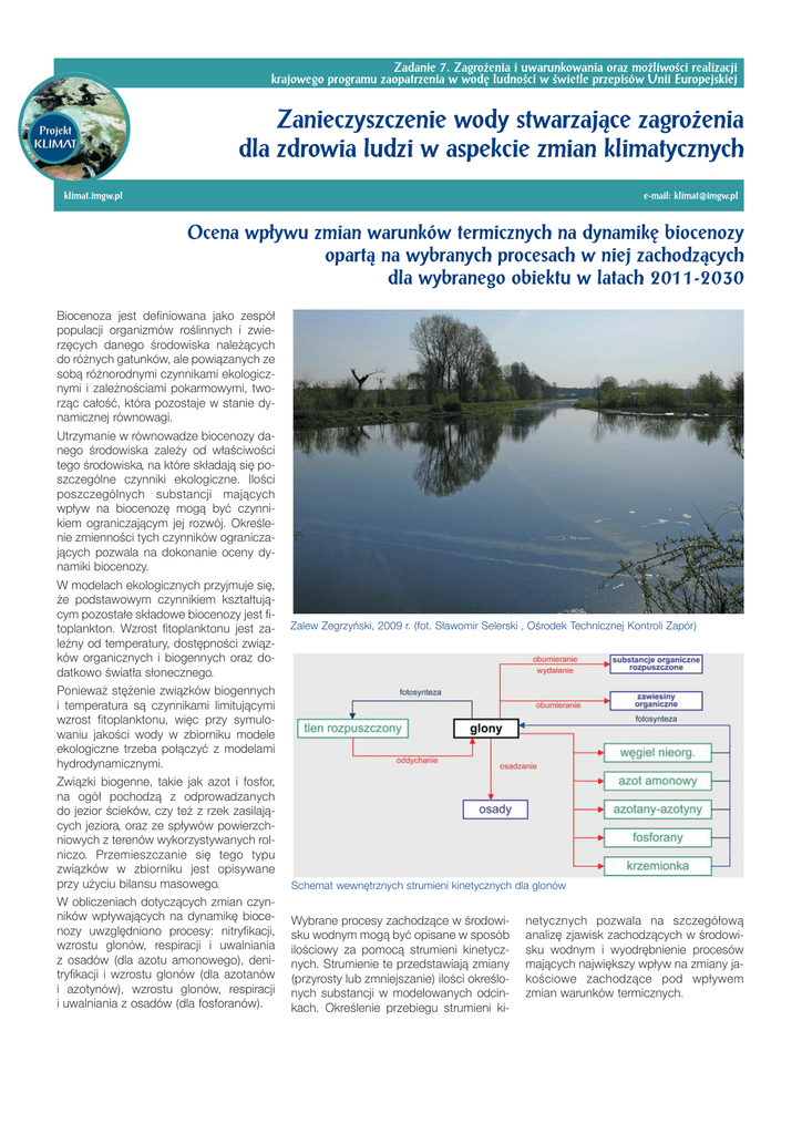 Zadanie 7. Zagrożenia i uwarunkowania oraz możliwości realizacji krajowego programu zaopatrzenia w wodę ludności w świetle przepisów Unii Europejskiej Zanieczyszczenie wody stwarzające zagrożenia dla zdrowia ludzi w aspekcie zmian klimatycznych klimat.imgw.pl e-mail: [email protected] Ocena wpływu zmian warunków termicznych na dynamikę biocenozy opartą na wybranych procesach w niej zachodzących dla wybranego obiektu w latach 2011-2030 Biocenoza jest definiowana jako zespół populacji organizmów roślinnych i zwierzęcych danego środowiska należących do różnych gatunków, ale powiązanych ze sobą różnorodnymi czynnikami ekologicznymi i zależnościami pokarmowymi, tworząc całość, która pozostaje w stanie dynamicznej równowagi. Utrzymanie w równowadze biocenozy danego środowiska zależy od właściwości tego środowiska, na które składają się poszczególne czynniki ekologiczne. Ilości poszczególnych substancji mających wpływ na biocenozę mogą być czynnikiem ograniczającym jej rozwój. Określenie zmienności tych czynników ograniczających pozwala na dokonanie oceny dynamiki biocenozy. W modelach ekologicznych przyjmuje się, że podstawowym czynnikiem kształtującym pozostałe składowe biocenozy jest fitoplankton. Wzrost fitoplanktonu jest zależny od temperatury, dostępności związków organicznych i biogennych oraz dodatkowo światła słonecznego. Zalew Zegrzyński, 2009 r. (fot. Sławomir Selerski , Ośrodek Technicznej Kontroli Zapór) Ponieważ stężenie związków biogennych i temperatura są czynnikami limitującymi wzrost fitoplanktonu, więc przy symulowaniu jakości wody w zbiorniku modele ekologiczne trzeba połączyć z modelami hydrodynamicznymi. Związki biogenne, takie jak azot i fosfor, na ogół pochodzą z odprowadzanych do jezior ścieków, czy też z rzek zasilających jeziora, oraz ze spływów powierzchniowych z terenów wykorzystywanych rolniczo. Przemieszczanie się tego typu związków w zbiorniku jest opisywane przy użyciu bilansu masowego. Schemat wewnętrznych strumieni kinetycznych dla glonów W obliczeniach dotyczących zmian czynników wpływających na dynamikę biocenozy uwzględniono procesy: nitryfikacji, wzrostu glonów, respiracji i uwalniania z osadów (dla azotu amonowego), denitryfikacji i wzrostu glonów (dla azotanów i azotynów), wzrostu glonów, respiracji i uwalniania z osadów (dla fosforanów). Wybrane procesy zachodzące w środowisku wodnym mogą być opisane w sposób ilościowy za pomocą strumieni kinetycznych. Strumienie te przedstawiają zmiany (przyrosty lub zmniejszanie) ilości określonych substancji w modelowanych odcinkach. Określenie przebiegu strumieni ki- netycznych pozwala na szczegółową analizę zjawisk zachodzących w środowisku wodnym i wyodrębnienie procesów mających największy wpływ na zmiany jakościowe zachodzące pod wpływem zmian warunków termicznych. Zadanie 7. Zagrożenia i uwarunkowania oraz możliwości realizacji krajowego programu zaopatrzenia w wodę ludności w świetle przepisów Unii Europejskiej Zanieczyszczenie wody stwarzające zagrożenia dla zdrowia ludzi w aspekcie zmian klimatycznych klimat.imgw.pl e-mail: [email protected] Ocena wpływu zmian warunków termicznych na dynamikę biocenozy opartą na wybranych procesach w niej zachodzących dla wybranego obiektu w latach 2011-2030 Za pomocą modelu matematycznego wykonano obliczenia symulacyjne dla obiektu badawczego: Zbiornik Zegrzyński (odcinki obliczeniowe „Zbiornik”, „Bug” i „Narew”) i scenariuszy klimatycznych opartych na trzech scenariuszach emisyjnych (A1B, A2 i B1) w okresie 2011-2030. W przeprowadzonych pracach uwzględniono procesy: nitryfikacji, wzrostu glonów, respiracji i uwalniania z osadów (dla azotu amonowego), denitryfikacji i wzrostu glonów (dla azotanów i azotynów), wzrostu glonów, respiracji i uwalniania z osadów (dla fosforanów). Do porównań wyników przyjęto wartości miesięcznych przyrostów funkcji trendu strumieni kinetycznych, które opisują wielkość zmian ilości określonych substancji w całym okresie obliczeniowym. Obliczenia wykazały generalną tendencję do wzrostu ilości azotu amonowego zużywanego w procesów nitryfikacji w rozpatrywanym okresie. Ilościowo tendencja ta jest najwyraźniejsza dla scenariusza A1B. W przypadku wykorzystania azotu amonowego w procesie wzrostu glonów można stwierdzić generalną tendencję do spadku jego ilości we wszystkich odcinkach obliczeniowych w rozpatrywanym okresie. Ilościowo tendencja ta jest najwyraźniejsza dla scenariusza B1. Obserwuje się również główną tendencję do spadku ilości azotu amonowego uwalnianego na skutek procesów respiracji w wodach wszystkich odcinków obliczeniowych w rozpatrywanym okresie. Ilościowo tendencja ta jest najwyraźniejsza w przypadku scenariusza B1. W rozpatrywanym okresie dla azotanów i azotynów zużywanych w procesie denitryfikacji dla scenariuszy A1B i A2 występuje generalna tendencja wzrostowa, natomiast w przypadku scenariusza B1 obserwuje się tendencję spadkową. Ilościowo tendencja ta jest najwyraźniejsza dla scenariusza A1B. W przypadku wykorzystania azotanów i azotynów w procesie wzrostu glonów można stwierdzić generalną tendencję do spadku ich ilości we wszystkich odcinkach obliczeniowych w rozpatrywanym okresie. Ilościowo tendencja ta jest najwyraźniejsza dla scenariusza B1. Obliczenia wykazały generalną tendencję do spadku ilości fosforanów wykorzystywanych w procesach wzrostu glonów we wszystkich obiektach badawczych w rozpatrywanym okresie. Ilościowo tendencja ta jest najwyraźniejsza dla scenariusza B1. Obserwuje się również generalną tendencję do spadku ilości fosforanów uwalnianych na skutek procesów respira- Przyrosty funkcji linii trendów strumieni kinetycznych azot amonowy – wzrost glonów (kg/miesiąc)