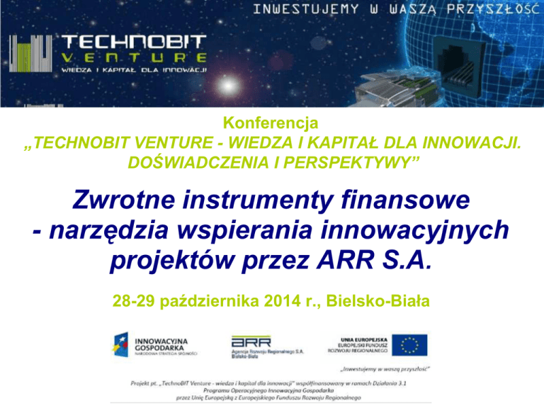 Konferencja „TECHNOBIT VENTURE - WIEDZA I KAPITAŁ DLA INNOWACJI. DOŚWIADCZENIA I PERSPEKTYWY” Zwrotne instrumenty finansowe - narzędzia wspierania innowacyjnych projektów przez ARR S.A. 28-29 października 2014 r., Bielsko-Biała Plan prezentacji: 1. Działalność ARR S.A. - wczoraj/dziś. 2. Zasady funkcjonowania: – Fundusz Zalążkowy Beskidzkiego Akceleratora Technologicznego, – Beskidzka Sieć Aniołów Biznesu. 3. STARTER i BizNest - inicjatywy nowej perspektywy finansowej 2014-2020. 1. Działalność ARR S.A. do roku 2013: - promocja i wsparcie rozwoju potencjału gospodarczego regionu, - wsparcie rozwoju nowych przedsiębiorstw poprzez inwestycje kapitałowe, usługi doradcze i proinnowacyjne, – ogólne, specjalistyczne - usługi szkoleniowe, działalność związana pozyskiwaniem finansowych z UE, w tym dla MSP środków - pozyskiwanie, zarządzanie i obrót nieruchomościami. Dzisiaj jest wczorajszym jutrem... Strategia Rozwoju Agencji Rozwoju Regionalnego S.A. na lata 2014-2020 2. Zasady funkcjonowania: – Fundusz Zalążkowy Beskidzkiego Akceleratora Technologicznego, – Beskidzka Sieć Aniołów Biznesu. Fundusz Zalążkowy Beskidzkiego Akceleratora Technologicznego Fundusz Zalążkowy Beskidzkiego Akceleratora Technologicznego: - utworzenie: styczeń 2014 r. - budżet: uzależniony od zwrotów z inwestycji w okresie 2014 – 2022, bez ograniczeń czasowych - okres inwestycji: do 10 lat - dziedziny zainteresowań: IT/ICT, medycyna, przemysł metalowy, ochrona środowiska (w tym OZE), turystyka, meblarstwo, poligrafia, tworzywa sztuczne, elektronika i automatyka oraz pozostałe (wyj. branże wykluczone z pomocy de minimis) Zespół Beskidzkiego Akceleratora Technologicznego: Dyrektor BAT Brokerzy technologiczni Analitycy finansowi Eksperci (wewnętrzni) Etapy współpracy z Pomysłodawcami w ramach BAT: I. Ocena zgłoszonego pomysłu. II. Preinkubacja pomysłu. III. Wejście kapitałowe. IV. Zawiązanie nowej spółki, współpraca i monitoring. V. Wyjście kapitałowe. I. Ocena zgłoszonego pomysłu Etapy oceny pomysłu dotychczasowo: Etapy oceny pomysłu aktualnie: II. Preinkubacja a) obowiązki Inwestora: - udostępnienie Pomysłodawcy nieodpłatnie pomieszczenia wraz z wyposażeniem biurowym w BIT na potrzeby preinkubacji, - przeprowadzenie analiz eksperckich dot. Pomysłu, przestrzeganie zasady poufności -w przypadku pozytywnej oceny pomysłu i podjęciu decyzji o rozpoczęciu etapu inwestycyjnego, przystąpienie do negocjacji i zawarcie umowy inwestycyjnej z Pomysłodawcą, b) obowiązki Pomysłodawcy: - pełna współpraca przy opracowywaniu analiz eksperckich, - w przypadku pozytywnej oceny pomysłu i podjęciu decyzji o zakwalifikowaniu pomysłu do etapu inwestycyjnego, przystąpienie do negocjacji i zawarcie umowy inwestycyjnej z ARR S.A. - złożenie weksla in-blanco jako zabezpieczenia realizacji umowy o preinkubację, - przestrzeganie zasady poufności. Etapy preinkubacji pomysłu: Po zakończeniu preinkubacji: - negocjacje i zawarcie umowy inwestycyjnej - poddanie pomysłu opiniom a) Zarządu ARR S.A., b) Rady Nadzorczej ARR S.A. c) Rady Programowej BIT. - opcjonalnie - przekazanie wyników preinkubacji do Polskiej Agencji Rozwoju Przedsiębiorczości, celem uzyskania zgody na utworzenie nowego podmiotu (w zależności od wytycznych PARP). Umowa inwestycyjna określać będzie: wzajemne prawa i obowiązki stron które zamierzają utworzyć spółkę kapitałową powstałą na bazie Pomysłu, - warunki obejmowania akcji lub udziałów, - warunki i sposoby wyjścia z dokonanych inwestycji, okres inwestycji, - warunki podziału środków po wyjściu z inwestycji. III. Wejście kapitałowe: – utworzenie nowej spółki na bazie innowacyjnego Pomysłu i objęcie/nabycie udziałów/akcji w wysokości niższej niż 50% kapitału spółki – zaangażowanie ze strony ARR S.A. maksymalnie do 200 tys. euro, stanowiące pomoc de minimis, o której mowa w Rozporządzeniu Komisji (UE) NR 1407/2013 z dnia 18 grudnia 2013 r. w sprawie stosowania art. 107 i 108 Traktatu o funkcjonowaniu Unii Europejskiej do pomocy de minimis. IV. Zawiązanie nowej spółki, współpraca i monitoring: - realizacja Pomysłu w oparciu o opracowany wspólnie biznes plan, - cykliczna sprawozdawczość finansowa i merytoryczna, - wspólne zarządzanie spółką. Zaangażowanie ARR S.A. w zarządzanie spółkami obejmuje III modele: Wspólny Zarząd Spółki Spółka Zarząd i Prokurent Wspólna Rada Nadzorcza V. Wyjście kapitałowe ARR S.A.: - nie później niż po 10 latach od przeprowadzenia inwestycji (w zależności od specyfiki branżowej) - środki ze zwrotów z inwestycji powrócą do Beskidzkiego Akceleratora Technologicznego z przeznaczeniem na kolejne inwestycje w innowacyjne rozwiązania. Dopuszczalne przez ARR S.A. formy wyjścia z inwestycji: 2. Zasady funkcjonowania: – Fundusz Zalążkowy Beskidzkiego Akceleratora Technologicznego, – Beskidzka Sieć Aniołów Biznesu. Beskidzka Sieć Aniołów Biznesu Organ zarządzający: Beskidzka Sieć Aniołów Biznesu TechnoBIT Venture Sp. z o.o. przy wsparciu ARR S.A. Lokalizacja: Bielsko-Biała Aktualnie prowadzone działania: - tworzenie bazy Aniołów Biznesu, - aktywne poszukiwanie ciekawych pomysłów do inwestycji, - współpraca z ARR S.A. w obrębie wyboru i oceny pomysłów biznesowych (docelowo planowane są także wspólne inwestycje). Cele utworzenia Beskidzkiej Sieci Aniołów Biznesu: a) ułatwienie inwestorom prywatnym dokonywania inwestycji w firmy z sektora MSP, b) zwiększenie dostępu do zewnętrznych źródeł finansowania dla przedsiębiorców, c) stworzenie wirtualnej platformy oraz modelu współpracy do kojarzenia Aniołów Biznesu z przedsiębiorcami, d) propagowanie wiedzy i poszerzanie świadomości o korzyściach i usługach oferowanych przez BSAB, poprzez działania informacyjne i edukacyjne. Beskidzka Sieć Aniołów Biznesu w kooperacji z ARR S.A. a) korzyści dla ARR S.A.: – współpraca z B