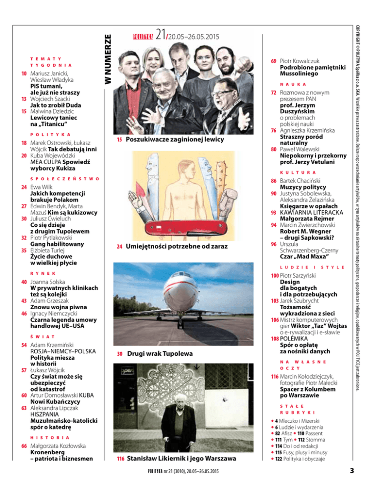 P O L I T Y K A 18 Marek Ostrowski, Łukasz Wójcik Tak debatują inni 20 Kuba Wojewódzki MEA CULPA Spowiedź wyborcy Kukiza W NUMERZE 10 Mariusz Janicki, Wiesław Władyka PiS tumani, ale już nie straszy 13 Wojciech Szacki Jak to zrobił Duda 15 Malwina Dziedzic Lewicowy taniec na „Titanicu” 69 Piotr Kowalczuk Podrobione pamiętniki Mussoliniego N A U K A 15 Poszukiwacze zaginionej lewicy 24 Umiejętności potrzebne od zaraz 40 Joanna Solska W prywatnych klinikach też są kolejki 43 Adam Grzeszak Znowu wojna piwna 46 Ignacy Niemczycki Czarna legenda umowy handlowej UE–USA Ś W I A T 30 Drugi wrak Tupolewa I S T Y L E 100 Piotr Sarzyński Design dla bogatych i dla potrzebujących 103 Jarek Szubrycht Tożsamość wykradziona z sieci 106 Mistrz komputerowych gier Wiktor „Taz” Wojtas o e-rywalizacji i e-sławie 108 POLEMIKA Spór o opłatę za nośniki danych N A W Ł A S N E O C Z Y 116 Marcin Kołodziejczyk, fotografie Piotr Małecki Spacer z Kolumbem po Warszawie S T A Ł E R U B R Y K I H I S T O R I A 66 Małgorzata Kozłowska Kronenberg – patriota i biznesmen 86 Bartek Chaciński Muzycy politycy 90 Justyna Sobolewska, Aleksandra Żelazińska Księgarze w opałach 93 KAWIARNIA LITERACKA Małgorzata Rejmer 94 Marcin Zwierzchowski Robert M. Wegner – drugi Sapkowski? 96 Urszula Schwarzenberg-Czerny Czar „Mad Maxa” L U D Z I E R Y N E K 54 Adam Krzemiński ROSJA–NIEMCY–POLSKA Polityka miesza w historii 57 Łukasz Wójcik Czy świat może się ubezpieczyć od katastrof 60 Artur Domosławski KUBA Nowi Kubańczycy 63 Aleksandra Lipczak HISZPANIA Muzułmańsko-katolicki spór o katedrę 72 Rozmowa z nowym prezesem PAN prof. Jerzym Duszyńskim o problemach polskiej nauki 76 Agnieszka Krzemińska Straszny poród naturalny 80 Paweł Walewski Niepokorny i przekorny prof. Jerzy Vetulani K U L T U R A S P O Ł E C Z E Ń S T W O 24 Ewa Wilk Jakich kompetencji brakuje Polakom 27 Edwin Bendyk, Marta Mazuś Kim są kukizowcy 30 Juliusz Ćwieluch Co się dzieje z drugim Tupolewem 32 Piotr Pytlakowski Gang habilitowany 35 Elżbieta Turlej Życie duchowe w wielkiej płycie COPYRIGHT © POLITYKA Spółka z o.o. SKA. Wszelkie prawa zastrzeżone. Dalsze rozpowszechnianie artykułów, w tym artykułów na aktualne tematy polityczne, gospodarcze i religijne, opublikowanych w POLITYCE jest zabronione. T E M A T Y T Y G O D N I A 21/20.05–26.05.2015 116 Stanisław Likiernik i jego Warszawa P OL I T Y K A nr 21 (3010), 20.05–26.05.2015 • 4 Mleczko i Mizerski • 6 Ludzie i wydarzenia • 82 Afisz • 110 Passent • 111 Tym • 112 Stomma • 114 Do i od redakcji • 115 Fusy, plusy i minusy • 122 Polityka i obyczaje 3