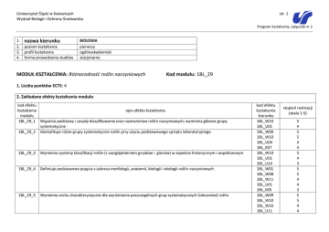 Uniwersytet Śląski w Katowicach Wydział Biologii i Ochrony Środowiska str. 1 Program kształcenia, załącznik nr 2 1. 2. 3. 4. nazwa kierunku poziom kształcenia profil kształcenia forma prowadzenia studiów BIOLOGIA pierwszy ogólnoakademicki stacjonarne MODUŁ KSZTAŁCENIA: Różnorodność roślin naczyniowych Kod modułu: 1BL_29 1. Liczba punktów ECTS: 4 2. Zakładane efekty kształcenia modułu kod efektu kształcenia opis efektu kształcenia modułu 1BL_29_1 Wyjaśnia podstawy i zasady klasyfikowania oraz nazewnictwa roślin naczyniowych; wymienia główne grupy systematyczne 1BL_29_2 Identyfikuje różne grupy systematyczne roślin przy użyciu podstawowego sprzętu laboratoryjnego 1BL_29_3 Wymienia systemy klasyfikacji roślin (z uwzględnieniem grzybów i glonów) w aspekcie historycznym i współczesnym 1BL_29_4 Definiuje podstawowe pojęcia z zakresu morfologii, anatomii, biologii i ekologii roślin naczyniowych 1BL_29_5 Wymienia cechy charakterystyczne dla wyróżniania poszczególnych grup systematycznych (taksonów) roślin kod efektu kształcenia kierunku 1BL_W10 1BL_U01 1BL_W09 1BL_W10 1BL_U04 1BL_K07 1BL_W10 1BL_U01 1BL_U14 1BL_W01 1BL_W08 1BL_W11 1BL_U01 1BL_K05 1BL_W09 1BL_W10 1BL_W16 1BL_U11 stopień realizacji (skala 1-5) 5 4 5 5 4 4 5 4 3 5 5 4 4 3 5 5 4 4 Uniwersytet Śląski w Katowicach Wydział Biologii i Ochrony Środowiska str. 2 Program kształcenia, załącznik nr 2 1BL_29_6 Wyjaśnia podstawowe tendencje ewolucyjne w świecie roślin 1BL_W12 1BL_U08 1BL_K08 5 4 3 3. Opis modułu Opis Wymagania wstępne modułu Moduł „Różnorodność roślin naczyniowych” wyjaśnia i przybliża rolę i zadania systematyki roślin na tle historycznego rozwoju systemów roślinnych. Omawiane są kryteria podziału systematycznego świata roślin. Dokonany jest przegląd zróżnicowania gromad i klas mszaków, paprotników i roślin nasiennych wraz z przybliżeniem zagadnień cykli rozwojowych, filogenezy i tendencji ewolucyjnych w obrębie świata roślin. Znajomość podstaw botaniki (poziom licealny, poziom licealny rozszerzony) 4. Sposoby weryfikacji efektów kształcenia modułu kod nazwa (typ) sposobu weryfikacji 1BL_29_w_1 kolokwium 1BL_29_w_2 Ocena ciągła 1BL_29_w_3 egzamin opis szczegółowy Sprawdziany (kolokwia) obejmujące treści z zajęć laboratoryjnych. Skala ocen 2-5 Ocenie podlega poprawność przygotowania sprawozdania z zadań realizowanych w trakcie laboratorium. Weryfikowane są umiejętności dokonania identyfikacji , charakterystyki i klasyfikowania w systemie poznawanych przedstawicieli i taksonów , do których zostały zaklasyfikowane. Egzamin końcowy obejmujący treści wykładów i zajęć laboratoryjnych efekt(-y) kształcenia modułu 1BL_29_1, 1BL_29_2, 1BL_29_4, 1BL_29_5 1BL_29_1, 1BL_29_2, 1BL_29_4, 1BL_29_5, 1BL_29_6 1BL_29_1, 1BL_29_2, 1BL_29_3, 1BL_29_4, 1BL_29_5, 1BL_29_6 Uniwersytet Śląski w Katowicach Wydział Biologii i Ochrony Środowiska str. 3 Program kształcenia, załącznik nr 2 5. Formy prowadzenia zajęć forma prowadzenia zajęć nazwa 1BL_29_fs_1 wykład 1BL_29_fs_2 laboratorium (ćwiczenia) opis (z uwzględnieniem metod dydaktycznych) wykład z wykorzystaniem prezentacji multimedialnych praca w grupie pod nadzorem prowadzącego, praca samodzielna: - rozpoznawanie cech kluczowych dla omawianych grup systematycznych roślin - praktyczne wykorzystanie wiedzy teoretycznej w identyfikacji specyficznych procesów biologicznych oraz organów roślin suma godzin: praca własna studenta liczba godzin 10 50 60 opis utrwalenie i poszerzenie treści wykładu, praca z zalecaną w sylabusie literaturą przedmiotu - przygotowanie do zajęć (przegląd materiałów i literatury wskazanych przez prowadzącego) - opanowanie treści prezentowanych w trakcie zajęć - przygotowanie do sprawdzianów egzekwujących posiadaną wiedzę suma godzin: liczba godzin 15 45 60 sposób weryfikacji efektów kształcenia punkty ECTS 1BL_29_w_3 1 1BL_29_w_1 1BL_29_w_2 3 suma punktów: 4