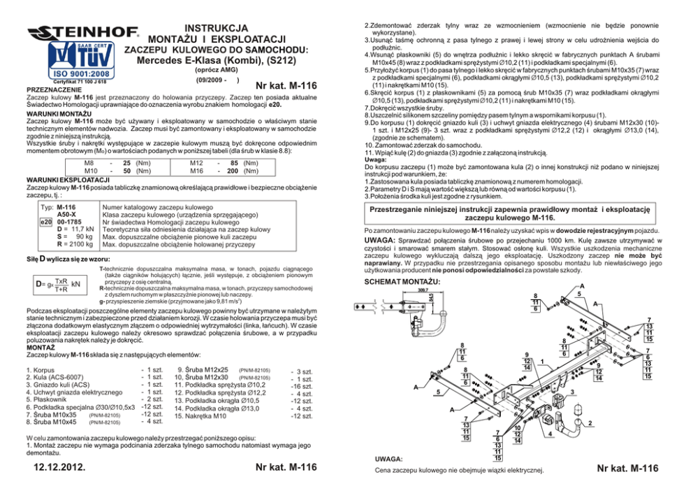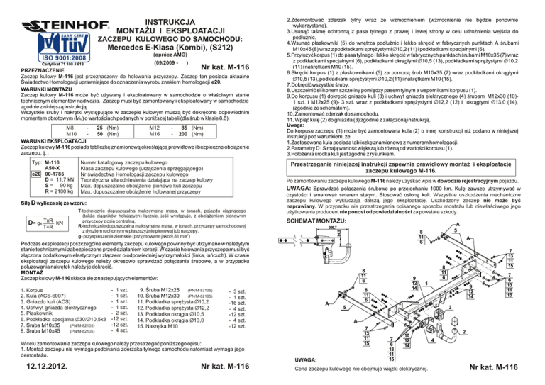 INSTRUKCJA MONTA¯U I EKSPLOATACJI ZACZEPU KULOWEGO DO SAMOCHODU: Mercedes E-Klasa (Kombi), (S212) (oprócz AMG) (09/2009 - ®) Certyfikat 71 100 J 618 Nr kat. M-116 PRZEZNACZENIE Zaczep kulowy M-116 jest przeznaczony do holowania przyczepy. Zaczep ten posiada aktualne Œwiadectwo Homologacji uprawniaj¹ce do oznaczenia wyrobu znakiem homologacji e20. WARUNKI MONTA¯U Zaczep kulowy M-116 mo¿e byæ u¿ywany i eksploatowany w samochodzie o w³aœciwym stanie technicznym elementów nadwozia. Zaczep musi byæ zamontowany i eksploatowany w samochodzie zgodnie z niniejsz¹ instrukcj¹. Wszystkie œruby i nakrêtki wystêpuj¹ce w zaczepie kulowym musz¹ byæ dokrêcone odpowiednim momentem obrotowym (Mo) o wartoœciach podanych w poni¿szej tabeli (dla œrub w klasie 8.8): M8 25 (Nm) M12 85 (Nm) M10 50 (Nm) M16 - 200 (Nm) WARUNKI EKSPLOATACJI Zaczep kulowy M-116 posiada tabliczkê znamionow¹ okreœlaj¹c¹ prawid³owe i bezpieczne obci¹¿enie zaczepu, tj. : Numer katalogowy zaczepu kulowego Klasa zaczepu kulowego (urz¹dzenia sprzêgaj¹cego) Nr œwiadectwa Homologacji zaczepu kulowego Teoretyczna si³a odniesienia dzia³aj¹ca na zaczep kulowy Max. dopuszczalne obci¹¿enie pionowe kuli zaczepu Max. dopuszczalne obci¹¿enie holowanej przyczepy T+R Do korpusu zaczepu (1) mo¿e byæ zamontowana kula (2) o innej konstrukcji ni¿ podano w niniejszej instrukcji pod warunkiem, ¿e: 1.Zastosowana kula posiada tabliczkê znamionow¹ z numerem homologacji. 2.Parametry D i S maj¹ wartoœæ wiêksz¹ lub równ¹ od wartoœci korpusu (1). 3.Po³o¿enia œrodka kuli jest zgodne z rysunkiem. Przestrzeganie niniejszej instrukcji zapewnia prawid³owy monta¿ i eksploatacjê zaczepu kulowego M-116. Po zamontowaniu zaczepu kulowego M-116 nale¿y uzyskaæ wpis w dowodzie rejestracyjnym pojazdu. UWAGA: Sprawdzaæ po³¹czenia œrubowe po przejechaniu 1000 km. Kulê zawsze utrzymywaæ w Si³ê D wylicza siê ze wzoru: D= gx TxR kN Uwaga: T-technicznie dopuszczalna maksymalna masa, w tonach, pojazdu ci¹gn¹cego (tak¿e ci¹gników holuj¹cych) ³¹cznie, jeœli wystêpuje, z obci¹¿eniem pionowym przyczepy z osiê centraln¹. R-technicznie dopuszczalna maksymalna masa, w tonach, przyczepy samochodowej z dyszlem ruchomym w p³aszczyŸnie pionowej lub naczepy. g- przyspieszenie ziemskie (przyjmowane jako 9,81 m/s2) czystoœci i smarowaæ smarem sta³ym. Stosowaæ os³onê kuli. Wszystkie uszkodzenia mechaniczne zaczepu kulowego wykluczaj¹ dalsz¹ jego eksploatacjê. Uszkodzony zaczep nie mo¿e byæ naprawiany. W przypadku nie przestrzegania opisanego sposobu monta¿u lub niew³aœciwego jego u¿ytkowania producent nie ponosi odpowiedzialnoœci za powsta³e szkody. SCHEMAT MONTA¯U: 8 11 6 Podczas eksploatacji poszczególne elementy zaczepu kulowego powinny byæ utrzymane w nale¿ytym stanie technicznym i zabezpieczone przed dzia³aniem korozji. W czasie holowania przyczepa musi byæ z³¹czona dodatkowym elastycznym z³¹czem o odpowiedniej wytrzyma³oœci (linka, ³añcuch). W czasie eksploatacji zaczepu kulowego nale¿y okresowo sprawdzaæ po³¹czenia œrubowe, a w przypadku poluzowania nakrêtek nale¿y je dokrêciæ. MONTA¯ Zaczep kulowy M-116 sk³ada siê z nastêpuj¹cych elementów: 1. Korpus 2. Kula (ACS-6007) 3. Gniazdo kuli (ACS) 4. Uchwyt gniazda elektrycznego 5. P³askownik 6. Podk³adka specjalna Ø30/Ø10,5x3 7. Œruba M10x35 (PN/M-82105) 8. Œruba M10x45 (PN/M-82105) - 1 szt. - 1 szt. - 1 szt. - 1 szt. - 2 szt. -12 szt. -12 szt. - 4 szt. 9. Œruba M12x25 (PN/M-82105) 10, Œruba M12x30 (PN/M-82105) 11. Podk³adka sprê¿ysta Ø10,2 12. Podk³adka sprê¿ysta Ø12,2 13. Podk³adka okr¹g³a Ø10,5 14. Podk³adka okr¹g³a Ø13,0 15. Nakrêtka M10 8 11 6 - 3 szt. - 1 szt. -16 szt. - 4 szt. -12 szt. - 4 szt. -12 szt. A 8 11 6 7 13 11 15 8 11 6 1 9 12 14 7 6 13 11 15 3 5 7 13 11 15 UWAGA: Nr kat. M-116 9 12 14 A A W celu zamontowania zaczepu kulowego nale¿y przestrzegaæ poni¿szego opisu: 1. Monta¿ zaczepu nie wymaga podcinania zderzaka tylnego samochodu natomiast wymaga jego demonta¿u. 12.12.2012. A 5 309,7 84,5 Typ: M-116 A50-X e20 00-1785 D = 11,7 kN S = 90 kg R = 2100 kg 2.Zdemontowaæ zderzak tylny wraz ze wzmocnieniem (wzmocnienie nie bêdzie ponownie wykorzystane). 3.Usun¹æ taœmê ochronn¹ z pasa tylnego z prawej i lewej strony w celu udro¿nienia wejœcia do pod³u¿nic. 4.Wsun¹æ p³askowniki (5) do wnêtrza pod³u¿nic i lekko skrêciæ w fabrycznych punktach A œrubami M10x45 (8) wraz z podk³adkami sprê¿ystymi Ø10,2 (11) i podk³adkami specjalnymi (6). 5.Przy³o¿yæ korpus (1) do pasa tylnego i lekko skrêciæ w fabrycznych punktach œrubami M10x35 (7) wraz z podk³adkami specjalnymi (6), podk³adkami okr¹g³ymi Ø10,5 (13), podk³adkami sprê¿ystymi Ø10,2 (11) i nakrêtkami M10 (15). 6.Skrêciæ korpus (1) z p³askownikami (5) za pomoc¹ œrub M10x35 (7) wraz podk³adkami okr¹g³ymi Ø10,5 (13), podk³adkami sprê¿ystymi Ø10,2 (11) i nakrêtkami M10 (15). 7.Dokrêciæ wszystkie œruby. 8.Uszczelniæ silikonem szczeliny pomiêdzy pasem tylnym a wspornikami korpusu (1). 9.Do korpusu (1) dokrêciæ gniazdo kuli (3) i uchwyt gniazda elektrycznego (4) œrubami M12x30 (10)1 szt. i M12x25 (9)- 3 szt. wraz z podk³adkami sprê¿ystymi Ø12,2 (12) i okr¹g³ymi Ø13,0 (14), (zgodnie ze schematem). 10. Zamontowaæ zderzak do samochodu. 11. Wpi¹æ kulê (2) do gniazda (3) zgodnie z za³¹czon¹ instrukcj¹. 7 6 13 11 15 10 12 14 Cena zaczepu kulowego nie obejmuje wi¹zki elektrycznej. 2 4 Nr kat. M-116 TOW BAR FOR Mercedes E-Class (Estate), (S212) (except AMG) (09/2009 - ®) FITTING AND OPERATION MANUAL Certificate 71 100 J 618 Cat. No.M-116 DESTINATION Tow bar M-116 is designed for towing a trailer. This ball hook has a current certification of approval authorizing the product with e20 certification sign. FITTING CONDITIONS Tow bar M-116 can be used and operated in a car with proper technical conditions of body elements. Those parts cannot be mechanically damaged . The ball
