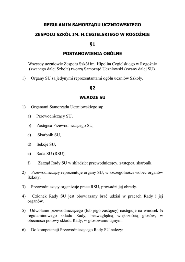 REGULAMIN SAMORZĄDU UCZNIOWSKIEGO ZESPOŁU SZKÓŁ IM. H.CEGIELSKIEGO W ROGOŹNIE §1 POSTANOWIENIA OGÓLNE Wszyscy uczniowie Zespołu Szkół im. Hipolita Cegielskiego w Rogoźnie (zwanego dalej Szkołą) tworzą Samorząd Uczniowski (zwany dalej SU). 1) Organy SU są jedynymi reprezentantami ogółu uczniów Szkoły. §2 WŁADZE SU 1) Organami Samorządu Uczniowskiego są: a) Przewodniczący SU, b) Zastępca Przewodniczącego SU, c) Skarbnik SU, d) Sekcje SU, e) Rada SU (RSU), f) 2) 3) 4) Zarząd Rady SU w składzie: przewodniczący, zastępca, skarbnik. Przewodniczący reprezentuje organy SU, w szczególności wobec organów Szkoły. Przewodniczący organizuje prace RSU, prowadzi jej obrady. Członek Rady SU jest obowiązany brać udział w pracach Rady i jej organów. 5) Odwołanie przewodniczącego (lub jego zastępcy) następuje na wniosek ¼ regulaminowego składu Rady, bezwzględną większością głosów, w obecności połowy składu Rady, w głosowaniu tajnym. 6) Do kompetencji Przewodniczącego Rady SU naleŜy: a) kierowanie pracą Rady SU, b) reprezentowanie interesów SU wobec Dyrektora Szkoły, Rady Pedagogicznej, c) przewodniczenie zebraniu ogólnemu uczniów, d) odpowiadanie na zapytanie uczniów, e) reprezentowanie SU na zewnątrz 7) Organem wykonawczym SU jest Zarząd. §3 ZEBRANIA SU 1) Zebranie Rady SU zwołuje właściwy organ SU lub opiekun SU. 2) Zebrania odbywają się przynajmniej dwa razy w miesiącu. 3) Zwołanie zebrania polega na zawiadomieniu przedstawicieli o terminie i celu zebrania, w sposób zwyczajowo przyjęty w szkole. Gdy zebranie zwołuje organ SU, odrębnie zawiadamia opiekuna SU. 4) Zebranie prowadzi organ zwołujący. 5) Z głosem doradczym w zebraniu RSU mogą wziąć udział osoby dopuszczone przez Prezydium RSU. 6) Uchwały Rady podejmowane są zwykłą większością zebraniach, w których uczestniczy 3/4 przedstawicieli. głosów na 7) Uchwały zebrania RSU podejmowane są zwykłą większością głosów, w głosowaniu przez podniesienie ręki, w obecności quorum: a) połowa przedstawicieli w pierwszym terminie zebrania, b) jedna trzecia w drugim terminie. §5 KOMPETENCJE SU 1) SU moŜe przedstawić Radzie Pedagogicznej i Dyrektorowi, Radzie Szkoły wnioski oraz opinie we wszystkich sprawach dotyczących Szkoły, w szczególności: a) prawo do zapoznania się z podstawami programowymi, programem nauczania oraz zasadami oceniania, b) prawo do jawnego i umotywowanego oceniania postępów i osiągnięć edukacyjnych, szczegółowo określonego w Wewnątrzszkolnym Systemie Oceniania, c) prawo do organizacji Ŝycia szkolnego, umoŜliwiającego właściwe proporcje między wysiłkiem szkolnym a moŜliwością rozwijania i zaspakajania własnych zainteresowań, d) prawo do redagowania i wydawania gazetki szkolnej „Hipcio”, e) prawo organizowania działalności kulturalnej, oświatowej, wychowawczej, rozrywkowej oraz sportowej zgodnie z moŜliwościami organizacyjnymi i w porozumieniu z Dyrektorem, f) prawo wyboru opiekuna SU, g) wyboru w wyborach powszechnych rzecznika praw ucznia (nauczyciela i ucznia), h) uczestniczenie w opracowywaniu planu pracy szkoły, i) zapobieganie i rozwiązywanie konfliktów między uczniami oraz miedzy uczniami a nauczycielami. 2) Samorząd Uczniowski ponadto: a) współuczestniczy w tworzeniu Programu Wewnątrzszkolnego Systemu Oceniania, Wychowawczego b) wyraŜa opinię w sprawie oceny pracy nauczyciela, c) występuje w sprawach określonych w Statucie Szkoły, d) opiniuje zmiany w regulaminie Szkoły, e) czuwa nad przestrzeganiem regulaminu Szkoły i statutu Szkoły, f) opracowuje projekt planu pracy SU, i g) zatwierdza plan pracy SU, h) wyraŜa opinie i wnioski dotyczące spraw uczniów wobec Dyrektora, Rady Pedagogicznej, Rady Rodziców, i) sprawuje kontrolę nad działalnością sekcji, j) gospodaruje finansami SU, k) przygotowuje sprawozdania z działalności SU. §6 WYBORY RADY SU 1) Wybory organów SU odbywają się co rok we wrześniu na zasadach demokratycznych. 2) Kadencja organów SU trwa przez okres roku szkolnego. 3) Wybór uczniów do sekcji SU przeprowadza RSU. §7 ŚRODKI FINANSOWE SU 1) SU dysponuje funduszem uzyskanym w wyniku działalności gospodarczej. 2) Dochody uzyskiwane są z organizowanych imprez: 3) a) bilety wstępu na dyskoteki, b) sprzedaŜ kartek okolicznościowych, c) loterie fantowe, d) kwota pozostała po rozliczeniu wyjazdów do kina, na basen itd. SU moŜe uzyskiwać dochody z darowizn oraz zbiórki surowców wtórnych. §8 POSTANOWIENIA KOŃCOWE 1) Zebrania i spotkania wynikające z działalności Samorządu odbywają się w czasie wolnym od zajęć lekcyjnych (przerwa), a w razie konieczności podczas zajęć. 2) Dyrektor Szkoły moŜe zawiesić lub uchylić uchwałę albo inne postanowienie Samorządu Uczniowskiego jeśli jest ono niezgodne z prawem lub celami wychowawczymi szkoły. 3) Wszystkie sprawy nie ujęte w Regulaminie rozstrzyga Rada SU w porozumieniu z opiekunem SU i Dyrektorem Szkoły. 4) Zatwierdzenie Regulaminu dokonuje Zebranie ogólne uczniów zwykłą większością głosów w obecności co najmniej połowy uczniów, w głosowaniu jawnym. 5) Zmiany Regulaminu moŜe dokonać Zebranie ogólne uczniów 2/3 głosów, w obecności co najmniej 3 uczniów, na wniosek: 6) a) Rady SU, b) 1/10 ogółu uczniów. Regulamin wchodzi w Ŝycie z dniem ogłoszenia.