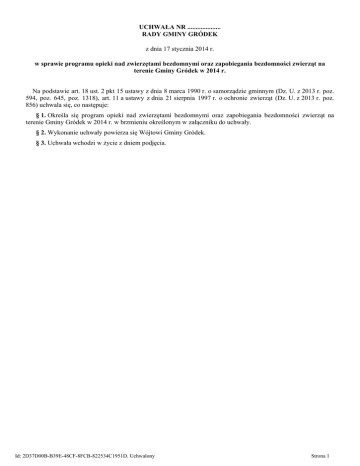 UCHWAŁA NR .................... RADY GMINY GRÓDEK z dnia 17 stycznia 2014 r. w sprawie programu opieki nad zwierzętami bezdomnymi oraz zapobiegania bezdomności zwierząt na terenie Gminy Gródek w 2014 r. Na podstawie art. 18 ust. 2 pkt 15 ustawy z dnia 8 marca 1990 r. o samorządzie gminnym (Dz. U. z 2013 r. poz. 594, poz. 645, poz. 1318), art. 11 a ustawy z dnia 21 sierpnia 1997 r. o ochronie zwierząt (Dz. U. z 2013 r. poz. 856) uchwala się, co następuje: § 1. Określa się program opieki nad zwierzętami bezdomnymi oraz zapobiegania bezdomności zwierząt na terenie Gminy Gródek w 2014 r. w brzmieniu określonym w załączniku do uchwały. § 2. Wykonanie uchwały powierza się Wójtowi Gminy Gródek. § 3. Uchwała wchodzi w życie z dniem podjęcia. Id: 2D37D00B-B39E-48CF-8FCB-822534C1951D. Uchwalony Strona 1 Załącznik Nr 1 do Uchwały Nr .../.../14 Rady Gminy Gródek z dnia .... marca 2014 r. Program opieki nad zwierzętami bezdomnymi oraz zapobiegania bezdomności zwierząt na terenie Gminy Gródek w 2014 r. „Zwierzę, jako istota żyjąca, zdolna do odczuwania cierpienia, nie jest rzeczą. Człowiek jest mu winien poszanowanie, ochronę i opiekę." (art. 1 ustawy z dnia 21 sierpnia 1997 r. o ochronie zwierząt). „Program opieki nad zwierzętami bezdomnymi oraz zapobiegania bezdomności zwierząt na terenie Gminy Gródek w 2014 r.”, zwany dalej ,,Programem" , ma zastosowanie do wszystkich zwierząt domowych, w szczególności psów, kotów bezdomnych i wolno żyjących oraz zwierząt gospodarskich. Większość działań określonych w Programie dotyczy psów, ponieważ skala bezdomności tych zwierząt na terenie Gminy Gródek jest największa. Bezdomność zwierząt jest zjawiskiem społecznym, którego głównymi przyczynami są: 1) niekontrolowane rozmnażanie; 2) porzucanie zwierząt przez właścicieli; 3) ucieczki zwierząt; 4) brak edukacji i wiedzy społeczeństwa w zakresie metod zapobiegania bezdomności, ze szczególnym uwzględnieniem sterylizacji i kastracji. Według raportu Najwyższej Izby Kontroli w sprawie przestrzegania praw zwierząt z dnia 23 sierpnia 2011 r., zjawisko bezdomności zwierząt utrzymuje się na wysokim poziomie i ma tendencję wzrostową. Rozdział 1. CEL PROGRAMU § 1. 1. Celem Programu jest zapobieganie bezdomności zwierząt na terenie Gminy Gródek oraz opieka nad zwierzętami bezdomnymi. 2. Cel nadrzędny Programu, określony w ust. 1, będzie realizowany poprzez: 1) zapewnienie bezdomnym zwierzętom miejsca w schronisku dla zwierząt; 2) opiekę nad wolno żyjącymi kotami, w tym ich dokarmianie; 3) odławianie bezdomnych zwierząt; 4) obligatoryjną sterylizację albo kastrację zwierząt w schroniskach dla zwierząt; 5) poszukiwanie właścicieli dla bezdomnych zwierząt; 6) usypianie ślepych miotów; 7) wskazanie gospodarstwa rolnego w celu zapewnienia miejsca dla zwierząt gospodarskich; 8) zapewnienie całodobowej opieki weterynaryjnej w przypadkach zdarzeń drogowych z udziałem zwierząt. Rozdział 2. REALIZACJA POSZCZEGÓLNYCH PUNKTÓW PROGRAMU § 2. 1. Realizacja Programu dotyczącego bezdomności psów będzie polegać na: Id: 2D37D00B-B39E-48CF-8FCB-822534C1951D. Uchwalony Strona 1 1) zapewnieniu bezdomnym psom miejsca w schronisku dla zwierząt poprzez zawarcie umowy z podmiotem prowadzącym schronisko dla zwierząt na odławianie i odbiór bezdomnych psów z terenu Gminy Gródek, w tym przewiezienie i umieszczenie zwierząt w schronisku dla zwierząt; 2) zobowiązaniu podmiotu prowadzącego schronisko dla zwierząt do zapewnienia odbieranym psom właściwych warunków bytowych zgodnie z obowiązującymi w tym zakresie normami i przepisami prawa oraz obowiązującymi przepisami w sprawie zasad i warunków wyłapywania zwierząt, w tym także w trakcie przewozu; 3) zobowiązaniu podmiotu prowadzącego schronisko dla zwierząt do realizacji zadań, o których mowa w § 1 ust. 2 pkt 3–6. 2. Zwierzęta bezdomne z terenu Gminy Gródek na podstawie umowy, o której mowa w ust. 1 pkt 1 będą odławiane i umieszczane w Schronisku dla Bezdomnych Zwierząt Zygmunt Dworakowski, 12-230 Biała-Piska, Radysy 13. § 3. 1. Realizacja Programu dotyczącego bezdomności kotów będzie polegać na: 1) zapewnieniu opieki bezdomnym kotom z terenu Gminy Gródek, w szczególności zwierzętom chorym i opuszczonym poprzez zapewnienie im miejsca w schronisku dla zwierząt, o którym mowa w § 2 ust. 2; 2) tworzeniu i prowadzeniu rejestru społecznych opiekunów kotów wolno żyjących oraz udzielanie opiekunom wszechstronnej pomocy, w tym zakup i wydawanie karmy. § 4. 1. Realizacja Programu dotyczącego zwierząt gospodarskich będzie polegać na przekazaniu bezdomnych zwierząt gospodarskich lub też indywidualnych przypadków przekazania zwierząt do gospodarstwa rolnego, posiadającego miejsce odpowiednie do gatunku zwierzęcia i jego potrzeb, zapewniającego warunki bytowe, wyżywienie i opiekę, którego właściciel nie był karany za naruszenie przepisów ustawy z dnia 21 sierpnia 1997 r. o ochronie zwierząt (Dz. U. z 2013 r. poz. 856). 2. Zwierzęta gospodarskie z terenu Gminy Gródek będą umieszczone w gospodarstwie Rolniczej Spółdzielni Produkcyjnej w Zubrach. § 5. Zapewnienie całodobowej opieki weterynaryjnej w przypadkach zdarzeń drogowych z udziałem zwierząt polegać będzie na zleceniu odpowiednim służbom weterynaryjnym - PHU „GROT” s.c. - podjęcie opieki lekarskiej nad bezdomnymi zwierzętami, kotami wolno żyjącymi i zwierzętami dzikimi z terenu Gminy Gródek w celu udzielenia pomocy lekarskiej, po czym przekazanie zwierzęcia bezdomnego do schroniska dla zwierząt, o którym mowa w § 2 ust. 2. Rozdział 3. EDUKACJA MIESZKAŃCÓW § 6. Urząd Gminy Gródek w ramach Programu prowadzić będzie poprzez stronę internetową Gminy Gródek i w sposób zwyczajowo przyjęty działania edukacyjne między innymi w zakresie odpowiedzialnej i właściwej opieki nad zwierzętami, ich humanitarnego traktowan