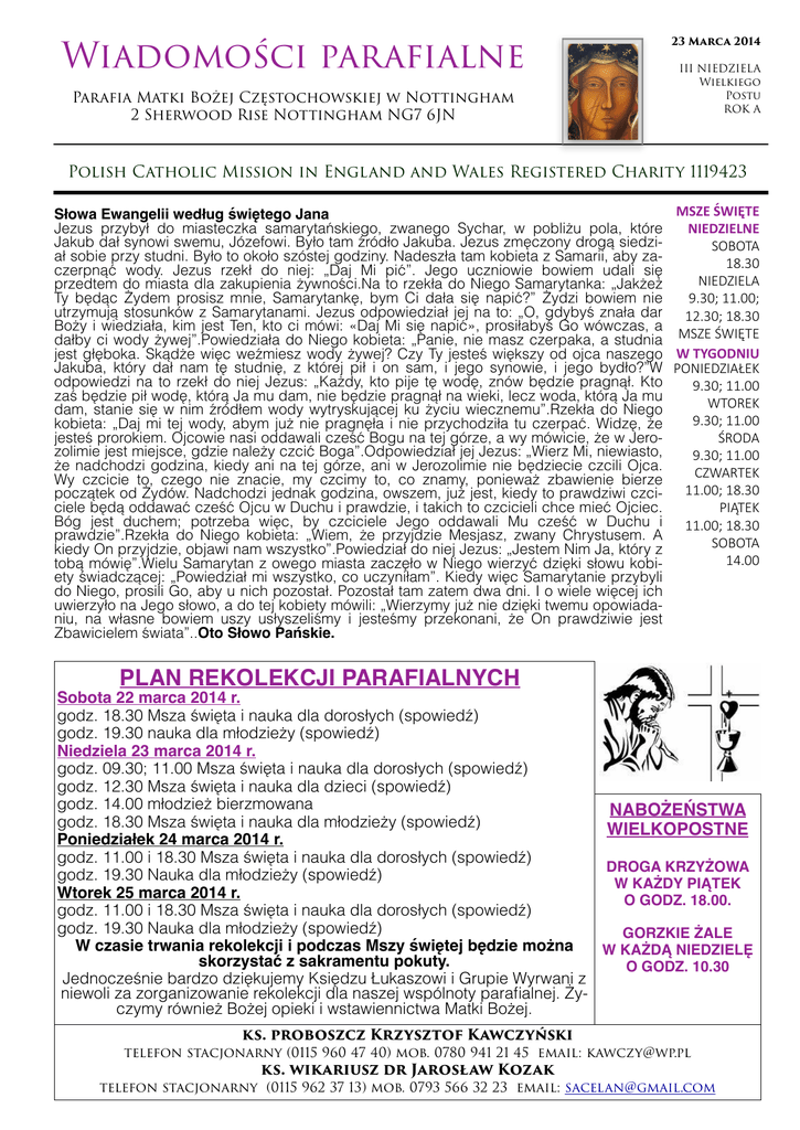 ! 23 Marca 2014 Wiadomości parafialne III NIEDZIELA Wielkiego Postu ROK A Parafia Matki Bożej Częstochowskiej w Nottingham 2 Sherwood Rise Nottingham NG7 6JN ! ! Polish Catholic Mission in England and Wales Registered Charity 1119423 & IĘTE MSZE SW Słowa Ewangelii według świętego Jana! Jezus przybył do miasteczka samarytańskiego, zwanego Sychar, w pobliżu pola, które NIEDZIELNE Jakub dał synowi swemu, Józefowi. Było tam źródło Jakuba. Jezus zmęczony drogą siedziSOBOTA ał sobie przy studni. Było to około szóstej godziny. Nadeszła tam kobieta z Samarii, aby za18.30 czerpnąć wody. Jezus rzekł do niej: „Daj Mi pić”. Jego uczniowie bowiem udali się NIEDZIELA przedtem do miasta dla zakupienia żywności.Na to rzekła do Niego Samarytanka: „Jakżeż Ty będąc Żydem prosisz mnie, Samarytankę, bym Ci dała się napić?” Żydzi bowiem nie 9.30; 11.00; utrzymują stosunków z Samarytanami. Jezus odpowiedział jej na to: „O, gdybyś znała dar 12.30; 18.30 Boży i wiedziała, kim jest Ten, kto ci mówi: «Daj Mi się napić», prosiłabyś Go wówczas, a MSZE ŚWIĘTE dałby ci wody żywej”.Powiedziała do Niego kobieta: „Panie, nie masz czerpaka, a studnia jest głęboka. Skądże więc weźmiesz wody żywej? Czy Ty jesteś większy od ojca naszego W TYGODNIU Jakuba, który dał nam tę studnię, z której pił i on sam, i jego synowie, i jego bydło?”W PONIEDZIAŁEK odpowiedzi na to rzekł do niej Jezus: „Każdy, kto pije tę wodę, znów będzie pragnął. Kto 9.30; 11.00 zaś będzie pił wodę, którą Ja mu dam, nie będzie pragnął na wieki, lecz woda, którą Ja mu WTOREK dam, stanie się w nim źródłem wody wytryskującej ku życiu wiecznemu”.Rzekła do Niego 9.30; 11.00 kobieta: „Daj mi tej wody, abym już nie pragnęła i nie przychodziła tu czerpać. Widzę, że jesteś prorokiem. Ojcowie nasi oddawali cześć Bogu na tej górze, a wy mówicie, że w JeroŚRODA zolimie jest miejsce, gdzie należy czcić Boga”.Odpowiedział jej Jezus: „Wierz Mi, niewiasto, 9.30; 11.00 że nadchodzi godzina, kiedy ani na tej górze, ani w Jerozolimie nie będziecie czcili Ojca. CZWARTEK Wy czcicie to, czego nie znacie, my czcimy to, co znamy, ponieważ zbawienie bierze 11.00; 18.30 początek od Żydów. Nadchodzi jednak godzina, owszem, już jest, kiedy to prawdziwi czciciele będą oddawać cześć Ojcu w Duchu i prawdzie, i takich to czcicieli chce mieć Ojciec. PIĄTEK Bóg jest duchem; potrzeba więc, by czciciele Jego oddawali Mu cześć w Duchu i 11.00; 18.30 prawdzie”.Rzekła do Niego kobieta: „Wiem, że przyjdzie Mesjasz, zwany Chrystusem. A SOBOTA kiedy On przyjdzie, objawi nam wszystko”.Powiedział do niej Jezus: „Jestem Nim Ja, który z 14.00 tobą mówię”.Wielu Samarytan z owego miasta zaczęło w Niego wierzyć dzięki słowu kobiety świadczącej: „Powiedział mi wszystko, co uczyniłam”. Kiedy więc Samarytanie przybyli do Niego, prosili Go, aby u nich pozostał. Pozostał tam zatem dwa dni. I o wiele więcej ich uwierzyło na Jego słowo, a do tej kobiety mówili: „Wierzymy już nie dzięki twemu opowiadaniu, na własne bowiem uszy usłyszeliśmy i jesteśmy przekonani, że On prawdziwie jest Zbawicielem świata”..Oto Słowo Pańskie. PLAN REKOLEKCJI PARAFIALNYCH! Sobota 22 marca 2014 r. ! godz. 18.30 Msza święta i nauka dla dorosłych (spowiedź) godz. 19.30 nauka dla młodzieży (spowiedź) Niedziela 23 marca 2014 r. ! godz. 09.30; 11.00 Msza święta i nauka dla dorosłych (spowiedź) godz. 12.30 Msza święta i nauka dla dzieci (spowiedź) godz. 14.00 młodzież bierzmowana NABOŻEŃSTWA ! godz. 18.30 Msza święta i nauka dla młodzieży (spowiedź) WIELKOPOSTNE! Poniedziałek 24 marca 2014 r. ! godz. 11.00 i 18.30 Msza święta i nauka dla dorosłych (spowiedź) DROGA KRZYŻOWA ! godz. 19.30 Nauka dla młodzieży (spowiedź) W KAŻDY PIĄTEK ! Wtorek 25 marca 2014 r. ! O GODZ. 18.00.! godz. 11.00 i 18.30 Msza święta i nauka dla dorosłych (spowiedź) godz. 19.30 Nauka dla młodzieży (spowiedź) GORZKIE ŻALE ! W czasie trwania rekolekcji i podczas Mszy świętej będzie można W KAŻDĄ NIEDZIELĘ ! skorzystać z sakramentu pokuty. ! O GODZ. 10.30! Jednocześnie bardzo dziękujemy Księdzu Łukaszowi i Grupie Wyrwani z niewoli za zorganizowanie rekolekcji dla naszej wspólnoty parafialnej. Życzymy również Bożej opieki i wstawiennictwa Matki Bożej. ! ! ! ! ks. proboszcz Krzysztof Kawczyński telefon stacjonarny (0115 960 47 40) mob. 0780 941 21 45 email: [email protected] ks. wikariusz dr Jarosław Kozak telefon stacjonarny (0115 962 37 13) mob. 0793 566 32 23 email: [email protected] KANCELARIA! Kancelaria parafialna czynna będzie w czwartki po Mszy św. o godz. 19.15. Natomiast w niedzielę dzieci przygotowujące się do I Komunii świętej mają próby przed I Komunią Świętą. WIZYTY DUSZPASTERSKIE! W tym tygodniu rozpoczniemy wizyty duszpasterskie w dzielnicy NG2 PODZIĘKOWANIE! Rodzina ś.p.Maria Drożak składa podziękowanie Kś. Proboszczowi za odprawienie Mszy Św i ceremonii pogrzebowej na Cmentarzu w Carlton w dniu 28-ego stycznia 2014 r. Dziękujemy Maryli Mondszain za śpiew i granie na organach oraz wszystkim za uczestniczenie we Mszy Św i p. Knapczykowi wraz z Paniami za urządzenie stypy. Składamy również serdeczne podziękowanie za ofiary zamiast kwiatów na grób ś.p. Marii Drożak. Ogólna suma wyniosła £431.50. Wysłano £260.75 do Czerwonego Krzyża oraz £170.75 do Sióstr Klawerianek.Wszystkim za wszystko serdeczne Bóg zapłać. Mąż Kazimierz z Córkami. LEKCJE RELIGII! W tym tygodniu zapraszam dzieci w czwartek na lekcje religii a dzieci komunijne na spotkanie w sobotę o 10.00 i w szkole o 12.00. KATECHEZY PRZEDCHRZCIELNE! W każdy piątek o godz. 19.15 odbywają się katechezy przed chrztem. Każdy kto w najbliższym czasie zamierza ochrzcić dziecko w naszej Parafii zobowiązany jest do uczestniczenia w takim kursie. Osoby, które zostały poproszone o by