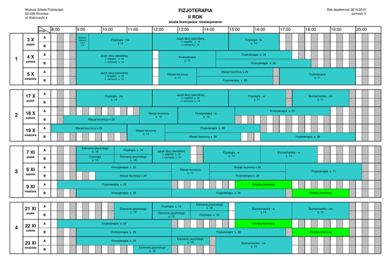 Wyższa Szkoła Fizjoterapii 50-038 Wrocław ul. Kościuszki 4 Rok akademicki 2014/2015 semestr 3 FIZJOTERAPIA II ROK studia licencjackie niestacjonarne Grupy 3X piątek 1 4X sobota 5X niedziela 17 X piątek 2 18 X sobota 19 X niedziela 7 XI piątek 3 8 XI sobota 9 XI niedziela 21 XI piątek 4 22 XI sobota 23 XI niedziela A B A 8:00 9:00 10:00 Spotkanie organizacyjne s.14 12:00 A Masaż leczniczy s. 13 Masaż leczniczy s.26 Masaż leczniczy s.26 A Elementy psychologii s. 18 Fizjologia s. 19 B Fizjologia s. 19 Elementy psychologii s. 18 A B A B A B A B A B 19:00 Fizykoterapia s. 11 Fizykoterapia s. 28 Fizjologia - w. s. 11 Biomechanika - ćw s. 11 Kinezyterapia s. 20 Kinezyterapia - w. s. 13 Fizykoterapia s. 28 Masaż leczniczy s. 13 B Masaż leczniczy s.26 J. angielski s. 18 J. niemiecki s. 19 A 18:00 Kinezyterapia s. 20 Język obcy zawodowy Fizjologia - ćw. s. 14 17:00 Fizykoterapia s. 28 Masaż leczniczy s. 11 J. angielski s. 18 J. niemiecki s. 19 16:00 Fizjologia - w. s. 14 Kinezyterapia s. 13 Język obcy zawodowy B 15:00 J. angielski s. 18 J. niemiecki s. 19 J. angielski s. 18 J. niemiecki s. 19 A 14:00 Język obcy zawodowy Język obcy zawodowy B B 13:00 Fizjologia - ćw. s.14 B A 11:00 Masaż leczniczy s. 26 Język obcy zawodowy Fizjologia - w. s. 14 J. angielski s. 18 J. niemiecki s. 19 Kinezyterapia s. 20 Biomechanika - w s. 14 Masaż leczniczy s.26 Masaż leczniczy s. 11 Masaż leczniczy s.26 Fizykoterapia s. 28 Fizykoterapia s. 11 Fizykoterapia s. 28 Fizykoterapia s. 28 Atletyka terenowa Kinezyterapia s. 20 Fizykoterapia s. 28 Elementy psychologii s. 18 Fizjologia s. 19 Elementy psychologii s. 18 Elementy psychologii s. 18 Fizjologia s. 19 Fizykoterapia s. 28 Atletyka terenowa Biomechanika - w s.14 Biomechanika - ćw s. 14 Atletyka terenowa Kinezyterapia s. 20 Fizykoterapia s. 28 Elementy psychologii s. 19 Kinezyterapia s. 20 Elementy psychologii s. 19 Atletyka terenowa Biomechanika - ćw. s. 12 20:00 Wyższa Szkoła Fizjoterapii 50-038 Wrocław ul. Kościuszki 4 Rok akademicki 2014/2015 semestr 3 FIZJOTERAPIA II ROK studia licencjackie niestacjonarne Grupy 5 XII piątek 5 6 XII sobota 7 XII niedziela 19 XII piątek 6 20 XII sobota 21 XII niedziela 16 I piątek 7 17 I sobota 18 I niedziela 30 I piątek 8 31 I sobota 1 II niedziela 8:00 9:00 10:00 A 11:00 12:00 Elementy psychologii s. 14 B A Masaż leczniczy s.26 14:00 B A Kinezyterapia s. 20 A Kinezyterapia s. 20 Fizykoterapia s. 28 Elementy psychologii s. 18 Fizjologia s. 19 Biomechanika - ćw. s. 14 Fizjologia s. 19 Fizykoterapia s. 28 Fizjologia - ćw. s. 11 Masaż leczniczy s.26 Elementy psychologii s. 18 A Atletyka terenowa Biomechanika - ćw. s. 11 Atletyka terenowa Elementy psychologii s. 18 B 20:00 Atletyka terenowa B A 19:00 Fizykoterapia s. 28 Fizykoterapia s. 28 B 18:00 Kinezyterapia s. 20 Masaż leczniczy s.26 Elementy psychologii s. 18 Elementy psychologii s. 18 17:00 Biomechanika - w s. 14 Masaż leczniczy s.26 A 16:00 Kinezyterapia - w. s. 11 kinezyterapia s. 20 B 15:00 Fizjologia -ćw. s. 14 Masaż leczniczy s. 11 B A 13:00 Elementy psychologii s. 18 Atletyka terenowa Masaż leczniczy s.26 Fizykoterapia s. 28 B Kinezyterapia s. 20 Masaż leczniczy s.26 A Kinezyterapia s. 20 Masaż leczniczy s.26 Masaż leczniczy s.26 B A Biomechanika - egzamin s. 14 B A Atletyka terenowa Elementy psychologii zaliczenie s. 14 B A Atletyka terenowa Fizykoterapia s. 28 Fizykoterapia s. 28 B 8:00 9:00 10:00 11:00 12:00 13:00 14:00 15:00 16:00 17:00 18:00 19:00 20:00 Wyższa Szkoła Fizjoterapii 50-038 Wrocław ul. Kościuszki 4 FIZJOTERAPIA II ROK studia licencjackie niestacjonarne zajęcia w WSF zajęcia w XVII Gimnazjum, ul. Śłężna 2 Rok akademicki 2014/2015 semestr 3