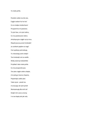 Ta mała pchła. Poszłam sobie raz do zoo, Ciągle wołam ho ho ho! Co za małpa niesłychana! Przypomina mi pawiana. To jest lew, a to jest zebra, Co ma paskowane żebra. Antylopa gnu ciągle ryczy muu. Kłapał paszczą wnet krokodyl! Ja uciekam pędem w nogi! Ciut spokoju potrzebuję. Tu mieszkają same zbóje! Ten krokodyl coś za wielki. Wolę zwierzę maluteńkie Przykład: taka mała pchła Co ma przyjaciela psa. Ten pies ciągle sobie człapie, A ta jak go mocno chapnie, Popamięta sobie pies Takie życie - pieski los. A wracając do tych pcheł Skomponuję dla nich żel Dzięki nim zaraz urosną I w zoo będą tak jak osły.