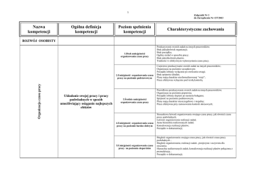 1 Załącznik Nr 1 do Zarządzenia Nr 137/2013 Nazwa kompetencji Ogólna definicja kompetencji Poziom spełnienia kompetencji Charakterystyczne zachowania ROZWÓJ OSOBISTY 1.Brak umiejętności organizowania czasu pracy Organizacja czasu pracy 2.Umiejętność organizowania czasu pracy na poziomie podstawowym Układanie swojej pracy i pracy podwładnych w sposób umożliwiający osiąganie najlepszych efektów 3.Średnie umiejętności organizowania czasu pracy 4.Umiejętność organizowania czasu pracy na poziomie bardzo dobrym 5.Umiejętność organizowania czasu pracy na poziomie eksperckim Przekazywanie swoich zadań na innych pracowników; Brak jakiejkolwiek organizacji; Brak porządku; Ogólny nieład w sposobie pracy; Brak jakichkolwiek planów; Trudności w efektywnym wykorzystaniu czasu pracy. Częściowe przekazywanie swoich zadań na innych pracowników; Organizacja na poziomie szczątkowym; Porządek robiony wyłącznie po zwróceniu uwagi; Brak spójności działań; Plany mają charakter niesformalizowanej “wizji”; Praca efektywna wyłącznie pod ścisłą kontrolą. Prawidłowe przekazywanie swoich zadań na innych pracowników; Organizacja na poziomie poprawna; Porządek robiony dopiero po nastaniu bałaganu; Spójność na poziomie podstawowym; Plany mają charakter nieszczegółowy i niepełny; Praca efektywna przy zastosowaniu kontroli okresowych; Stosunkowa łatwość organizowania swojego czasu pracy, jak również czasu pracy podwładnych; Łatwość organizowania realizacji zadań; Jasna hierarchia realizowanych zadań; Konsekwencja realizacji planów; Porządek w dokumentacji; Biegłość organizowania swojego czasu pracy, jak również czasu pracy podwładnych ; Biegłość organizowania; realizacji zadań , przejrzysta i oczywista dla otoczenia; Hierarchia realizowanych zadań, konsekwencja realizacji planów połączona z premedytacją ; Porządek w dokumentacji; 2 Załącznik Nr 1 do Zarządzenia Nr 137/2013 1.Brak umiejętności autoprezentacji Autoprezentacja 2.Umiejętność autoprezentacji na poziomie minimalnym ( podstawowym) Umiejętność świadomego tworzenia swojego wizerunku poprzez wypowiedzi, zachowanie i sygnały niewerbalne 3.Średnie umiejętności autoprezentacji 4.Umiejętność autoprezentacji na poziomie dobrym 5.Umiejętność na poziomie eksperckim 1.Brak umiejętności komunikowania się Komunikacja 2.Umiejętności komunikacyjne na poziomie minimalnym ( podstawowym) Łatwość wyrażania swoich myśli, łatwość i dokładność przekazywania swojej wiedzy i danych, otwartość na informacje napływające z zewnątrz, łatwe kontakty z innymi ludźmi 3.Średnie umiejętności komunikacyjne 4.Umiejętności komunikacyjne na poziomie bardzo dobrym 5.Umiejętności komunikacyjne na poziomie eksperckim Nie panuje zupełnie zarówno nad wypowiedziami jak i zachowaniami oraz przekazem niewerbalnym; Potrafi panować nad wypowiedzią i częściowo zachowaniami; Jakakolwiek głębsza zmiana przyjętego wcześniej scenariusza działań powoduje zagubienie i utratę panowania; Zupełnie nie panuje nad przekazem niewerbalnym Potrafi panować nad treścią wypowiedzi i zachowaniami; Potrafi opanować się w przypadku niewielkich zmian scenariusza działań; Potrafi kontrolować niektóre zachowania niewerbalne; Potrafi panować nad treścią wypowiedzi i zachowaniami oraz zachowaniami niewerbalnymi, tak aby nie wysyłać treści negatywnych; Potrafi opanować się w przypadku większości zmian przyjętego scenariusza działań; Zna podstawowe techniki budowy własnego wizerunku; W pełni świadomie kształtuje swój wizerunek, na każdym z przyjętych poziomów (wypowiedzi, werbalnym i niewerbalnym); Elastycznie dostosowuje swoje zachowanie do potrzeb chwili; Zna zaawansowane techniki budowy własnego wizerunku, m.in., z wykorzystaniem NLP (programowania neurolingwistycznego); Nieumiejętność rozmawiania z ludźmi nawet na dobrze znane tematy; Unikanie kontaktów z innymi; Nieśmiałość ; Niechęć do kontaktów z ludźmi; Niesłuchanie innych; Prowadzenie rozmów wyłącznie na tematy dobrze i bardzo dobrze znane; Nieunikanie, ale i niedążenie do kontaktów z ludźmi; Ukrywana nieśmiałość; Kontakty ograniczone do grupy 2-3 osób; Słuchanie nieuważne i niechętne; Umiejętność porozumiewania się z ludźmi w razie potrzeby; Załatwianie istotnych spraw – jednak nie przychodzi to ze zbyt wielką łatwością; Unikanie kontaktów z większą liczbą osób; Słuchanie uważne; Łatwość porozumiewania się z ludźmi, prowadzenie rozmowy na tematy nawet słabo znane; Załatwianie większości spraw – bez większych trudności; Brak oporów przed kontaktami z większą liczbą osób; Słuchanie uważne i chętne; Wyjątkowa łatwość w kontaktach z innymi ludźmi; Łatwość rozmowy, w zasadzie na każdy, nawet rudymentarnie znany temat; Łatwość bezpośrednich kontaktów w każdej sytuacji; Łatwość przekazywania informacji oraz prowadzenia prezentacji, spotkań i szkoleń; Łatwość załatwiania spraw, nawet tych uważanych za trudne; Otwartość na informacje z zewnątrz, słuchanie empatyczne; 3 Załącznik Nr 1 do Zarządzenia Nr 137/2013 Relacje interpersonalne 1.Całkowita niewiedza w zakresie znaczenia i sterowania relacjami interpersonalnymi Umiejętność przekazywania adekwatnych informacji o swoich potrzebach i oczekiwaniach, uczenie się unikania sytuacji podwójnego komunikatu. Odróżnianie poziomu informacji o treści od poziomu informacji o relacji, Świadomość wpływu własnych i innych stanów emocjonalnych i schematów poznawczych na procesy zniekształcania informacji nadawanych i odbieranych 2Rudymentarne ( elementarne) umiejętności interpersonalne 3.Podstawowa wiedza i umiejętności jej zastosowania 4.Kontrola relacji na poziomie dobrym 5.W pełni świadome kształtowanie relacji interpersonalnych W czasie interakcji nieświadomie wysyła sprzeczne bądź aluzyjne komunikaty, Nieświadomie angażuj