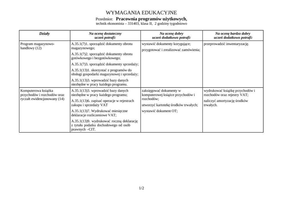 WYMAGANIA EDUKACYJNE Przedmiot: Pracownia programów użytkowych, technik ekonomista – 331403, klasa II, 2 godziny tygodniowo Działy Program magazynowohandlowy (12) Na ocenę dostateczny uczeń potrafi: A.35.1(7)1. sporządzić dokumenty obrotu magazynowego; Na ocenę dobry uczeń dodatkowo potrafi: wystawić dokumenty korygujące; Na ocenę bardzo dobry uczeń dodatkowo potrafi: przeprowadzić inwentaryzację. przygotować i zrealizować zamówienia; A.35.1(7)2. sporządzić dokumenty obrotu gotówkowego i bezgotówkowego; A.35.1(7)3. sporządzić dokumenty sprzedaży; A.35.1(13)1. skorzystać z programów do obsługi gospodarki magazynowej i sprzedaży; A.35.1(13)3. wprowadzić bazy danych niezbędne w pracy każdego programu. Komputerowa książka przychodów i rozchodów oraz ryczałt ewidencjonowany (14) A.35.1(13)3. wprowadzić bazy danych niezbędne w pracy każdego programu; A.35.1(13)6. zapisać operacje w rejestrach zakupu i sprzedaży VAT A.35.1(13)7. Wydrukować miesięczne deklaracje rozliczeniowe VAT; zaksięgować dokumenty w komputerowej książce przychodów i rozchodów; utworzyć kartotekę środków trwałych; wystawić dokument OT; A.35.1(13)9. wydrukować roczną deklarację z tytułu podatku dochodowego od osób prawnych –CIT. 1/2 wydrukować książkę przychodów i rozchodów oraz rejestry VAT; naliczyć amortyzację środków trwałych. Działy Na ocenę dostateczny uczeń potrafi: Na ocenę dobry uczeń dodatkowo potrafi: Programy kadrowo-płacowe (15) A.35.1(13)3. wprowadzić bazy danych niezbędne w pracy każdego programu; Na ocenę bardzo dobry uczeń dodatkowo potrafi: przygotować przelewy dla pracowników wprowadzić informacje o oraz do Urzędu Skarbowego; nieobecnościach pracowników; A.35.1(13)8. Wydrukować roczną deklarację z tytułu podatku dochodowego od osób fizycznych –PIT; przygotować deklaracje ZUS. A.35.2(2)3. sporządzić dokumenty związane z zatrudnieniem; A.35.2(10)1. zastosować programy kadrowe; A.35.2(10)2. zastosować programy płacowe; przygotować listę płac. Obsługa programu Płatnik (9) A.35.1(13)2. skorzystać z programów użytkowych, np. Płatnik; wysyłać dokumenty do ZUS metodą wydruku. dobrać odpowiedni formularz do osiągnięcia założonego celu; A.35.3(9)1. skorzystać z arkusza kalkulacyjnego do przeprowadzenia analizy statystycznej. zastosować funkcje matematyczne, statystyczne i finansowe; zastosować funkcje logiczne; stosować programy Subiekt, Rachmistrz, mikroGratyfikant, Gratyfikant i Płatnik do typowych zadań. stosować programy Subiekt, zainstalować system Insert GT; Rachmistrz, mikroGratyfikant, zainstalować program Płatnik; Gratyfikant i Płatnik do mniej typowych zadań. A.35.1(13)3. wprowadzić bazy danych niezbędne w pracy każdego programu; A.35.1(13)4. dokonać rozliczenia w programie Płatnik; A.35.1(13)5.wydrukować deklaracje zgłoszeniowe i raporty imienne. Ekonomiczne zastosowania arkusza kalkulacyjnego (4) Przykładowe zadania egzaminacyjne (6) wykonać dowolny wykres. wykonać typowy wykres. Na ocenę dopuszczający uczeń potrafi wykonać 80 % zadań wymaganych na ocenę dostateczny. Na ocenę celujący uczeń wykonuje dodatkowe zadania uzgodnione z nauczycielem co najmniej miesiąc przed wystawieniem oceny półrocznej lub rocznej. 2/2