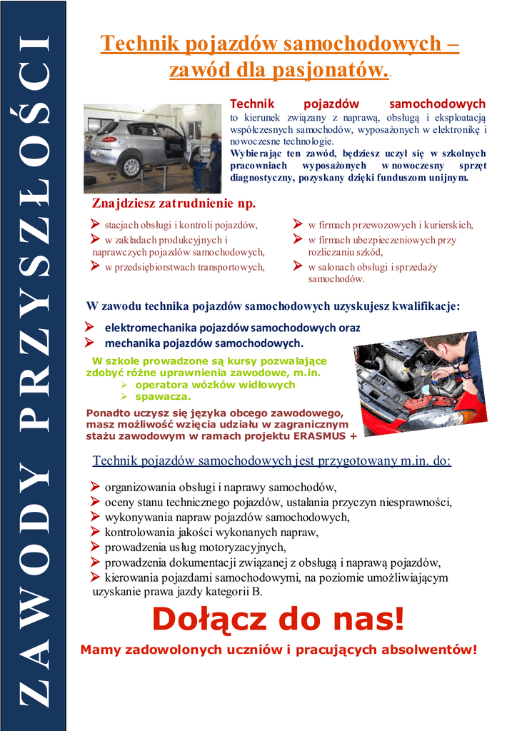 ZAWODY PRZYSZŁOŚCI Technik pojazdów samochodowych – zawód dla pasjonatów.. Technik pojazdów samochodowych to kierunek związany z naprawą, obsługą i eksploatacją współczesnych samochodów, wyposażonych w elektronikę i nowoczesne technologie. Wybie rając ten zawód, będziesz uczył się w szkolnych pracowniach wyposażonych w nowoczesny sprzęt diagnostyczny, pozyskany dzięki funduszom unijnym. Znajdziesz zatrudnienie np. stacjach obsługi i kontroli pojazdów, w zakładach produkcyjnych i naprawczych pojazdów samochodowych, w przedsiębiorstwach transportowych, w firmach przewozowych i kurierskich, w firmach ubezpieczeniowych przy rozliczaniu szkód, w salonach obsługi i sprzedaży samochodów. W zawodu technika pojazdów samochodowych uzyskujesz kwalifikacje: elektromechanika pojazdów samochodowych oraz mechanika pojazdów samochodowych. W szkole prowadzone są kursy pozwalające zdobyć różne uprawnienia zawodowe, m.in. operatora wózków widłowych spawacza. Ponadto uczysz się języka obcego zawodowego, masz możliwość wzięcia udziału w zagranicznym stażu zawodowym w ramach projektu ERASMUS + Technik pojazdów samochodowych jest przygotowany m.in. do: organizowania obsługi i naprawy samochodów, oceny stanu technicznego pojazdów, ustalania przyczyn niesprawności, wykonywania napraw pojazdów samochodowych, kontrolowania jakości wykonanych napraw, prowadzenia usług motoryzacyjnych, prowadzenia dokumentacji związanej z obsługą i naprawą pojazdów, kierowania pojazdami samochodowymi, na poziomie umożliwiającym uzyskanie prawa jazdy kategorii B. Dołącz do nas! Mamy zadowolonych uczniów i pracujących absolwentów!