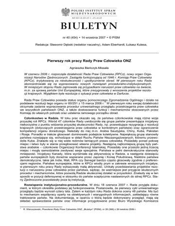 BIURO BADAŃ I ANALIZ BIULETYN nr 40 (454) • 14 września 2007 • © PISM Redakcja: Sławomir Dębski (redaktor naczelny), Adam Eberhardt, Łukasz Kulesa, Pierwszy rok pracy Rady Praw Człowieka ONZ Agnieszka Bieńczyk-Missala W czerwcu 2006 r. rozpoczęła działalność Rada Praw Człowieka (RPCz), nowy organ Organizacji Narodów Zjednoczonych. Zastąpiła funkcjonującą od 1946 r. Komisję Praw Człowieka (KPCz), krytykowaną za nieskuteczność i upolitycznienie obrad. W pierwszym roku Rada skoncentrowała się na wypracowaniu nowych rozwiązań proceduralno-instytucjonalnych. W mniejszym stopniu Rada zajmowała się przypadkami naruszeń praw człowieka na świecie, m.in. za sprawą państw Unii Europejskiej, które zrezygnowały z wnoszenia projektów rezolucji krajowych. Wyjątkiem była rezolucja o sytuacji praw człowieka w Darfurze. Rada Praw Człowieka posiada status organu pomocniczego Zgromadzenia Ogólnego i działa na podstawie rezolucji tego organu nr 60/251 z 15 marca 2006 r.1 W pierwszym roku swojej działalności otrzymała zadanie wypracowania procedur uniwersalnego przeglądu przestrzegania praw człowieka we wszystkich państwach ONZ, a także dostosowania funkcji i mechanizmów stosowanych przez Komisję do własnych potrzeb oraz ustalenia ramowego porządku obrad. Członkostwo w Radzie. W toku prac okazało się, że państwa członkowskie mają różne wizje przyszłej roli RPCz. Wśród 47 członków Rady uwidoczniła się grupa państw prezentująca inicjatywy niekorzystne z punktu widzenia przyszłej skuteczności Rady, np. przewidujące rezygnację z rezolucji krajowych (dotyczących przestrzegania praw człowieka w konkretnym państwie) oraz ograniczenie kompetencji organu doradczego. Należały do niej m.in. Arabia Saudyjska, Chiny, Kuba, Pakistan i Rosja. Ponadto w trakcie głosowań dominowało podejście kolektywne. Największą grupę stanowiły państwa rozwijające się, wchodzące w skład Ruchu Państw Niezaangażowanych, któremu przewodziła Kuba. Znalazło się w niej wiele reżimów łamiących prawa człowieka. Posiadały ponad połowę miejsc i łatwo były w stanie przegłosować własne projekty. Następną najliczniejszą grupą były państwa arabskie – członkowie Organizacji Konferencji Islamskiej. Posiadały one przeszło jedną trzecią miejsc i mogły samodzielnie zwoływać sesje specjalnie. Państwa w pełni demokratyczne stanowiły mniejszość. Inicjatywy Kanady, która wyróżniała się aktywnością w Radzie, a następnie dziesięciu państw europejskich były doraźnie wspierane przez Japonię i Koreę Południową. Niektóre państwa demokratyczne, takie jak Indie, Mali, RPA czy Senegal bardzo często głosowały zgodnie z preferencjami regionów. Państwa europejskie, które w KPCz wiodły prym w zakresie wnoszonych inicjatyw, w pierwszym roku pracy Rady wykazywały małą aktywność. Unikały przedstawiania projektów rezolucji o naruszaniu praw człowieka przez państwa, sądząc, że ważniejsze jest przyjęcie skutecznych procedur i mechanizmów, które pozwolą Radzie skuteczniej działać w przyszłości. Znalazły się w ten sposób w pozycji defensywnej w stosunku do państw sceptycznie nastawionych do silnej RPCz. Stany Zjednoczone pozostawały poza tą instytucją. Rozwiązania instytucjonalno-proceduralne. W dniu 18 czerwca 2007 r. Rada przyjęła dokument, w którym określiła podstawy jej funkcjonowania. Postanowiła, że pierwszy cykl uniwersalnego przeglądu będzie wynosił cztery lata. Zatem w każdym roku Rada dokona oceny 48 państw. Ma być to mechanizm współpracy oparty na obiektywnych i wiarygodnych informacjach, zakładający równe traktowanie państw. Na dokumentację, w oparciu o którą będzie dokonywany przegląd, mają się składać sprawozdania państw oraz informacje przygotowane przez Biuro Wysokiego Komisarza 1 R. Wieruszewski, Powołanie Rady Praw Człowieka ONZ, „Biuletyn” (PISM), nr 28 (368) z 26 kwietnia 2006 r. 1810 Polski Instytut Spraw Międzynarodowych ds. Praw Człowieka na podstawie m.in. raportów organów traktatowych i innych instytucji ONZ. Analiza osiągnięć i zaniechań państw będzie dokonywana w grupie roboczej, a następnie przyjmowana na sesji Rady. Końcowy raport ma zawierać konkluzje i rekomendacje, a także ewentualne dobrowolne przyrzeczenia państw. W ramach przyjętych rozwiązań postanowiono zmniejszyć liczbę specjalnych sprawozdawców do 36. Uchylono m.in. mandat sprawozdawców do spraw Białorusi i Kuby, co miało związek z szerokim poparciem części państw członkowskich dla Kuby, a także wzajemnym wspieraniem się państw krytykowanych za naruszenia praw człowieka. Wątpliwości budzi zmiana sposobu wyboru sprawozdawców. O ile w KPCz ich powołania dokonywał przewodniczący, o tyle w Radzie decyzję w tej sprawie ma podejmować cała Rada, co z pewnością będzie utrudniać dokonanie wyboru. Podjęto również decyzję o zmianie organu pomocniczego, którym w przypadku Komisji była ekspercka Podkomisja ds. Promocji i Ochrony Praw Człowieka. Została zastąpiona przez Komitet Doradczy złożony z 18 niezależnych ekspertów wybieranych przez Radę na trzy lata. Jego kompetencje zostały ograniczone w porównaniu do poprzedniczki. Nie ma możliwości przyjmowania rezolucji, podejmowania decyzji, ani zajmowania się stanem przestrzegania praw człowieka w poszczególnych krajach. Rada utrzymała poufną procedurę rozpatrywania zawiadomień indywidualnych dotyczących poważnych i systematycznych naruszeń praw człowieka na podstawie rezolucji 1503 ECOSOC z 1970 r. Problemy merytoryczne. Z inicjatywy państw arabskich RPCz zajmowała się głównie łamaniem praw człowieka przez Izrael na palestyńskich terytoriach okupowanych oraz podczas operacji militarnej w Libanie. Problemom tym były poświęcone trzy kolejne sesje specjalne Rady (VII, VIII, IX 2006 r.). W sumie przyjęto dziewięć rezolucji, w których m.in. potępiono Iz