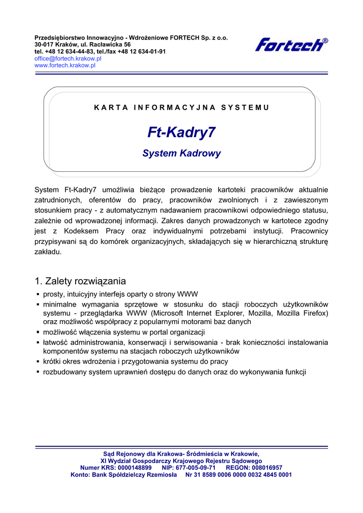 Przedsiębiorstwo Innowacyjno - Wdrożeniowe FORTECH Sp. z o.o. 30-017 Kraków, ul. Racławicka 56 tel. +48 12 634-44-83, tel./fax +48 12 634-01-91 [email protected] www.fortech.krakow.pl KARTA INFORMACYJNA SYSTEMU Ft-Kadry7 System Kadrowy System Ft-Kadry7 umożliwia bieżące prowadzenie kartoteki pracowników aktualnie zatrudnionych, oferentów do pracy, pracowników zwolnionych i z zawieszonym stosunkiem pracy - z automatycznym nadawaniem pracownikowi odpowiedniego statusu, zależnie od wprowadzonej informacji. Zakres danych prowadzonych w kartotece zgodny jest z Kodeksem Pracy oraz indywidualnymi potrzebami instytucji. Pracownicy przypisywani są do komórek organizacyjnych, składających się w hierarchiczną strukturę zakładu. 1. Zalety rozwiązania prosty, intuicyjny interfejs oparty o strony WWW minimalne wymagania sprzętowe w stosunku do stacji roboczych użytkowników systemu - przeglądarka WWW (Microsoft Internet Explorer, Mozilla, Mozilla Firefox) oraz możliwość współpracy z popularnymi motorami baz danych możliwość włączenia systemu w portal organizacji łatwość administrowania, konserwacji i serwisowania - brak konieczności instalowania komponentów systemu na stacjach roboczych użytkowników krótki okres wdrożenia i przygotowania systemu do pracy rozbudowany system uprawnień dostępu do danych oraz do wykonywania funkcji Sąd Rejonowy dla Krakowa- Śródmieścia w Krakowie, XI Wydział Gospodarczy Krajowego Rejestru Sądowego Numer KRS: 0000148899 NIP: 677-005-09-71 REGON: 008016957 Konto: Bank Spółdzielczy Rzemiosła Nr 31 8589 0006 0000 0032 4845 0001 Przedsiębiorstwo Innowacyjno - Wdrożeniowe FORTECH Sp. z o.o. 2. Wybrana funkcjonalność systemu pełna obsługa kartoteki pracowników (zgodnie z posiadanymi uprawnieniami) automatyczne rozliczanie stażu pracownika wraz z raportowaniem np. komu w zadanym okresie należy wypłacić nagrodę jubileuszową generator dokumentów kadrowych - emisja dokumentów kadrowych w postacidefiniowanej przez użytkownika funkcje pomocnicze - np. grupowe przeniesienia pracowników pomiędzy komórkamiorganizacyjnymi na skutek reorganizacji, grupowe podwyżki płacy ewidencja nieobecności pracowników (w tym rozliczanie urlopów) generacja raportów kadrowych - emisja raportów imiennych w postaci definiowanejprzez użytkownika możliwość uzyskania informacji dotyczących zatrudnienia wg stanu na wybrany dzieńdefiniowanie grup, cech i umiejętności pracowników (wyszukiwanie, statystyki) obsługa alertów - powiadomień o zdarzeniach możliwość ewidencji osób nie będących pracownikami np. stażyści, umowy cywilno-prawne przyjazny panel operatora umożliwiający łatwy dostęp do wszystkich informacjio pracowniku rozbudowane systemy filtrów w poszczególnych ewidencjach emisja szeroko sparametryzowanych raportów imiennych i zbiorczych (formatwydruków PDF, XHTML) kontrola dostępu do danych oraz funkcji poprzez rozbudowany system uprawnień,prowadzenie dziennika zdarzeń i błędów aplikacji (log systemu). Przykładowy fragment ekranu systemu Ft-Kadry7 Karta informacyjna systemu Ft-Kadry7 2/2