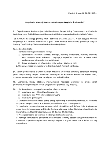 Kamień Krajeński, 24.04.2013 r. Regulamin VI edycji Konkursu Gminnego „Przyjaźni Środowisku” §1. Organizatorem konkursu jest Miejsko Gminny Zespół Usług Oświatowych w Kamieniu Krajeńskim oraz Zakład Gospodarki Komunalnej i Mieszkaniowej w Kamieniu Krajeńskim. §2. Konkurs ma zasięg gminny, finał odbędzie się 28.05.2013 r. w sali sesyjnej Urzędu Miejskiego w Kamieniu Krajeńskim o godz. 9.00. Komisję konkursową powołuje Miejsko Gminny Zespół Usług Oświatowych w Kamieniu Krajeńskim. §3. 1. Zasady udziału: Konkurs obejmuje dwie różne formy: 1) Sprawdzian z wiedzy z zakresu ekologii, ochrony środowiska, ochrony przyrody oraz nowych zasad odbioru i segregacji odpadów. (Test dla uczniów szkół podstawowych i test dla gimnazjalistów). 2) Prace plastyczne nt. „Ziemia jest tylko jedna – dbajmy o nią”. 2. Uczniowie mogą brać udział w jednej lub dwóch formach konkursu. §4. Szkoły podstawowe z Gminy Kamień Krajeński w drodze eliminacji szkolnych wyłonią jeden trzyosobowy zespół. Publiczne Gimnazjum w Kamieniu Krajeńskim wyłoni dwa, trzyosobowe zespoły. Uczniowie rozwiązują test indywidualnie. §5. Uczniowie, którzy zdobędą indywidualnie najwięcej punktów w grupie szkół podstawowych i gimnazjum zostaną nagrodzeni (pierwsze trzy miejsca). §6. 1. Konkurs plastyczny organizowany jest dla trzech grup: 1) uczniowie klas I-III szkół podstawowych; 2) uczniowie klas IV-VI szkół podstawowych; 3) uczniowie gimnazjum. 2. Uczestnik konkursu składa jedną pracę wykonaną w dowolnej technice, w formacie A-3, opatrzoną na odwrocie imieniem, nazwiskiem, klasą i nazwą szkoły. 3. Uczniowie przekazują prace do nauczycieli plastyki (sztuki), którzy złożą je do oceny przez Komisję konkursową w Miejsko Gminnym Zespole Usług Oświatowych w Kamieniu Krajeńskim, ul. Plac Odrodzenia 3, pok. 37 do dnia 24.05.2013 r. 4. Prace przekazane po terminie nie biorą udziału w konkursie. 5. Komisja konkursowa, powołana przez Miejsko Gminny Zespół Usług Oświatowych w Kamieniu Krajeńskim wybierze w każdej kategorii 3 najciekawsze prace, które zostaną nagrodzone. §7. 1. W ramach konkursu „Przyjaźni Środowisku” przeprowadzona będzie również punktacja drużynowa szkół. Punkty zdobyte przez uczniów danej szkoły w różnych formach będą sumowane i zdecydują o miejscu szkoły. 2. W punktacji drużynowej brana będzie pod uwagę również liczba prac plastycznych, które napłyną z danej szkoły. §8. Podsumowanie Konkursu „Przyjaźni Środowisku” odbędzie się w dniu 28.05.2013 r. o godz. 11.00 sali sesyjnej Urzędu Miejskiego w Kamieniu Krajeńskim. §9. Zapraszamy do udziału.