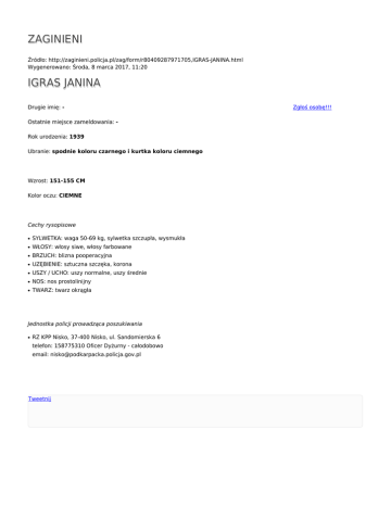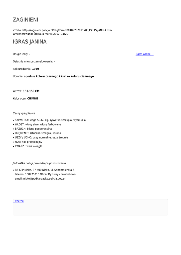 ZAGINIENI Źródło: http://zaginieni.policja.pl/zag/form/r80409287971705,IGRAS-JANINA.html Wygenerowano: Środa, 8 marca 2017, 11:20 IGRAS JANINA Drugie imię: Ostatnie miejsce zameldowania: Rok urodzenia: 1939 Ubranie: spodnie koloru czarnego i kurtka koloru ciemnego Wzrost: 151-155 CM Kolor oczu: CIEMNE Cechy rysopisowe ● SYLWETKA: waga 50-69 kg, sylwetka szczupła, wysmukła ● WŁOSY: włosy siwe, włosy farbowane ● BRZUCH: blizna pooperacyjna ● UZĘBIENIE: sztuczna szczęka, korona ● USZY / UCHO: uszy normalne, uszy średnie ● NOS: nos prostolinijny ● TWARZ: twarz okrągła Jednostka policji prowadząca poszukiwania ● RZ KPP Nisko, 37-400 Nisko, ul. Sandomierska 6 telefon: 158775310 Oficer Dyżurny - całodobowo email: [email protected] Tweetnij Zgłoś osobę!!!