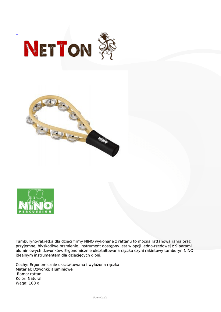 Tamburyno-rakietka dla dzieci firmy NINO wykonane z rattanu to mocna rattanowa rama oraz przyjemne, błyskotliwe brzmienie. Instrument dostępny jest w opcji jedno-rzędowej z 9 parami aluminiowych dzwonków. Ergonomicznie ukształtowana rączka czyni rakietowy tamburyn NINO idealnym instrumentem dla dziecięcych dłoni. Cechy: Ergonomicznie ukształtowana i wyłożona rączka Materiał: Dzwonki: aluminiowe Rama: rattan Kolor: Natural Waga: 100 g Strona 1 z 2 Dla dzieci od 3 lat Strona 2 z 2