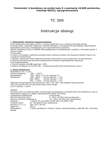 Termometr 4-kanałowy na sondy typu K z pamięcią 16.000 pomiarów, interfejs RS232, oprogramowanie TC 309 Instrukcja obsługi 1. Wskazówki odnośnie bezpieczeństwa. Przed włączeniem przyrządu prosimy o uważne zapoznanie się z niniejszą instrukcją obsługi. Przyrząd należy użytkować wyłącznie w sposób określony w niniejszej instrukcji obsługi, nieprawidłowa eksploatacja grozi jego uszkodzeniem oraz wypowiedzeniem gwarancji. Miernik temperatury typu K CENTER 309 współpracuje ze standardowymi sondami z termoelementem K różnych typów. Konserwacja: ● czyścić w przypadku zaistnienia potrzeby lekko zwilżoną szmatką. Nie stosować środków żrących ani rysujących powierzchnię, ● naprawy wykonywać może wyłącznie personel autoryzowany przez producenta lub dystrybutora, ● otwarcie miernika przez personel nieuprawniony skutkuje wypowiedzeniem gwarancji. Znak bezpieczeństwa: ● miernik posiada znak CE zgodności z EMC, ● spełnia wymagania normy IEC 584 – temperatura/woltaż dla termoelementu typu K. 2. Dane techniczne. Wyświetlacz LCD, 4 cyfry Zakres pomiarowy -200...1.370oC Rozdzielczość -200...200oC co 0,1oC; powyżej 1oC Dokładność -200...200oC +(0,2% odczytu + 1oC), 200...400oC +(0,5% odczytu + 1oC) o 400...1.370 C +(0,2% odczytu + 1oC) Zależność temperaturowa dla otoczenia 0..18oC i 28...50oC, dla każdego stopnia poniżej 18oC lub powyżej 28oC do powyższej tabeli należy dodać 0,01oC odczytu + 0,03oC UWAGA! Powyższe dane nie obejmują błędu pomiarowego wynikającego z charakterystyki termoelementu typu K! Maksymalne napięcie na wejściu termoelementu 60VDC lub 24VAC Częstotliwość odświeżania 0,6/sekundę Warunki otoczenia pracy 0...50oC; do 80% (bez kondensacji) Warunki otoczenia składowania -10...60oC; do 80% (bez kondensacji) Zasilanie 1 bateria 9V typu 006P lub IEC 6F22 lub NEDA 1604 Trwałość baterii ok. 100 godzin pracy (alkaliczna) Wymiary d x s x w 184 x 64 x 30 mm Ciężar ok. 250 g Wyposażenie 2 sondy perełkowe K, bateria, futerał, oprogramowanie, kabel RS-232, instrukcja obsługi 3. Opis przyrządu. 1. 2. 3. 4. 5. 6. 7. 8. 9. Gniazdo sondy pomiarowej. Wyświetlacz LCD. Włącznik zasilania miernika. Klawisz wyświetlania wartości MAX MIN. Klawisz zatrzymania pomiaru HOLD. Funkcja pomiaru różnicowego REL. Zmiana jednostek oC / oF. Potencjometr kalibracyjny. Osłona zasobnika na baterie. 4. Obsługa. 1. Włączenie mierniki - nacisnąć włącznik zasilania – klawisz 3. Nacisnąć klawisz 3 na chwilę, by włączyć/wyłączyć podświetlenie. Nacisnąć i przytrzymać klawisz 3 przez 3 sekundy, by wyłączyć miernik. 2. Podłączenie sondy pomiarowej – gniazdo 1. 3. Wybór jednostki pomiaru – nacisnąć klawisz 8. 4. Funkcja HOLD. W trakcie trwania pomiaru można zamrozić wyświetlacz naciskając klawisz HOLD. Ponowne naciśnięcie HOLD powoduje powrót do bieżącego pomiaru. W trybie HOLD nieaktywne są inne funkcje miernika – klawisze 4, 6 i 7. 5. Funkcja T1-T2. Można zmierzyć w wygodny sposób różnicę temperatur. Naciskamy T1-T2 w temperaturze odniesienia. Od tej chwili miernik wskazuje różnicę pomiędzy zapamiętaną temperaturą odniesienia a bieżącym pomiarem. Ponowne naciśnięcie T1-T2 powoduje powrót do bieżącego pomiaru. 6. Funkcja pamięci. Aby zacząć nagrywanie pomiarów należy nacisnąć przycisk REC. Ponowne naciśnięcie tego przycisku spowoduje zatrzymanie rejestracji pomiarów. Aby wykasować pamięć należy wyłączyć miernik, następnie wcisnąć i przytrzymać przycisk REC oraz wyłącznik przez 5 sek. Na wyświetlaczu powinna ukazać się informacja „CLR” i „SURE 5”. Wtedy należy puścić klawisze by wykasować pamięć. 7. Ustawianie zegara. Nacisnąć i przytrzymać przycisk T1-T2 i włączyć miernik. Nacisnąć przycisk HOLD. Przyciskami 5 i 8 ustawić żądaną wartość. Nacisnąć przycisk HOLD, by przejść do następnego parametru. Kolejność ustawiania to: rok->miesiąć>dzień->godzina->minuta, następnie nacisnąć przycisk HOLD by zakończyć ustawianie. Aby przerwać proces ustawiania, należy nacisnąć wyłącznik. 8. Ustawianie interwału rejestracji pomiarów. Należy nacisnąć i przytrzymać przycisk T1-T2 i włączyć miernik. Następnie nacisnąć przycisk MAX MIN. Przyciskami 5 i 8 ustawić żądaną wartość interwału i zakończyć ustawianie przyciskiem MAX MIN. 9. Funkcja MAX/MIN. Umożliwia wyświetlenie wartości ekstremalnych zmierzonych w trwającej sesji pomiarowej (od włączenia miernika). Naciśnięcie raz – wyświetlenie maksymalnej zmierzonej wartości. Ponowne naciśniecie – wyświetlenie minimalnej zmierzonej wartości. Naciśnięcie i przytrzymanie przez 2 sekundy powoduje powrót do bieżącego pomiaru. Pamięć wartości ekstremalnych jest ciągle aktualizowana (nadpisywana) w trakcie trwania pomiaru. W trybie REL nieaktywne są inne funkcje miernika – klawisze 5, 6 i 7. 10. Auto-wyłączanie. Dla przedłużenia trwałości baterii miernik posiada funkcję automatycznego wyłączania w 30 sekund po ostatnim naciśnięciu dowolnego klawisza. Funkcję auto-wyłączania można wyłączyć: wyłączyć miernik, trzymając wciśnięty klawisz HOLD włączyć miernik, puścić klawisz HOLD, auto-wyłączanie jest nieaktywne, symbol zegara znika z wyświetlacza. Po ponownym włączeniu miernika auto-wyłączanie jest znów aktywne. 11. Po wyświetlaniu symbolu baterii na wyświetlaczu, należy niezwłocznie wymienić ją na nową. 12. Kalibracja. Punkty kalibracyjne w temperaturze pokojowej 23 +3oC: Wejście Adjustacja VR Tolerancja 0oC potencjometr - 8 +0,1oC Dobre rezultaty osiąga się stosując wodę lodową, jako wzorzec 0oC. 5. Oprogramowanie TestLink SE-309 • Pakiet zawiera 1. Płytę CD z oprogramowaniem 2. Kabel komunikacyjny. • Wymagania systemowe Windows 98/NT 4.0/NT 2000/XP/VISTA; Pentium 90 MHz lub lepszy, 32 MB RAM; Co najmniej 5MB pojemności na dysku twardyn • Instalacja 1. Zaleca si