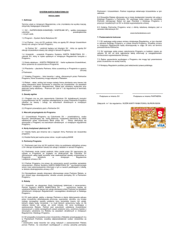 Partnerem i Uczestnikiem. Partner rozpatruje reklamacje Uczestników w tym zakresie. SYSTEM KARTA RABATOWA SV REGULAMIN 1. Definicje Terminy u yte w niniejszym Regulaminie, o ile z kontekstu nie wynika inaczej, otrzyma y nast puj ce znaczenie: 1.1 SV – SUPERVISION M.BARGIEL I WSPÓLNIK SP.j, spó ka zrzeszaj ca cz onków i przedsi biorców i innych osób. 6.5 Katalog Partnerów Programu wraz z ofert serwisie internetowym SV rabatow dost pny jest w www.kartarabatowa.com 7. Postanowienia ko cowe 1.2 Program – System Karta Rabatowa SV 1.3 a) Partner - inny ni SV podmiot, który za zgod SV oferuje Uczestnikom towary lub us ugi w ramach Programu. b) Partner SV - podmiot b cy ju klientem SV , który za zgod oferuje Uczestnikom towary lub us ugi w ramach Programu. 6.4 Wszystkie Rabaty oferowane s w miar dost pno ci towarów lub us ug z Katalogu Programu u Partnerów. SV zastrzega sobie prawo do wycofania Partnera oferuj cego Rabat lub jego Placówki z Katalogu Programu z przyczyn niezale nych od SV w drodze wypowiedzenia umowy. SV 1.4 Uczestnik - uczestnik Programu Systemu KARTA RABATOWA SV cz onek SV, który w trybie opisanym w niniejszym Regulaminie korzysta z Programu. 1.5 Karta rabatowa – KARTA PREMIUM SC - karta wydawana Uczestnikowi, która uprawnia do uczestnictwa w Programie. 7.1 SV zastrzega sobie prawo zmiany niniejszego Regulaminu, w tym równie w zakresie Katalogu Programu, w czasie trwania Programu. Wszelkie zmiany w niniejszym Regulaminie b obowi zywa y w ci gu 30 dniu od terminu powiadomienia Partnerów. 7.2 SV zastrzega sobie prawo zako czenia Programu w ka dym czasie po up ywie 30 dni od dnia og oszenia takiej informacji (z uwzgl dnieniem konieczno ci wypowiedzenia Umowy). 7.3 adne uprawnienia wynikaj ce z Programu nie mog przez Uczestnika na osob trzeci . 7.4 Niniejszy Regulamin poddany jest w by przeniesione ciwo ci prawa polskiego. 1.6 Placówka – placówka Partnera, która uczestniczy w Programie w oparciu o Umow z Partnerem. 1.7 Katalog Programu - lista towarów i us ug, oferowanych przez Partnerów Programu, które Uczestnicy mog nabywa z Rabatem. 1.8 Rabat – rabat, zni ka lub innego rodzaju forma obni enia ceny towaru lub us ug stosowana przez Partnerów w stosunku do Uczestników, na zasadach okre lonych niniejszym Regulaminem. Rabat jest udzielany wy cznie przy atno ci kart rabatow - Premium SV (za nr 1 do regulaminu) w terminalu atniczym. 2. Zasady ogólne Podpisano w imieniu SV 2.1 Program ma na celu zapewnienie Cz onkom SV dodatkowych korzy ci z przynale no ci do SV poprzez udost pnienie im przez Partnerów Programu rabatów na towary i us ugi, na warunkach okre lonych w niniejszym Regulaminie. 2.2 Program prowadzony jest u Partnerów SV. 3. Warunki przyst pienia do Programu 3.1 Uczestnikami Programu s Cz onkowie SV – przedsi biorcy, osoby fizyczne, identyfikuj cy si kart p atnicz / kredytow stworzon do celów rabatowych przez wyznaczony Bank przez SV , którzy zdecyduj si skorzysta z Programu na warunkach okre lonych w niniejszym regulaminie Programu. 4. Karty kredytowe/ p atnicze SV 4.1 Ka da Karta jest imienna lub z napisem firmy Partnera lub Uczestnika programu 4.2 Ka da Karta jest wa na przez okres na jaki wyda j BANK 5. Partnerzy Programu 5.1 Partnerem jest inny ni SV podmiot, który na podstawie oddzielnej umowy z SV oferuje Uczestnikom towary lub us ugi z rabatem w ramach Programu. 5.2 Partnerem mo e zosta podmiot, który zosta przez SV zaproszony do udzia u w Programie ze wzgl du na atrakcyjno dla Cz onków SV oferowanych us ug b wyrobów oraz zaakceptowa zasady uczestnictwa w Programie, okre lone w niniejszym Regulaminie i podpisze umow z SV. 5.3 Partner Programu ma prawo do oznaczania swoich punktów sprzeda y oznaczeniem „Partner Systemu KARTA RABATOWA SV ” wg dostarczonego wzoru oraz wykorzystywania informacji o tym w swoich publikacjach z ofert , w okresie obowi zywania umowy z SV. 5.4 Szczegó owe zasady dotycz ce oferowanego przez Partnera Rabatu, w tym okresu jego obowi zywania, okre la umowa pomi dzy SV a Partnerem Programu. 6. Rabaty 6.1 Uczestnik, za okazaniem Karty kredytowej /p atniczej z oznaczeniem„ Partner Systemu KARTA RABATOWA SV ‘’ , uprawniony b dzie do uzyskania Rabatu na towary lub us ugi oferowane przez Partnera na zasadach okre lonych niniejszym Regulaminem i szczegó owo okre lonych w Katalogu Programu. 6.2 W razie jednak, gdyby u danego Partnera w dacie dokonywania zakupu przez Uczestnika obowi zywa a promocja, wyprzeda , obni ka, czy innego rodzaju szczególne zasady ustalania ceny sprzeda y towaru lub us ugi, którymi obj ty by by Uczestnik, i w my l których uprawniony by by on do nabycia towaru lub us ugi, po cenie ni szej, ni cena wynikaj ca z zastosowania Rabatu, Partner pod warunkiem udzielania Uczestnikowi stosowanych u siebie szczególnych zasad ustalania ceny, zwolniony b dzie z obowi zku udzielenia mu Rabatu na zasadach okre lonych w niniejszym Regulaminie i Katalogu Programu. 6.3 W przypadku korzystania przez Uczestnika z Rabatów przys uguj cych mu w Placówkach Partnera, wszelk odpowiedzialno wobec Uczestnika za jako i ewentualne wady towarów lub us ug nabytych z zastosowaniem Rabatu ponosi Partner, na warunkach wynikaj cych z umowy zawartej pomi dzy Podpisano w imieniu PARTNERA Za cznik nr 1 do regulaminu WZÓR KARTY RABATOWEJ SUPERVISION