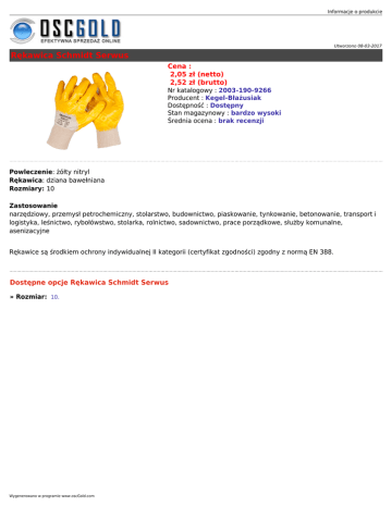 Informacje o produkcie Utworzono 08-03-2017 Rękawica Schmidt Serwus Cena : 2,05 zł (netto) 2,52 zł (brutto) Nr katalogowy : 2003-190-9266 Producent : Kegel-Błażusiak Dostępność : Dostępny Stan magazynowy : bardzo wysoki Średnia ocena : brak recenzji Powleczenie: żółty nitryl Rękawica: dziana bawełniana Rozmiary: 10 Zastosowanie narzędziowy, przemysł petrochemiczny, stolarstwo, budownictwo, piaskowanie, tynkowanie, betonowanie, transport i logistyka, leśnictwo, rybołówstwo, stolarka, rolnictwo, sadownictwo, prace porządkowe, służby komunalne, asenizacyjne Rękawice są środkiem ochrony indywidualnej II kategorii (certyfikat zgodności) zgodny z normą EN 388. Dostępne opcje Rękawica Schmidt Serwus » Rozmiar: 10. Wygenerowano w programie www.oscGold.com