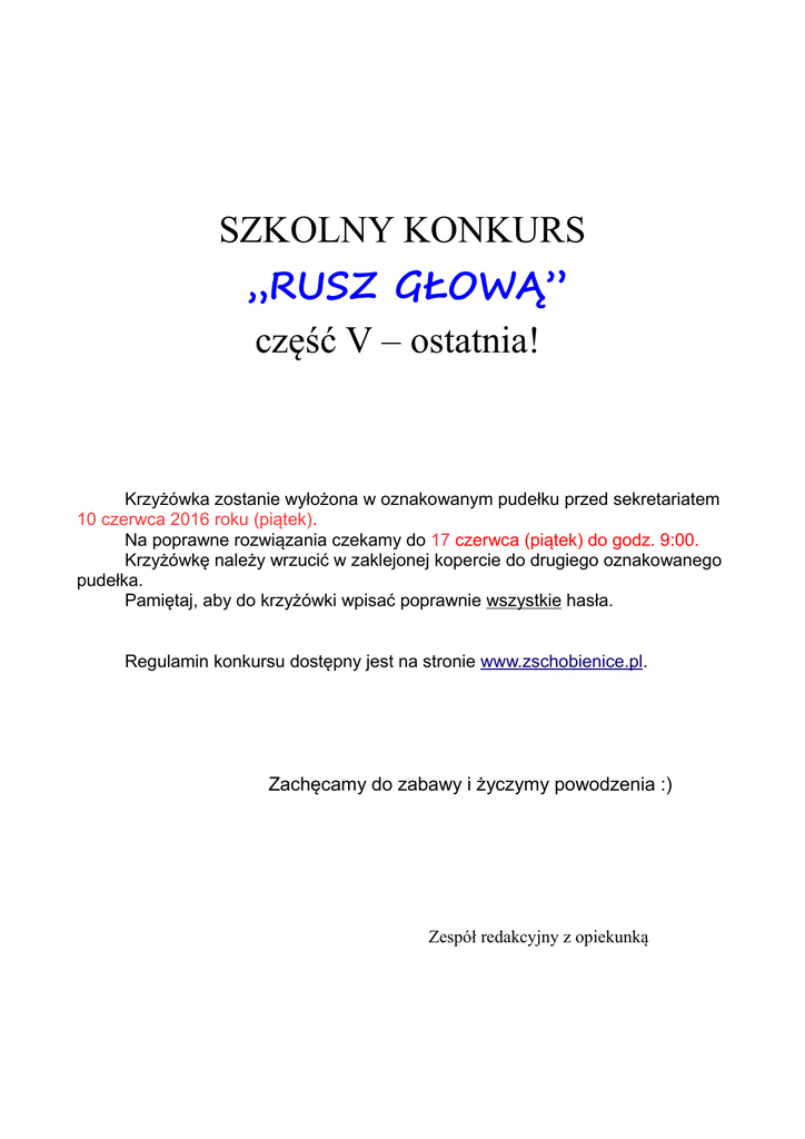 SZKOLNY KONKURS „RUSZ GŁOWĄ” część V – ostatnia! Krzyżówka zostanie wyłożona w oznakowanym pudełku przed sekretariatem 10 czerwca 2016 roku (piątek). Na poprawne rozwiązania czekamy do 17 czerwca (piątek) do godz. 9:00. Krzyżówkę należy wrzucić w zaklejonej kopercie do drugiego oznakowanego pudełka. Pamiętaj, aby do krzyżówki wpisać poprawnie wszystkie hasła. Regulamin konkursu dostępny jest na stronie www.zschobienice.pl. Zachęcamy do zabawy i życzymy powodzenia :) Zespół redakcyjny z opiekunką