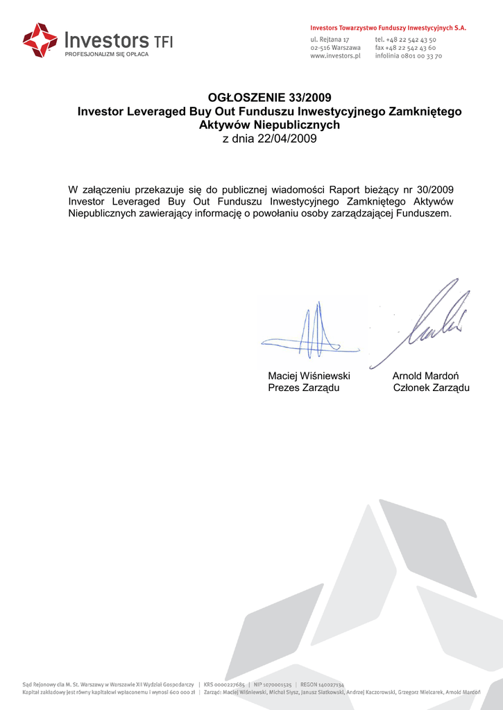 OGŁOSZENIE 33/2009 Investor Leveraged Buy Out Funduszu Inwestycyjnego Zamkniętego Aktywów Niepublicznych z dnia 22/04/2009 W załączeniu przekazuje się do publicznej wiadomości Raport bieżący nr 30/2009 Investor Leveraged Buy Out Funduszu Inwestycyjnego Zamkniętego Aktywów Niepublicznych zawierający informację o powołaniu osoby zarządzającej Funduszem. Maciej Wiśniewski Prezes Zarządu Arnold Mardoń Członek Zarządu INVESTOR LEVERAGED BUY OUT FIZ AKTYWÓW NIEPUBL. ZFP-E_3_07_06 korekta KOMISJA NADZORU FINANSOWEGO Raport bieżący nr 30 / 2009 (kolejny numer raportu / rok) Temat raportu: Informacja o powołaniu osoby zarządzającej lub nadzorującej fundusz Podstawa prawna: § 42 ust. 1pkt 32 rozporządzenia Ministra Finansów z dnia 19 lutego 2009 r. w sprawie informacji bieżących i okresowych przekazywanych przez emitentów papierów wartościowych oraz warunków uznawania za równoważne informacji wymaganych przepisami prawa państwa niebędącego państwem członkowskim (Dz. U. z 2009 r. Nr 33, poz. 259) Data przekazania: 2009-04-22 INVESTOR LEVERAGED BUY OUT FUNDUSZ INWESTYCYJNY ZAMKNIĘTY AKTYWÓW NIEPUBICZNYCH (pełna nazwa funduszu) INVESTOR LEVERAGED BUY OUT FIZ AKTYWÓW NIEPU INVESTORS TOWARZYSTWO FUNDUSZY INWESTYCYJNYCH S.A. (skróc ona nazwa funduszu) (nazwa towarzystwa) 02-516 WARSZAWA (kod pocztowy) (miejsc owość ) REJTANA 17/18 (ulica) ( numer) 22 542 43 75 22 542 43 60 (telefon) [email protected] (fax) 1080003744 141164519 (NIP) (e-mail) www.investors.pl (REGON) (WWW) KOREKTA RAPORTU: Plik Opis TREŚĆRAPORTU: l.p. imię Mac iej Plik MWCV.pdf nazwisko Wojtal zarządzanie lub nadzór Osoba zarządzając a opis kwalifikacji i doświadczeń zawodowych Opis znajduje się w załąc zeniu data powołania 2009-04-20 Opis Komisja Nadzoru Finansowego 1 INVESTOR LEVERAGED BUY OUT FIZ AKTYWÓW NIEPUBL. ZFP-E_3_07_06 PODPISYOSÓBREPREZENTUJĄCYCHPODMIOT Data Imię i Nazwisko Stanowisko / Funkcja 2009-04-22 Beata Sax Członek Zarządu 2009-04-22 Grzegorz Mielcarek Członek Zarządu Podpis Komisja Nadzoru Finansowego 2 Maciej Wojtal Doświadczenie zawodowe: 02.2009 – obecnie Investors TFI, Warszawa Zatrudniony jako zarzadzajacy portfelami funduszy. 03.2008 – 02.2009 J.P. Morgan, Proprietary Positioning Business, Londyn Współzarządzanie portfelem akcyjnym w dziale inwestycji wlasnych. 07.2006 – 02.2008 J.P. Morgan, Equity Derivatives Group, Londyn Strukturyzowanie oraz sprzedaż produktów inwestycyjnych opartych na derywatach. 06.2005 – 06.2006 Citigroup, Warszawa Analityk rynku kapitałowego w dziale analiz Domu Maklerskiego Banku Handlowego. 07.2004 – 05.2005 Citigroup, Warszawa Staż w różnych działach Domu Maklerskiego Banku Handlowego. Edukacja i kwalifikacje: 2002 – 2007 Uniwersytet Warszawski, Wydział Nauk Ekonomicznych Jednoczesne Studia Ekonomiczno–Menedżerskie 07.2007 – 08.2007 J.P. Morgan Markets Training, Nowy Jork Licencja FSA (Financial Services Authority) – securities, derivatives, commodities Języki: polski: ojczysty angielski: płynnie niemiecki: dobry rosyjski: podstawowy
