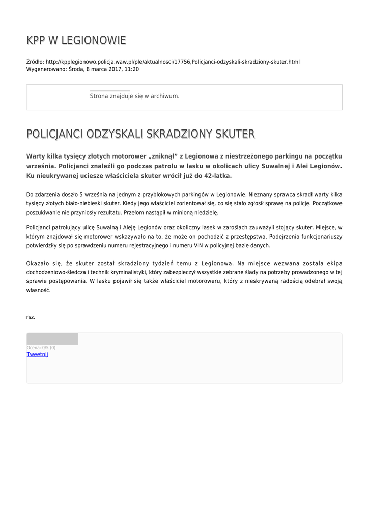 KPP W LEGIONOWIE Źródło: http://kpplegionowo.policja.waw.pl/ple/aktualnosci/17756,Policjanci-odzyskali-skradziony-skuter.html Wygenerowano: Środa, 8 marca 2017, 11:20 Strona znajduje się w archiwum. POLICJANCI ODZYSKALI SKRADZIONY SKUTER Warty kilka tysięcy złotych motorower „zniknął” z Legionowa z niestrzeżonego parkingu na początku września. Policjanci znaleźli go podczas patrolu w lasku w okolicach ulicy Suwalnej i Alei Legionów. Ku nieukrywanej uciesze właściciela skuter wrócił już do 42-latka. Do zdarzenia doszło 5 września na jednym z przyblokowych parkingów w Legionowie. Nieznany sprawca skradł warty kilka tysięcy złotych biało-niebieski skuter. Kiedy jego właściciel zorientował się, co się stało zgłosił sprawę na policję. Początkowe poszukiwanie nie przyniosły rezultatu. Przełom nastąpił w minioną niedzielę. Policjanci patrolujący ulicę Suwalną i Aleję Legionów oraz okoliczny lasek w zaroślach zauważyli stojący skuter. Miejsce, w którym znajdował się motorower wskazywało na to, że może on pochodzić z przestępstwa. Podejrzenia funkcjonariuszy potwierdziły się po sprawdzeniu numeru rejestracyjnego i numeru VIN w policyjnej bazie danych. Okazało się, że skuter został skradziony tydzień temu z Legionowa. Na miejsce wezwana została ekipa dochodzeniowo-śledcza i technik kryminalistyki, który zabezpieczył wszystkie zebrane ślady na potrzeby prowadzonego w tej sprawie postępowania. W lasku pojawił się także właściciel motoroweru, który z nieskrywaną radością odebrał swoją własność. rsz. Ocena: 0/5 (0) Tweetnij