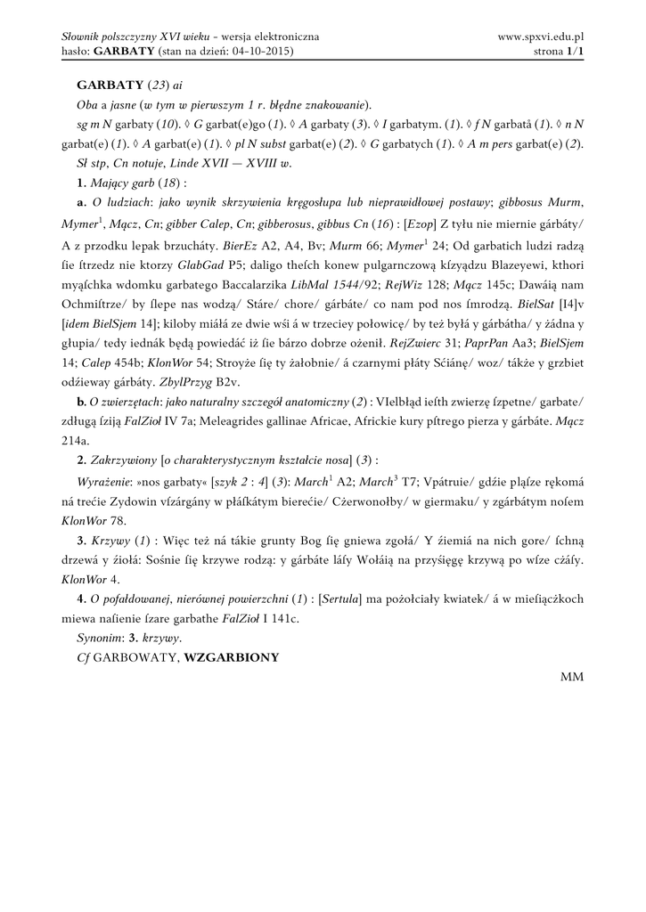 Słownik polszczyzny XVI wieku - wersja elektroniczna hasło: GARBATY (stan na dzień: 04-10-2015) www.spxvi.edu.pl strona 1/1 GARBATY (23) ai Oba a jasne (w tym w pierwszym 1 r. błędne znakowanie). sg m N garbaty (10). ◊ G garbat(e)go (1). ◊ A garbaty (3). ◊ I garbatym. (1). ◊ f N garbatå (1). ◊ n N garbat(e) (1). ◊ A garbat(e) (1). ◊ pl N subst garbat(e) (2). ◊ G garbatych (1). ◊ A m pers garbat(e) (2). Sł stp, Cn notuje, Linde XVII — XVIII w. 1. Mający garb (18) : a. O ludziach: jako wynik skrzywienia kręgosłupa lub nieprawidłowej postawy; gibbosus Murm, Mymer1, Mącz, Cn; gibber Calep, Cn; gibberosus, gibbus Cn (16) : [Ezop] Z tyłu nie miernie gárbáty/ A z przodku lepak brzucháty. BierEz A2, A4, Bv; Murm 66; Mymer1 24; Od garbatich ludzi radzą ſie ſtrzedz nie ktorzy GlabGad P5; daligo theſch konew pulgarnczową kſzyądzu Blazeyewi, kthori myąſchka wdomku garbatego Baccalarzika LibMal 1544/92; RejWiz 128; Mącz 145c; Dawáią nam Ochmiſtrze/ by ſlepe nas wodzą/ Stáre/ chore/ gárbáte/ co nam pod nos ſmrodzą. BielSat [I4]v [idem BielSjem 14]; kiloby miáłá ze dwie wśi á w trzeciey połowicę/ by też byłá y gárbátha/ y żádna y głupia/ tedy iednák będą powiedáć iż ſie bárzo dobrze ożenił. RejZwierc 31; PaprPan Aa3; BielSjem 14; Calep 454b; KlonWor 54; Stroyże ſię ty żałobnie/ á czarnymi płáty Sćiánę/ woz/ tákże y grzbiet odźieway gárbáty. ZbylPrzyg B2v. b. O zwierzętach: jako naturalny szczegół anatomiczny (2) : VIelbłąd ieſth zwierzę ſzpetne/ garbate/ zdługą ſziją FalZioł IV 7a; Meleagrides gallinae Africae, Africkie kury pſtrego pierza y gárbáte. Mącz 214a. 2. Zakrzywiony [o charakterystycznym kształcie nosa] (3) : Wyrażenie: »nos garbaty« [szyk 2 : 4] (3): March1 A2; March3 T7; Vpátruie/ gdźie pląſze rękomá ná trećie Zydowin vſzárgány w płáſkátym bierećie/ Cżerwonołby/ w giermaku/ y zgárbátym noſem KlonWor 78. 3. Krzywy (1) : Więc też ná tákie grunty Bog ſię gniewa zgołá/ Y źiemiá na nich gore/ ſchną drzewá y źiołá: Sośnie ſię krzywe rodzą: y gárbáte láſy Wołáią na przyśięgę krzywą po wſze cżáſy. KlonWor 4. 4. O pofałdowanej, nierównej powierzchni (1) : [Sertula] ma pożołciały kwiatek/ á w mieſiącżkoch miewa naſienie ſzare garbathe FalZioł I 141c. Synonim: 3. krzywy. Cf GARBOWATY, WZGARBIONY MM