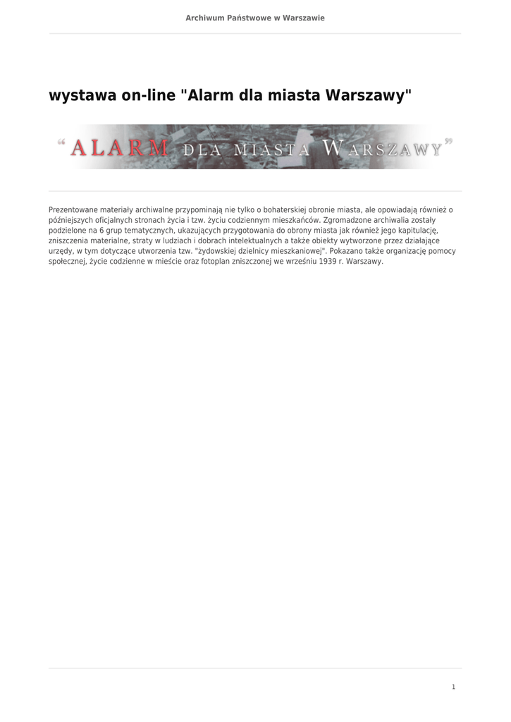 Archiwum Państwowe w Warszawie wystawa on-line "Alarm dla miasta Warszawy" Prezentowane materiały archiwalne przypominają nie tylko o bohaterskiej obronie miasta, ale opowiadają również o późniejszych oficjalnych stronach życia i tzw. życiu codziennym mieszkańców. Zgromadzone archiwalia zostały podzielone na 6 grup tematycznych, ukazujących przygotowania do obrony miasta jak również jego kapitulację, zniszczenia materialne, straty w ludziach i dobrach intelektualnych a także obiekty wytworzone przez działające urzędy, w tym dotyczące utworzenia tzw. "żydowskiej dzielnicy mieszkaniowej". Pokazano także organizację pomocy społecznej, życie codzienne w mieście oraz fotoplan zniszczonej we wrześniu 1939 r. Warszawy. 1