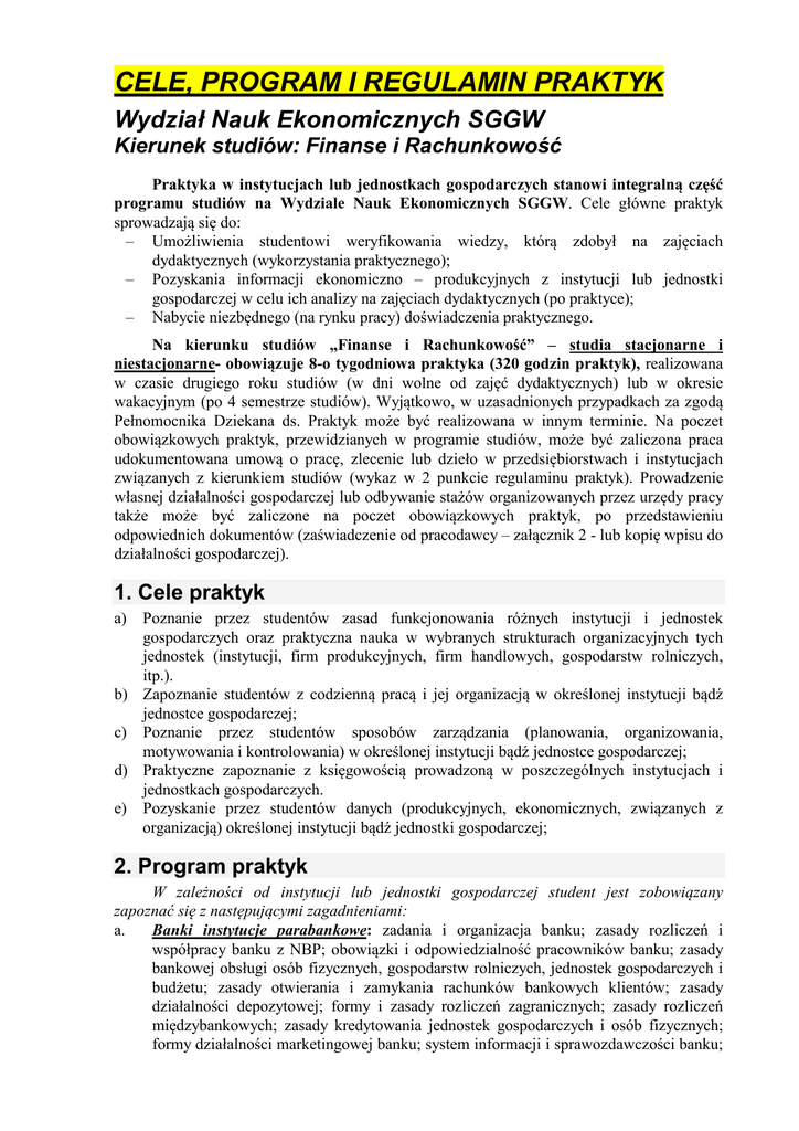 CELE, PROGRAM I REGULAMIN PRAKTYK Wydział Nauk Ekonomicznych SGGW Kierunek studiów: Finanse i Rachunkowość Praktyka w instytucjach lub jednostkach gospodarczych stanowi integralną część programu studiów na Wydziale Nauk Ekonomicznych SGGW. Cele główne praktyk sprowadzają się do: – Umożliwienia studentowi weryfikowania wiedzy, którą zdobył na zajęciach dydaktycznych (wykorzystania praktycznego); – Pozyskania informacji ekonomiczno – produkcyjnych z instytucji lub jednostki gospodarczej w celu ich analizy na zajęciach dydaktycznych (po praktyce); – Nabycie niezbędnego (na rynku pracy) doświadczenia praktycznego. Na kierunku studiów „Finanse i Rachunkowość” – studia stacjonarne i niestacjonarne- obowiązuje 8-o tygodniowa praktyka (320 godzin praktyk), realizowana w czasie drugiego roku studiów (w dni wolne od zajęć dydaktycznych) lub w okresie wakacyjnym (po 4 semestrze studiów). Wyjątkowo, w uzasadnionych przypadkach za zgodą Pełnomocnika Dziekana ds. Praktyk może być realizowana w innym terminie. Na poczet obowiązkowych praktyk, przewidzianych w programie studiów, może być zaliczona praca udokumentowana umową o pracę, zlecenie lub dzieło w przedsiębiorstwach i instytucjach związanych z kierunkiem studiów (wykaz w 2 punkcie regulaminu praktyk). Prowadzenie własnej działalności gospodarczej lub odbywanie stażów organizowanych przez urzędy pracy także może być zaliczone na poczet obowiązkowych praktyk, po przedstawieniu odpowiednich dokumentów (zaświadczenie od pracodawcy – załącznik 2 - lub kopię wpisu do działalności gospodarczej). 1. Cele praktyk a) Poznanie przez studentów zasad funkcjonowania różnych instytucji i jednostek gospodarczych oraz praktyczna nauka w wybranych strukturach organizacyjnych tych jednostek (instytucji, firm produkcyjnych, firm handlowych, gospodarstw rolniczych, itp.). b) Zapoznanie studentów z codzienną pracą i jej organizacją w określonej instytucji bądź jednostce gospodarczej; c) Poznanie przez studentów sposobów zarządzania (planowania, organizowania, motywowania i kontrolowania) w określonej instytucji bądź jednostce gospodarczej; d) Praktyczne zapoznanie z księgowością prowadzoną w poszczególnych instytucjach i jednostkach gospodarczych. e) Pozyskanie przez studentów danych (produkcyjnych, ekonomicznych, związanych z organizacją) określonej instytucji bądź jednostki gospodarczej; 2. Program praktyk W zależności od instytucji lub jednostki gospodarczej student jest zobowiązany zapoznać się z następującymi zagadnieniami: a. Banki instytucje parabankowe: zadania i organizacja banku; zasady rozliczeń i współpracy banku z NBP; obowiązki i odpowiedzialność pracowników banku; zasady bankowej obsługi osób fizycznych, gospodarstw rolniczych, jednostek gospodarczych i budżetu; zasady otwierania i zamykania rachunków bankowych klientów; zasady działalności depozytowej; formy i zasady rozliczeń zagranicznych; zasady rozliczeń międzybankowych; zasady kredytowania jednostek gospodarczych i osób fizycznych; formy działalności marketingowej banku; system informacji i sprawozdawczości banku; rodzaje kont; system księgowości analitycznej i syntetycznej; wyniki finansowe banku, przemiany strukturalne w bankowości. b. Urzędy Skarbowe: zakres działalności, zadania i organizacja urzędu skarbowego; podstawowe informacje dotyczące przepisów podatkowych; obowiązki i odpowiedzialność pracowników urzędu skarbowego; zasady ewidencji podmiotów gospodarczych i osób fizycznych; tryb postępowania i dokumentacja rozpoczęcia działalności gospodarczej; podstawowe zasady naliczania podatków, udzielania ulg i zwolnień podatkowych; zasady dokumentacji księgowej; charakterystyka funkcji kontrolnych urzędu skarbowego; organizacja systemu rozliczeń urzędu skarbowego z bankiem i budżetem. c. Firmy ubezpieczeniowe: zadania i organizacja firmy ubezpieczeniowej (w tym również KRUS); zasady rozliczeń finansowych z klientami; obowiązki i odpowiedzialność pracowników; zasady obsługi osób fizycznych, jednostek gospodarczych i budżetu; zasady różnych form ubezpieczeń; formy i zasady rozliczeń zagranicznych; zasady działalności kapitałowej firmy ubezpieczeniowej; formy działalności marketingowych prowadzonych przez firmę; system informacji i sprawozdawczości firmy ubezpieczeniowej, rodzaje kont; system księgowości analitycznej i syntetycznej; wyniki finansowe firmy. d. Biura maklerskie: zakres działalności, zadania i organizacja biura maklerskiego; podstawowe informacje dotyczące podstaw prawnych działalności biura; obowiązki i odpowiedzialność pracowników; zasady otwierania i prowadzenia rachunków klientów; zasady przekazywania zleceń na WGPW; zakres odpowiedzialności biura maklerskiego za przyjęte zlecenia; zasady dokumentacji księgowej; powiązanie biura maklerskiego z bankiem i budżetem; wyniki finansowe biura maklerskiego. e. Firmy leasingowe i fundusze powiernicze: zakres działalności, zadania i organizacja firmy (funduszu); podstawowe informacje dotyczące podstaw prawnych działalności firmy leasingowej (funduszu); obowiązki i odpowiedzialność pracowników; zasady otwierania i prowadzenia rachunków klientów; zasady dokumentacji księgowej; powiązanie firmy leasingowej (funduszu) z bankiem i budżetem; wyniki finansowe firmy leasingowej (funduszu); warianty lokowania środków pieniężnych w funduszu powierniczym; portfel inwestycyjny funduszu powierniczego; ryzyko w działalności firmy leasingowej i funduszu powierniczego. f. Firmy produkcyjne i handlowe prowadzące pełną księgowość (mleczarnia, zakład przetwórstwa rolnego i inne): organizacja firmy produkcyjnej (handlowej) i przepisy regulujące jej działalność; warunki i organizacja zaopatrzenia i procesu sprzedaży; zasady rozliczeń finansowych z kontrahentami, budżetami i instytucjami ubezpieczeniowymi; zakres i organizacja dzia