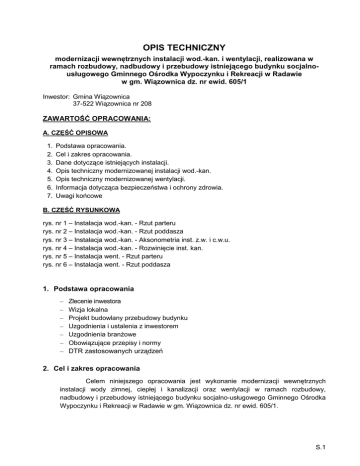 OPIS TECHNICZNY modernizacji wewnętrznych instalacji wod.-kan. i wentylacji, realizowana w ramach rozbudowy, nadbudowy i przebudowy istniejącego budynku socjalnousługowego Gminnego Ośrodka Wypoczynku i Rekreacji w Radawie w gm. Wiązownica dz. nr ewid. 605/1 Inwestor: Gmina Wiązownica 37-522 Wiązownica nr 208 ZAWARTOŚĆ OPRACOWANIA: A. CZĘŚĆ OPISOWA 1. 2. 3. 4. 5. 6. 7. Podstawa opracowania. Cel i zakres opracowania. Dane dotyczące istniejących instalacji. Opis techniczny modernizowanej instalacji wod.-kan. Opis techniczny modernizowanej wentylacji. Informacja dotycząca bezpieczeństwa i ochrony zdrowia. Uwagi końcowe B. CZĘŚĆ RYSUNKOWA rys. nr 1 – Instalacja wod.-kan. - Rzut parteru rys. nr 2 – Instalacja wod.-kan. - Rzut poddasza rys. nr 3 – Instalacja wod.-kan. - Aksonometria inst. z.w. i c.w.u. rys. nr 4 – Instalacja wod.-kan. - Rozwinięcie inst. kan. rys. nr 5 – Instalacja went. - Rzut parteru rys. nr 6 – Instalacja went. - Rzut poddasza 1. Podstawa opracowania – – – – – – – Zlecenie inwestora Wizja lokalna Projekt budowlany przebudowy budynku Uzgodnienia i ustalenia z inwestorem Uzgodnienia branżowe Obowiązujące przepisy i normy DTR zastosowanych urządzeń 2. Cel i zakres opracowania Celem niniejszego opracowania jest wykonanie modernizacji wewnętrznych instalacji wody zimnej, ciepłej i kanalizacji oraz wentylacji w ramach rozbudowy, nadbudowy i przebudowy istniejącego budynku socjalno-usługowego Gminnego Ośrodka Wypoczynku i Rekreacji w Radawie w gm. Wiązownica dz. nr ewid. 605/1. S.1 Zakres opracowania obejmuje część sanitarną robót budowlanych przewidzianych do realizacji w ramach przebudowy budynku. 3. Dane dotyczące istniejących instalacji Przebudowywany, rozbudowywany i nadbudowany budynek socjalno-usługowy wykorzystywany jest sezonowo w okresie letnim. W stanie istniejącym wyposażony jest w instalacje wod.-kan. i wentylacji grawitacyjnej. Ponieważ budynek jest wykorzystywany sezonowo, nie ma w nim żadnego systemu ogrzewania. Z uwagi na planowane prace inwestycyjne w budynku związane z rozbudową budynku oraz zmianę rozkładu niektórych pomieszczeń, konieczne jest przeprowadzenie modernizacji istniejących instalacji w zakresie dostosowania ich do nowych potrzeb. Ponieważ budynek po przebudowie nadal będzie wykorzystywany jedynie latem, nie planuje się wyposażać go w instalację grzewczą. Przebudowie będą podlegać jedynie instalacje wod.-kan. i wentylacji oraz istniejący przykanalik z uwagi na kolizję z konstrukcją rozbudowywanej części budynku. 4. Opis techniczny modernizowanej instalacji wod.-kan. Projektuje się nowe instalacje z.w. i c.w.u. w obrębie przebudowywanych pomieszczeń. Istniejące obecnie rurociągi tworzywowe wody zimnej i ciepłej należy zdemontować. Trasy projektowanych instalacji oraz dokładne lokalizacje poszczególnych przyborów sanitarnych i ich rodzaje zostały przedstawione w części graficznej opracowania. Projektowaną instalację w.z. i c.w.u. należy wykonać w systemie firmy Comap z rur wielowarstwowych typu Multiskin (PEX/AL/PEX) łączonych przy pomocy łączników zaprasowywanych Sudo Press. Projektowaną instalację należy podłączyć do istniejącej w miejscach wskazanych w części graficznej opracowania.. Przewody rozprowadzające i podejścia do punktów czerpalnych prowadzić w bruzdach ściennych zgodnie z trasą przedstawioną w części graficznej opracowania. Przewody poziome prowadzić na wysokości ok. 2,3m w taki sposób by możliwe było odwodnienie całej instalacji na okres zimowy. Po zakończeniu robót montażowych instalacji z.w. i c.w.u., przed ich zakryciem oraz przed wykonaniem izolacji termicznej rurociągów, należy wykonać próbę szczelności rurociągów na ciśnienie 0,9 MPa. Próbę szczelności należy przeprowadzić zgodnie z wytycznymi zawartymi w Warunkach Technicznych Wykonania i Odbioru Instalacji wodociągowych oraz Warunkach Technicznych Wykonania i Odbioru Rurociągów z tworzyw sztucznych. Rurociągi wykonane z rur z tworzyw sztucznych nie wymagają wykonywania dodatkowego zabezpieczenia antykorozyjnego, dlatego po przeprowadzeniu badania szczelności rurociągów i po ich dokładnym przepłukaniu, można przystąpić do wykonywania izolacji termicznej rurociągów. Wszystkie przewody ciepłej i zimnej wody, należy zaizolować termicznie stosując otuliny termoizolacyjne Thermaflex o grubości 13 mm. Wszelkie odstępstwa od projektu odnośnie ułożenia rur wymagają akceptacji projektanta. W związku z przebudową pomieszczeń i pojawieniem się nowych przyborów sanitarnych, projektuje się również modernizację kanalizacji sanitarnej. S.2 Projektuje się demontaż istniejących pionów żeliwnych i ich podłączeń, oraz odpływów z likwidowanych przyborów sanitarnych. Projektuje się również przebudowę głównego przewodu odprowadzającego ścieki z budynku wraz z istniejącym przykanalikiem. Projektuje się nowe piony kanalizacyjne, zgodnie z lokalizacją przedstawioną w części graficznej. Projektowane piony należy podłączyć do przebudowywanych i nowych przewodów odpływowych z budynku (poziomów) oraz wyprowadzić ponad dach i zakończyć wywiewkami oraz zaworami napowietrzającymi. Należy wykonać nowe podłączenia odpływowe dla projektowanych przyborów sanitarnych. Projektuje się je z rur i kształtek PVC produkcji WAVIN, łączonych kielichowo za pomocą fabrycznie wmontowanych uszczelek gumowych. Przewody odpływowe z przyborów sanitarnych należy układać w bruzdach ściennych oraz pod posadzką, a następnie podłączyć do projektowanych pionów. Główne przewody odpływowe z budynku (poziomy) należy wykonać z rur PCV, kielichowych prod. Wavin lub Gamrat. Nowy przykanalik, należy wykonać z rur PCV, kielichowych, typ PVC-U lite, klasy S, SDR34; SN8, zgodnie z PN-EN 1401-1 prod. Wavin lub Gamrat. Projektowaną studzienkę rewizyjną S1 należy wykonać jako tworzywową Dn400