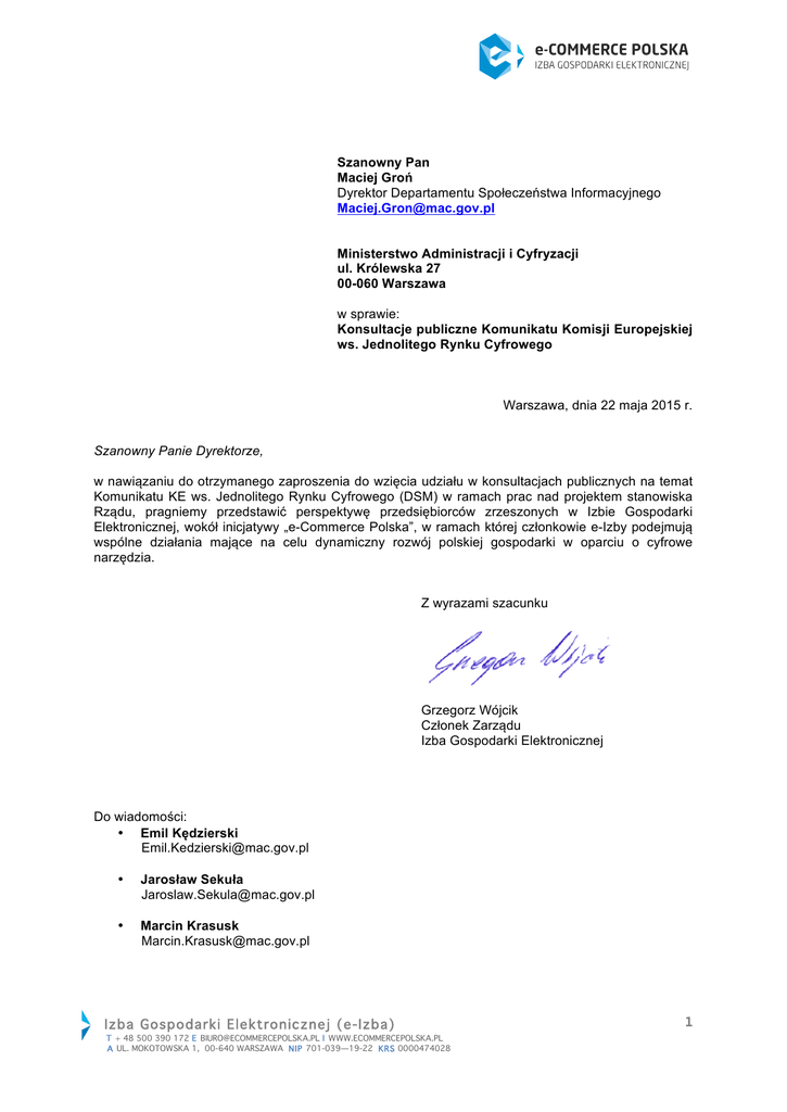 Szanowny Pan Maciej Groń Dyrektor Departamentu Społeczeństwa Informacyjnego [email protected] Ministerstwo Administracji i Cyfryzacji ul. Królewska 27 00-060 Warszawa w sprawie: Konsultacje publiczne Komunikatu Komisji Europejskiej ws. Jednolitego Rynku Cyfrowego Warszawa, dnia 22 maja 2015 r. Szanowny Panie Dyrektorze, w nawiązaniu do otrzymanego zaproszenia do wzięcia udziału w konsultacjach publicznych na temat Komunikatu KE ws. Jednolitego Rynku Cyfrowego (DSM) w ramach prac nad projektem stanowiska Rządu, pragniemy przedstawić perspektywę przedsiębiorców zrzeszonych w Izbie Gospodarki Elektronicznej, wokół inicjatywy „e-Commerce Polska”, w ramach której członkowie e-Izby podejmują wspólne działania mające na celu dynamiczny rozwój polskiej gospodarki w oparciu o cyfrowe narzędzia. Z wyrazami szacunku Grzegorz Wójcik Członek Zarządu Izba Gospodarki Elektronicznej Do wiadomości: • Emil Kędzierski [email protected] • Jarosław Sekuła [email protected] • Marcin Krasusk [email protected] Izba Gospodarki Elektronicznej (e-Izba) T + 48 500 390 172 E [email protected] I WWW.ECOMMERCEPOLSKA.PL A UL. MOKOTOWSKA 1, 00-640 WARSZAWA NIP 701-039—19-22 KRS 0000474028 1 WSTĘP ............................................................................................................................................. 3 1. POTRZEBY JEDNOLITEGO RYNKU CYFROWEGO ............................................................................ 5 1.1. Lepszy dostęp do towarów i usług dla konsumentów i biznesu .............................................. 5 1.2. Stworzenie odpowiednich warunków dla sieci i usług cyfrowych ........................................... 6 1.3. Maksymalizacja potencjału wzrostu europejskiej gospodarki cyfrowej .................................. 6 2. LEPSZY DOSTĘP DLA KONSUMENTÓW I PRZEDSIĘBIORSTW DO SIECI W CAŁEJ EUROPIE .............. 7 2.1. Zasady sprzedaży zagranicznej, którym konsumenci i przedsiębiorcy będą mogli zaufać ........ 7 2.2. Dostawa paczek transgranicznych w wysokiej jakości i przystępnej cenie .............................. 7 2.3. Zapobieganie nieuzasadnionemu geo-‐blokowaniu ................................................................. 8 2.4. Lepszy dostęp do treści cyfrowych -‐ nowoczesne, bardziej europejskie ramy prawa autorskiego ......................................................................................................................... 10 2.5. Zmniejszenie obowiązków i przeszkód związanych z podatkiem VAT w sprzedaży ponad granicami ............................................................................................................................. 11 3. LEPSZY DOSTĘP DO SIECI DLA KONSUMENTÓW I PRZEDSIĘBIORSTW W CAŁEJ EUROPIE ........... 11 3.1. Tworzenie zasad dla telekomunikacji służących celom DSM ................................................. 11 3.2. Ramy dla środowiska medialnego na miarę XXI wieku ......................................................... 12 3.3. Środowisko prawne dla platform i pośredników internetowych .......................................... 12 3.3.1. Rola platform internetowych ............................................................................................... 13 3.3.2. Zwalczanie nielegalnych treści w Internecie ......................................................................... 13 3.4. Wzmocnienie zaufania i bezpieczeństwa w zakresie usług cyfrowych i przetwarzania danych osobowych .......................................................................................................................... 13 4. MAKSYMALIZACJA POTENCJAŁU WZROSTU GOSPODARKI ELEKTRONICZNEJ .............................. 14 4.1. Budowanie gospodarki w oparciu o dane ............................................................................. 14 4.2. Zwiększenie konkurencyjności poprzez interoperacyjność i standaryzację ........................... 14 4.3. Społeczeństwo wkluczone cyfrowo ...................................................................................... 14 4.4. Cyfrowe kompetencje i wiedza ............................................................................................ 14 4.5. E-‐administracja .................................................................................................................... 15 5. REALIZACJA JEDNOLITEGO RYNKU CYFROWEGO .......................................................... 15 Izba Gospodarki Elektronicznej (e-Izba) T + 48 500 390 172 E [email protected] I WWW.ECOMMERCEPOLSKA.PL A UL. MOKOTOWSKA 1, 00-640 WARSZAWA NIP 701-039—19-22 KRS 0000474028 2 WSTĘP Komisja Europejska właściwie ocenia potencjał rozwoju Europy w globalnej gospodarce dzięki wsparciu dla cyfrowych rozwiązań • • • Zgadzamy się z Komisją Europejską, że europejskie kraje członkowskie, działając razem jako Unia Europejska, dysponują niezbędnymi aktywami i potencjałem intelektualnym do osiągnięcia sukcesu w globalnej gospodarce cyfrowej; Jesteśmy przekonani, że dzięki wyeksponowaniu strategii ujednolicenia rynku cyfrowego wykorzystane zostaną nowe możliwości, a także rozpocznie się proces szybszej edukacji decydentów, skutkujący większą otwartością na zmiany i pozytywnym nastawieniem do wykorzystania rozwiązań cyfrowych, w celu rozwoju osobistego oraz europejskiej przedsiębiorczości; Liczymy na to, że w pracach nad zdefiniowanymi celami, odrzucane będą te działania, które służą ograniczaniu swobody budowania innowacyjnych rozwiązań produktowych oraz nowych modeli biznesowych, a przeważy intencja zagwarantowania Europie przyszłości nieskrępowanego tworzenia światowej klasy oferty, tworzonej już w pierwszej fazie rozwoju z intencją międzynarodowej dystrybucji, a przede wszystkim jej łatwego eksportu zarówno na rynek wewnątrzunijny oraz globalnie przez małe i średnie przedsiębiorstwa, które stanowią dzisiaj podstawę n