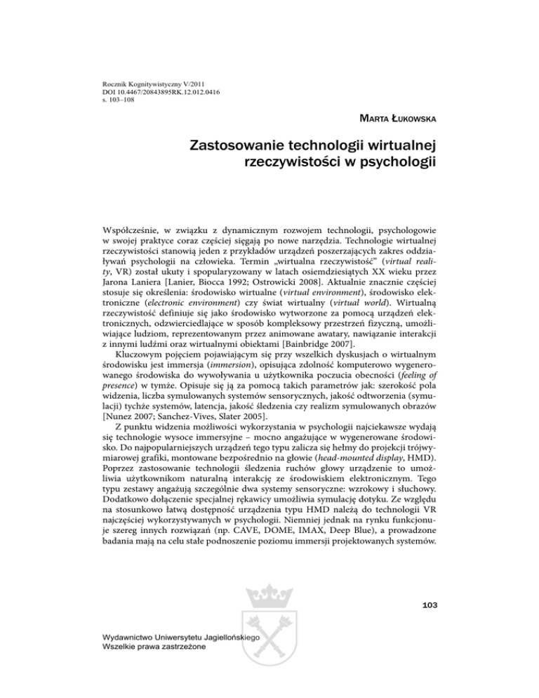 Rocznik Kognitywistyczny V/2011 DOI 10.4467/20843895RK.12.012.0416 s. 103–108 MARTA ŁUKOWSKA Zastosowanie technologii wirtualnej rzeczywistości w psychologii Współcześnie, w związku z dynamicznym rozwojem technologii, psychologowie w swojej praktyce coraz częściej sięgają po nowe narzędzia. Technologie wirtualnej rzeczywistości stanowią jeden z przykładów urządzeń poszerzających zakres oddziaływań psychologii na człowieka. Termin „wirtualna rzeczywistość” (virtual reality, VR) został ukuty i spopularyzowany w latach osiemdziesiątych XX wieku przez Jarona Laniera [Lanier, Biocca 1992; Ostrowicki 2008]. Aktualnie znacznie częściej stosuje się określenia: środowisko wirtualne (virtual environment), środowisko elektroniczne (electronic environment) czy świat wirtualny (virtual world). Wirtualną rzeczywistość definiuje się jako środowisko wytworzone za pomocą urządzeń elektronicznych, odzwierciedlające w sposób kompleksowy przestrzeń fizyczną, umożliwiające ludziom, reprezentowanym przez animowane awatary, nawiązanie interakcji z innymi ludźmi oraz wirtualnymi obiektami [Bainbridge 2007]. Kluczowym pojęciem pojawiającym się przy wszelkich dyskusjach o wirtualnym środowisku jest immersja (immersion), opisująca zdolność komputerowo wygenerowanego środowiska do wywoływania u użytkownika poczucia obecności (feeling of presence) w tymże. Opisuje się ją za pomocą takich parametrów jak: szerokość pola widzenia, liczba symulowanych systemów sensorycznych, jakość odtworzenia (symulacji) tychże systemów, latencja, jakość śledzenia czy realizm symulowanych obrazów [Nunez 2007; Sanchez-Vives, Slater 2005]. Z punktu widzenia możliwości wykorzystania w psychologii najciekawsze wydają się technologie wysoce immersyjne – mocno angażujące w wygenerowane środowisko. Do najpopularniejszych urządzeń tego typu zalicza się hełmy do projekcji trójwymiarowej grafiki, montowane bezpośrednio na głowie (head-mounted display, HMD). Poprzez zastosowanie technologii śledzenia ruchów głowy urządzenie to umożliwia użytkownikom naturalną interakcję ze środowiskiem elektronicznym. Tego typu zestawy angażują szczególnie dwa systemy sensoryczne: wzrokowy i słuchowy. Dodatkowo dołączenie specjalnej rękawicy umożliwia symulację dotyku. Ze względu na stosunkowo łatwą dostępność urządzenia typu HMD należą do technologii VR najczęściej wykorzystywanych w psychologii. Niemniej jednak na rynku funkcjonuje szereg innych rozwiązań (np. CAVE, DOME, IMAX, Deep Blue), a prowadzone badania mają na celu stałe podnoszenie poziomu immersji projektowanych systemów. 103 Wydawnictwo Uniwersytetu Jagiellońskiego Wszelkie prawa zastrzeżone MARTA ŁUKOWSKA Środowisko wirtualne w służbie psychologii Dzięki możliwości wygenerowania bardzo realistycznego środowiska, podlegającego wysokiej kontroli ze strony projektanta, technologie wirtualnej rzeczywistości znajdują szerokie zastosowanie na różnych polach działalności psychologów. Symulacja środowiska elektronicznego wykorzystywana jest między innymi w terapii, diagnozie, do rehabilitacji oraz jako narzędzie w psychologii eksperymentalnej. W każdej z powyższych dziedzin podstawowymi zaletami odróżniającymi technologie VR od innych narzędzi [Riva, Galimberti 2003] są: 1. wysoka trafność ekologiczna, 2. elastyczność stosowanych systemów, 3. zapewnienie polisensorycznej informacji zwrotnej w czasie rzeczywistym, 4. możliwość ścisłej rejestracji zachowań użytkownika. Wszystkie wymienione zalety czynią z tych systemów narzędzia cenne i nowoczesne, dlatego nie dziwi fakt coraz powszechniejszego ich stosowania [Knight, Titov 2009; Rizzo i in. 2004]. W dalszej części pracy dla zilustrowania możliwości zastosowania technologii wirtualnej rzeczywistości zostaną przedstawione przykłady dotychczasowego wykorzystania tychże metod w praktyce psychologicznej. VR w terapii Jednymi z pierwszych odkrywców technologii VR dla psychologii byli terapeuci behawioralni. Dostrzegli oni możliwość wykorzystania dowolnie zaprojektowanego wirtualnego środowiska bodźcowego w terapii poprzez ekspozycję. Tym sposobem powstał nurt VRET – virtual reality exposure therapy. Podstawową zaletą zastosowania wirtualnego środowiska w tego typu zabiegach terapeutycznych jest możliwość skonfrontowania pacjenta ze środowiskiem fobicznym bez konieczności faktycznego narażania go na kontakt z fizycznym bodźcem. Wykorzystanie wysoce immersyjnych technologii zdaje się przynosić lepsze efekty niż wykorzystanie technik wyobrażania [Parsons, Rizzo 2008]. Podejście VRET aplikuje się najczęściej w leczeniu zespołu stresu pourazowego (post-traumatic stress disorder, PTSD) [Difede i in. 2006], fobii specyficznych i zaburzeń lękowych [Parsons, Rizzo 2008], w tym najczęściej arachnofobii [Bouchard i in. 2006] i lęku społecznego [Rothbaum 2005]. Podczas terapii behawioralnej z użyciem środowiska wirtualnego przeprowadza się standardową procedurę kontrolowanej ekspozycji na bodziec będący źródłem lęku. Procedurę prowadzi się aż do wygaszenia dysfunkcyjnej reakcji. 104 Wydawnictwo Uniwersytetu Jagiellońskiego Wszelkie prawa zastrzeżone Zastosowanie technologii wirtualnej rzeczywistości w psychologii Diagnoza i trening funkcji poznawczych Możliwość zaprojektowania dowolnie wybranego środowiska stanowi ważny atut technologii wirtualnej rzeczywistości, wykorzystywany w procesie diagnozy, terapii i rehabilitacji funkcji poznawczych. Pozwalają one skonstruować zadania w wysoce realistycznym i angażującym środowisku, podlegające wysokiej kontroli ze strony projektanta. Dlatego technologie VR wykorzystuje się przy kreowaniu systemów zadaniowych nakierowanych na diagnozę i ćwiczenie takich funkcji jak: uwaga, pamięć (prospektywna, retrospektywna) czy kontrola poznawcza. Rizzo ze współpracownikami [2000] stworzyli system 