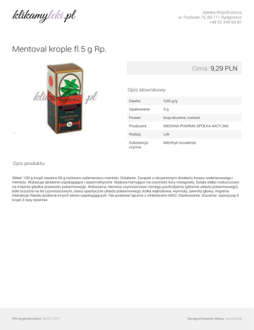 Apteka Współczesna ul. Podwale 15, 85-111 Bydgoszcz +48 52 345 65 81 Mentoval krople fl.5 g Rp. Cena: 9,29 PLN Opis słownikowy Dawka 0,65 g/g Opakowanie 5g Postać krop.doustne, roztwór Producent MEDANA PHARMA SPÓŁKA AKCYJNA Rodzaj Lek Substancja czynna Menthyli isovaleras Opis produktu Skład: 100 g kropli zawiera 65 g roztworu walerianianu mentolu. Działanie: Związek o skojarzonym działaniu kwasu walerianowego i mentolu. Wykazuje działanie uspokajające i spazmolityczne. Wpływa hamująco na czynność kory mózgowej. Działa słabo rozkurczowo na mięśnie gładkie przewodu pokarmowego. Wskazania: Nerwice czynnościowe różnego pochodzenia (głównie układu pokarmowego), bóle brzucha na tle czynnościowym, stany spastyczne układu pokarmowego, kolka wątrobowa, wymioty, zawroty głowy, migrena. Interakcje: Nasila działanie innych leków uspokajających. Nie podawać łącznie z inhibitorami MAO. Dawkowanie: Doustnie: zazwyczaj 5 kropli 3 razy dziennie. Plik wygenerowano: 08-03-2017 Powered by TCPDF (www.tcpdf.org) Oprogramowanie sklepu: AptusShop