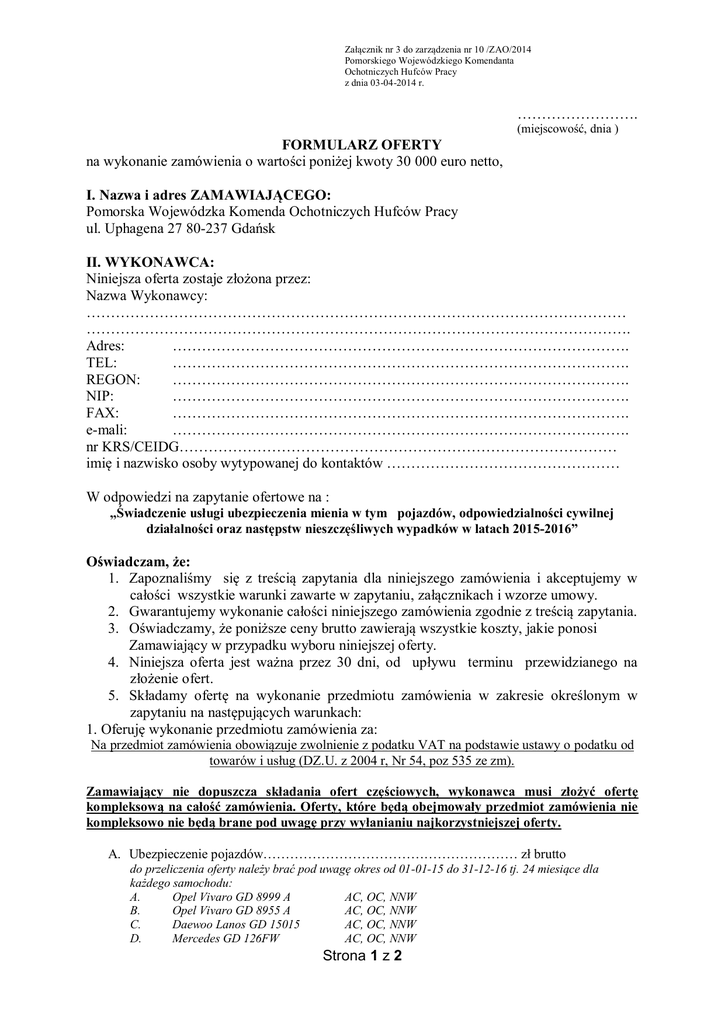 Załącznik nr 3 do zarządzenia nr 10 /ZAO/2014 Pomorskiego Wojewódzkiego Komendanta Ochotniczych Hufców Pracy z dnia 03-04-2014 r. ……………………. (miejscowość, dnia ) FORMULARZ OFERTY na wykonanie zamówienia o wartości poniżej kwoty 30 000 euro netto, I. Nazwa i adres ZAMAWIAJĄCEGO: Pomorska Wojewódzka Komenda Ochotniczych Hufców Pracy ul. Uphagena 27 80-237 Gdańsk II. WYKONAWCA: Niniejsza oferta zostaje złożona przez: Nazwa Wykonawcy: ………………………………………………………………………………………………… …………………………………………………………………………………………………. Adres: …………………………………………………………………………………. TEL: …………………………………………………………………………………. REGON: …………………………………………………………………………………. NIP: …………………………………………………………………………………. FAX: …………………………………………………………………………………. e-mali: …………………………………………………………………………………. nr KRS/CEIDG……………………………………………………………………………… imię i nazwisko osoby wytypowanej do kontaktów ………………………………………… W odpowiedzi na zapytanie ofertowe na : „Świadczenie usługi ubezpieczenia mienia w tym pojazdów, odpowiedzialności cywilnej działalności oraz następstw nieszczęśliwych wypadków w latach 2015-2016” Oświadczam, że: 1. Zapoznaliśmy się z treścią zapytania dla niniejszego zamówienia i akceptujemy w całości wszystkie warunki zawarte w zapytaniu, załącznikach i wzorze umowy. 2. Gwarantujemy wykonanie całości niniejszego zamówienia zgodnie z treścią zapytania. 3. Oświadczamy, że poniższe ceny brutto zawierają wszystkie koszty, jakie ponosi Zamawiający w przypadku wyboru niniejszej oferty. 4. Niniejsza oferta jest ważna przez 30 dni, od upływu terminu przewidzianego na złożenie ofert. 5. Składamy ofertę na wykonanie przedmiotu zamówienia w zakresie określonym w zapytaniu na następujących warunkach: 1. Oferuję wykonanie przedmiotu zamówienia za: Na przedmiot zamówienia obowiązuje zwolnienie z podatku VAT na podstawie ustawy o podatku od towarów i usług (DZ.U. z 2004 r, Nr 54, poz 535 ze zm). Zamawiający nie dopuszcza składania ofert częściowych, wykonawca musi złożyć ofertę kompleksową na całość zamówienia. Oferty, które będą obejmowały przedmiot zamówienia nie kompleksowo nie będą brane pod uwagę przy wyłanianiu najkorzystniejszej oferty. A. Ubezpieczenie pojazdów………………………………………………… zł brutto do przeliczenia oferty należy brać pod uwagę okres od 01-01-15 do 31-12-16 tj. 24 miesiące dla każdego samochodu: A. Opel Vivaro GD 8999 A AC, OC, NNW B. Opel Vivaro GD 8955 A AC, OC, NNW C. Daewoo Lanos GD 15015 AC, OC, NNW D. Mercedes GD 126FW AC, OC, NNW Strona 1 z 2 B. Ubezp. jednostek organizacyjnych Pomorskiej WK OHP…………………………… zł brutto do przeliczenia oferty należy brać pod uwagę okres od 1-01-15 do 31-12-16 tj. 24 miesiące. C. Ubezpieczenie mienia jednostek funkcjonujących w ramach utrzymania rezultatów projektu „OHP jako realizator usług rynku pracy”. …………………………………………………………………… zł brutto do przeliczenia oferty należy brać pod uwagę okres od 01-01-15 do 31-12-16 tj. 24 miesiące. D. Ubezpieczenie OC – odpowiedzialności cywilnej działalności ………………… zł brutto do przeliczenia oferty należy brać pod uwagę okres od 01-01-15 do 31-12-16 tj. 24 miesiące. E. Ubezpieczenie następstwa nieszczęśliwych wypadków uczestników ……..………… zł brutto do przeliczenia oferty należy brać pod uwagę okres od 01-01-15 do 31-12-16 tj. 24 miesiące. F. RAZEM [A+B+C+D+E] = ………………………………………. zł 2. Załącznikami do niniejszego formularza stanowiącymi integralną część oferty są: a. …….. b. ……. c. ……. …………………………… podpis osoby(osób) uprawnionej(ych) do reprezentowania Wykonawcy Strona 2 z 2