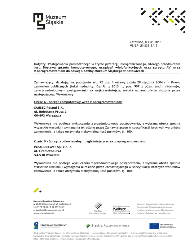 Katowice, 03.06.2015 MŚ-ZP-JK-333-5/15 Dotyczy: Postępowania prowadzonego w trybie przetargu nieograniczonego, którego przedmiotem jest: Dostawa sprzętu komputerowego, urządzeń wielofunkcyjnych oraz sprzętu AV wraz z oprogramowaniem do nowej siedziby Muzeum Śląskiego w Katowicach Zamawiający, działając na podstawie art. 92 ust. 1 ustawy z dnia 29 stycznia 2004 r. – Prawo zamówień publicznych (tekst jednolity: Dz. U. z 2013 r., poz. 907 z późn. zm.), informuje, że w przedmiotowym postępowaniu za najkorzystniejszą została uznana oferta złożona przez następującego Wykonawcę: Część A - Sprzęt komputerowy wraz z oprogramowaniem: SANSEC Poland S.A. ul. Bolesława Prusa 2 00-493 Warszawa Wykonawca nie podlega wykluczeniu z przedmiotowego postępowania, a wybrana oferta spełnia wszystkie warunki i wymagania określone przez Zamawiającego w specyfikacji istotnych warunków zamówienia, a także otrzymała maksymalną ilość punktów, tj. 100. Część B - Sprzęt audiowizualny i nagłaśniający wraz z oprogramowaniem: ProAUDIO-AVT Sp. z o. o. ul. Graniczna 89A 54-530 Wrocław Wykonawca nie podlega wykluczeniu z przedmiotowego postępowania, a wybrana oferta spełnia wszystkie warunki i wymagania określone przez Zamawiającego w specyfikacji istotnych warunków zamówienia, a także otrzymała maksymalną ilość punktów, tj. 100. Część C - Urządzenia wielofunkcyjne i system druku: PHU VECTOR Sp. z o. o. ul. Bielska 29, 40-749 Katowice Wykonawca nie podlega wykluczeniu z przedmiotowego postępowania, a wybrana oferta spełnia wszystkie warunki i wymagania określone przez Zamawiającego w specyfikacji istotnych warunków zamówienia, a także otrzymała maksymalną ilość punktów, tj. 100. INFORMACJE ZAWIERAJĄCE NAZWY (FIRMY), SIEDZIBY I ADRESY WYKONAWCÓW, KTÓRZY ZŁOŻYLI OFERTY WRAZ ZE STRESZCZENIEM OCENY I PORÓWNANIA ZŁOŻONYCH OFERT ZAWIERAJĄCYM PUNKTACJĘ: KRYTERIUM: Cena 80 % Gwarancja 20 % Część A - Sprzęt komputerowy wraz z oprogramowaniem Nr oferty: 1 2 3 Firma (nazwa lub nazwisko) oraz adres Wykonawcy Streszczenie oceny i porównania złożonych ofert Cena 80% RAZEM Gwarancja 20% Paweł Owczarzak EUPOL ul. Palinkiewicza 3, 63-000 Środa Wielkopolska 65,51 pkt 0 pkt 65,51 pkt SANSEC Poland S.A. ul. Bolesława Prusa 2 00-493 Warszawa 80,00 pkt 20 pkt 100,00 pkt Centrum Komputerowe Planeta Marcin Dejas ul. Piwna 32, 43-100 Tychy 74,44 pkt 20 pkt 94,44 pkt Część B - Sprzęt audiowizualny i nagłaśniający wraz z oprogramowaniem: Nr oferty: 1 2 3 4 5 Firma (nazwa lub nazwisko) oraz adres Wykonawcy Streszczenie oceny i porównania złożonych ofert Cena 80% RAZEM Gwarancja 20% ProAUDIO-AVT Sp. z o. o. ul. Graniczna 89A, 54-530 Wrocław 80,00 pkt 20 pkt 100,00 pkt SLX Sp. z o. o. ul. Zakładowa 6, 62-052 Komorniki 74,67 pkt 0 pkt 74,67 pkt SHADOK AV Piechuła Sp.k. ul. Wolności 404, 41-806 Zabrze 73,60 pkt 0 pkt 73,60 pkt Best-Audio Włodzimierz Pająk ul. Traugutta 25, 90-113 Łódź ------ ------ ------ 3Logic Sp. z o. o. ul. Zakopiańska 153, 30-435 Kraków 54,43 pkt 20 pkt 74,43 pkt 2 Część C - Urządzenia wielofunkcyjne i system druku: Nr oferty: 1 2 3 4 Firma (nazwa lub nazwisko) oraz adres Wykonawcy Streszczenie oceny i porównania złożonych ofert Cena 80% RAZEM Gwarancja 20% MAGRA Wilhelm & Wspólnicy Sp. J. ul. Wodzisławska 55, 44-200 Rybnik 72,72 pkt 20 pkt 92,72 pkt Konica Minolta Business Solutions Polska Sp. z o. o. ul. Muszkieterów 15, 02-273 Warszawa 77,38 pkt 20 pkt 97,38 pkt COMA – SYSTEMY CYFROWE Sp. J. Janina Łakomy, Andrzej Łakomy ul. Staffa 32, 40-576 Katowice 64,81 pkt 13,33 pkt 78,14 pkt PHU VECTOR Sp. z o. o. ul. Bielska 29, 40-749 Katowice 80,00 pkt 20 pkt 100,00 pkt Zatwierdzono w dniu 03.06.2015 r. przez Alicję Knast Dyrektora Muzeum Śląskiego w Katowicach 3