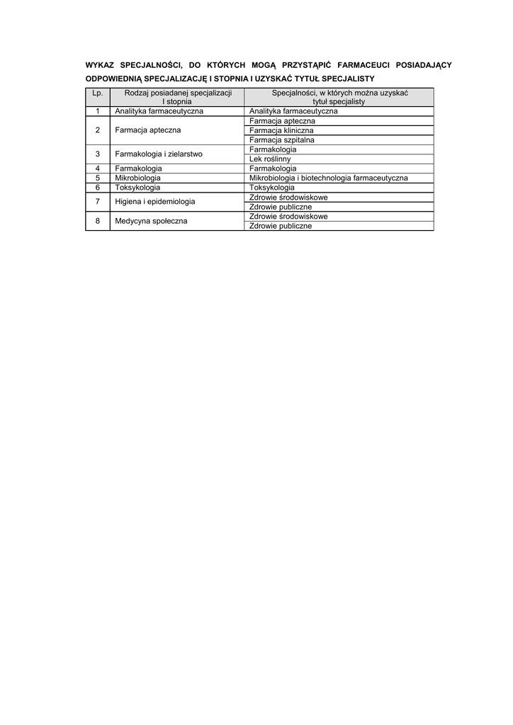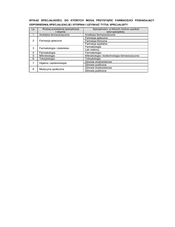 WYKAZ SPECJALNOŚCI, DO KTÓRYCH MOGĄ PRZYSTĄPIĆ FARMACEUCI POSIADAJĄCY ODPOWIEDNIĄ SPECJALIZACJĘ I STOPNIA I UZYSKAĆ TYTUŁ SPECJALISTY Lp. 1 Rodzaj posiadanej specjalizacji I stopnia Analityka farmaceutyczna 2 Farmacja apteczna 3 Farmakologia i zielarstwo 4 5 6 Farmakologia Mikrobiologia Toksykologia 7 Higiena i epidemiologia 8 Medycyna społeczna Specjalności, w których można uzyskać tytuł specjalisty Analityka farmaceutyczna Farmacja apteczna Farmacja kliniczna Farmacja szpitalna Farmakologia Lek roślinny Farmakologia Mikrobiologia i biotechnologia farmaceutyczna Toksykologia Zdrowie środowiskowe Zdrowie publiczne Zdrowie środowiskowe Zdrowie publiczne
