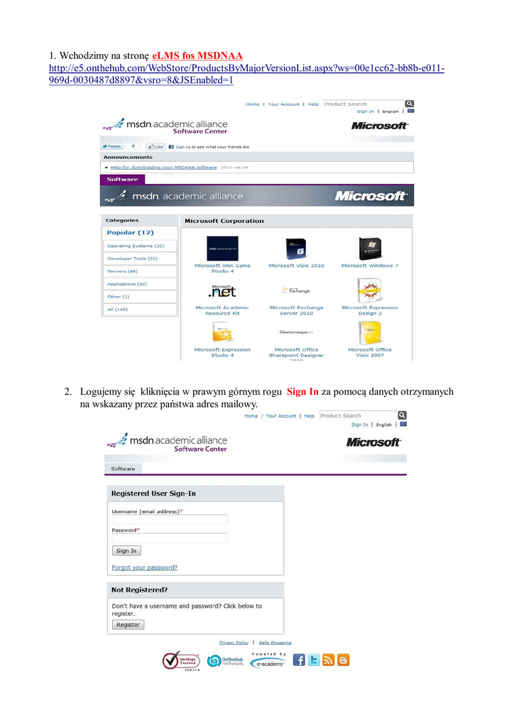 1. Wchodzimy na stronę eLMS fos MSDNAA http://e5.onthehub.com/WebStore/ProductsByMajorVersionList.aspx?ws=00e1cc62-bb8b-e011969d-0030487d8897&vsro=8&JSEnabled=1 2. Logujemy się kliknięcia w prawym górnym rogu Sign In za pomocą danych otrzymanych na wskazany przez państwa adres mailowy. 3. Po zalogowaniu z zakładki SOFTWARE wybieramy interesujący nas oprogramowanie. 4. W naszym przypadku wybraliśmy Windows 7 ( PROSZĘ PAMIĘTAĆ ABY PRZEJSĆ Z ZAKŁADKI ENGLISH NA POLISH ) i klikamy ADD TO CART 5. Potwierdzamy wybór danego oprogramowania klikając w dolnym lewym rogu na CHECK OUT 6. Znajdując się w zakładce ORDER podajemy swoje dane w miejscach wskazywane przez czerwone gwiazdki. 7. Następnie klikając PROCEED WITH ORDER przechodzimy do zakładki RECEIPT ( w której otrzymujemy nasz klucz dla danej wersji softu i możliwość ściągnięcia ) 8. Po kliknięciu w link DOWNLOAD OPTIONS a następnie klikając w link wybranego naszego systemu przechodzimy do momentu ściągania i tym samym kończymy całą procedurę .