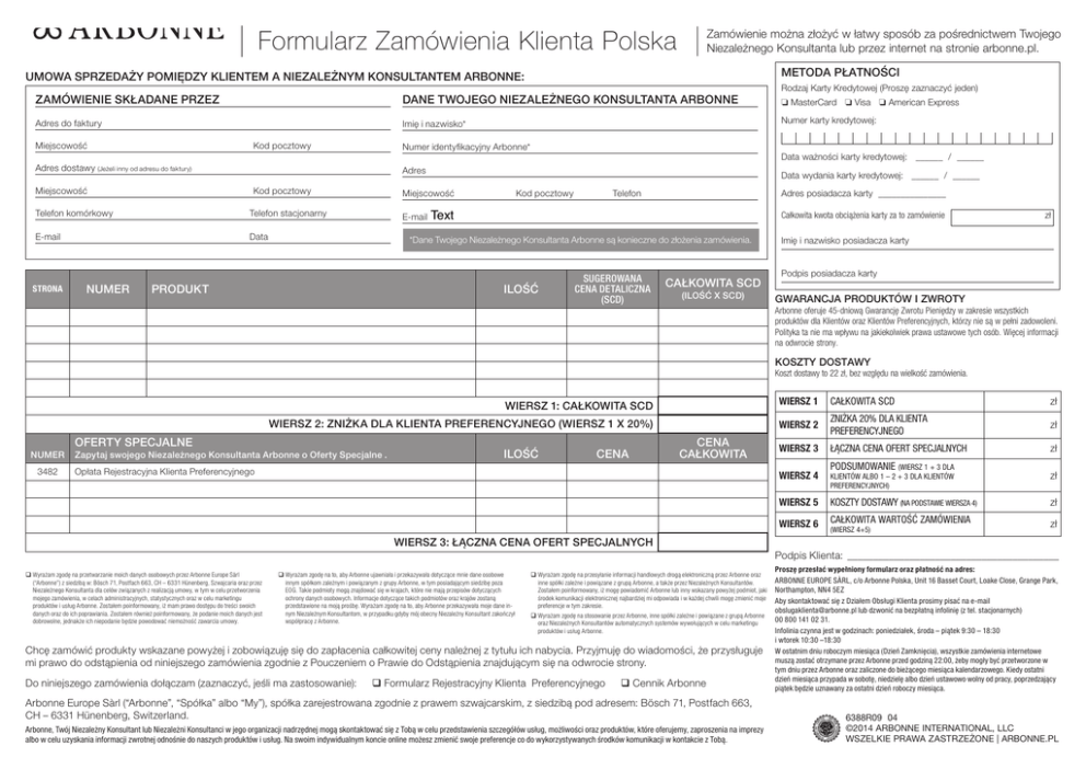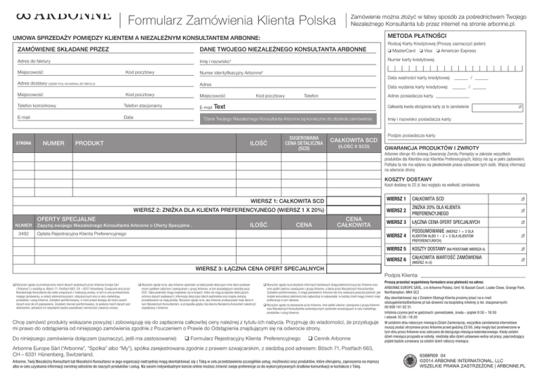 Formularz Zamówienia Klienta Polska Zamówienie można złożyć w łatwy sposób za pośrednictwem Twojego Niezależnego Konsultanta lub przez internet na stronie arbonne.pl. METODA PŁATNOŚCI UMOWA SPRZEDAŻY POMIĘDZY KLIENTEM A NIEZALEŻNYM KONSULTANTEM ARBONNE: ZAMÓWIENIE SKŁADANE PRZEZ DANE TWOJEGO NIEZALEŻNEGO KONSULTANTA ARBONNE Adres do faktury Kod pocztowy Numer identyfikacyjny Arbonne* Adres dostawy (Jeżeli inny od adresu do faktury) Miejscowość Telefon komórkowy Telefon stacjonarny E-mail Data STRONA NUMER Kod pocztowy Adres posiadacza karty _______________ Telefon Text Całkowita kwota obciążenia karty za to zamówienie *Dane Twojego Niezależnego Konsultanta Arbonne są konieczne do złożenia zamówienia. PRODUKT American Express Data wydania karty kredytowej: ______ / ______ Miejscowość E-mail Visa Data ważności karty kredytowej: ______ / ______ Adres Kod pocztowy MasterCard Numer karty kredytowej: Imię i nazwisko* Miejscowość Rodzaj Karty Kredytowej (Proszę zaznaczyć jeden) ILOŚĆ SUGEROWANA CENA DETALICZNA (SCD) CAŁKOWITA SCD (ILOŚĆ X SCD) zł Imię i nazwisko posiadacza karty Podpis posiadacza karty GWARANCJA PRODUKTÓW I ZWROTY Arbonne oferuje 45-dniową Gwarancję Zwrotu Pieniędzy w zakresie wszystkich produktów dla Klientów oraz Klientów Preferencyjnych, którzy nie są w pełni zadowoleni. Polityka ta nie ma wpływu na jakiekolwiek prawa ustawowe tych osób. Więcej informacji na odwrocie strony. KOSZTY DOSTAWY Koszt dostawy to 22 zł, bez względu na wielkość zamówienia. WIERSZ 1: CAŁKOWITA SCD WIERSZ 2: ZNIŻKA DLA KLIENTA PREFERENCYJNEGO (WIERSZ 1 X 20%) OFERTY SPECJALNE NUMER 3482 Zapytaj swojego Niezależnego Konsultanta Arbonne o Oferty Specjalne . ILOŚĆ CENA CAŁKOWITA CENA Opłata Rejestracyjna Klienta Preferencyjnego WIERSZ 1 CAŁKOWITA SCD zł WIERSZ 2 ZNIŻKA 20% DLA KLIENTA PREFERENCYJNEGO zł WIERSZ 3 ŁĄCZNA CENA OFERT SPECJALNYCH zł PODSUMOWANIE (WIERSZ 1 + 3 DLA KLIENTÓW ALBO 1 – 2 + 3 DLA KLIENTÓW PREFERENCYJNYCH) zł WIERSZ 5 KOSZTY DOSTAWY (NA PODSTAWIE WIERSZA 4) zł WIERSZ 6 CAŁKOWITA WARTOŚĆ ZAMÓWIENIA zł WIERSZ 4 (WIERSZ 4+5) WIERSZ 3: ŁĄCZNA CENA OFERT SPECJALNYCH Podpis Klienta: _________________________________________ Wyrażam zgodę na przetwarzanie moich danych osobowych przez Arbonne Europe Sàrl (“Arbonne”) z siedzibą w: Bösch 71, Postfach 663, CH – 6331 Hünenberg, Szwajcaria oraz przez Niezależnego Konsultanta dla celów związanych z realizacją umowy, w tym w celu przetworzenia mojego zamówienia, w celach administracyjnych, statystycznych oraz w celu marketingu produktów i usług Arbonne. Zostałem poinformowany, iż mam prawo dostępu do treści swoich danych oraz do ich poprawiania. Zostałem również poinformowany, że podanie moich danych jest dobrowolne, jednakże ich niepodanie będzie powodować niemożność zawarcia umowy. Wyrażam zgodę na to, aby Arbonne ujawniała i przekazywała dotyczące mnie dane osobowe innym spółkom zależnym i powiązanym z grupy Arbonne, w tym posiadającym siedzibę poza EOG. Takie podmioty mogą znajdować się w krajach, które nie mają przepisów dotyczących ochrony danych osobowych. Informacje dotyczące takich podmiotów oraz krajów zostaną przedstawione na moją prośbę. Wyrażam zgodę na to, aby Arbonne przekazywała moje dane innym Niezależnym Konsultantom, w przypadku gdyby mój obecny Niezależny Konsultant zakończył współpracę z Arbonne. Wyrażam zgodę na przesyłanie informacji handlowych drogą elektroniczną przez Arbonne oraz inne spółki zależne i powiązane z grupą Arbonne, a także przez Niezależnych Konsultantów. Zostałem poinformowany, iż mogę powiadomić Arbonne lub inny wskazany powyżej podmiot, jaki środek komunikacji elektronicznej najbardziej mi odpowiada i w każdej chwili mogę zmienić moje preferencje w tym zakresie. Wyrażam zgodę na stosowanie przez Arbonne, inne spółki zależne i powiązane z grupą Arbonne oraz Niezależnych Konsultantów automatycznych systemów wywołujących w celu marketingu produktów i usług Arbonne. Chcę zamówić produkty wskazane powyżej i zobowiązuję się do zapłacenia całkowitej ceny należnej z tytułu ich nabycia. Przyjmuję do wiadomości, że przysługuje mi prawo do odstąpienia od niniejszego zamówienia zgodnie z Pouczeniem o Prawie do Odstąpienia znajdującym się na odwrocie strony. Do niniejszego zamówienia dołączam (zaznaczyć, jeśli ma zastosowanie): Formularz Rejestracyjny Klienta Preferencyjnego Cennik Arbonne Arbonne Europe Sàrl (“Arbonne”, “Spółka” albo “My”), spółka zarejestrowana zgodnie z prawem szwajcarskim, z siedzibą pod adresem: Bösch 71, Postfach 663, CH – 6331 Hünenberg, Switzerland. Arbonne, Twój Niezależny Konsultant lub Niezależni Konsultanci w jego organizacji nadrzędnej mogą skontaktować się z Tobą w celu przedstawienia szczegółów usług, możliwości oraz produktów, które oferujemy, zaproszenia na imprezy albo w celu uzyskania informacji zwrotnej odnośnie do naszych produktów i usług. Na swoim indywidualnym koncie online możesz zmienić swoje preferencje co do wykorzystywanych środków komunikacji w kontakcie z Tobą. Proszę przesłać wypełniony formularz oraz płatność na adres: ARBONNE EUROPE SÀRL, c/o Arbonne Polska, Unit 16 Basset Court, Loake Close, Grange Park, Northampton, NN4 5EZ Aby skontaktować się z Działem Obsługi Klienta prosimy pisać na e-mail [email protected] lub dzwonić na bezpłatną infolinię (z tel. stacjonarnych) 00 800 141 02 31. Infolinia czynna jest w godzinach: poniedziałek, środa – piątek 9:30 – 18:30 i wtorek 10:30 –18:30 W ostatnim dniu roboczym miesiąca (Dzień Zamknięcia), wszystkie zamówienia internetowe muszą zostać otrzymane przez Arbonne przed godziną 22:00, żeby mogły być przetworzone w tym dniu przez Arbonne oraz zaliczone do bieżącego miesiąca kalendarzowego. Kiedy ostatni dzień miesiąca przypa