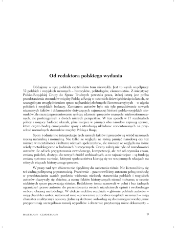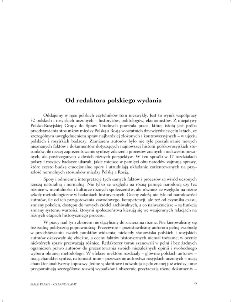 Od redaktora polskiego wydania Oddajemy w ręce polskich czytelników tom niezwykły. Jest to wynik współpracy 32 polskich i rosyjskich uczonych – historyków, politologów, ekonomistów. Z inicjatywy Polsko-Rosyjskiej Grupy do Spraw Trudnych powstała praca, której istotą jest próba przedstawienia stosunków między Polską a Rosją w ostatnich dziewięćdziesięciu latach, ze szczególnym uwzględnieniem spraw najbardziej złożonych i kontrowersyjnych – w ujęciu polskich i rosyjskich badaczy. Zamiarem autorów było nie tyle poszukiwanie nowych nieznanych faktów i dokumentów dotyczących najnowszej historii polsko-rosyjskich stosunków, ile raczej zaprezentowanie syntezy zdarzeń i procesów znanych i niekwestionowanych, ale postrzeganych z dwóch różnych perspektyw. W ten sposób w 17 rozdziałach polscy i rosyjscy badacze ukazali, jakie miejsce w pamięci obu narodów zajmują sprawy, które często budzą emocjonalne spory i utrudniają układanie zorientowanych na przyszłość normalnych stosunków między Polską a Rosją. Spory i odmienne interpretacje tych samych faktów i procesów są wśród uczonych rzeczą naturalną i normalną. Nie tylko ze względu na różną pamięć narodową czy też różnice w mentalności i kulturze różnych społeczeństw, ale również ze względu na różne szkoły metodologiczne w badaniach historycznych. Oceny zależą nie tyle od narodowości autorów, ile od ich przygotowania zawodowego, kompetencji, ale też od czynnika czasu, zmiany pokoleń, dostępu do nowych źródeł archiwalnych, a co najważniejsze – są funkcją zmiany systemu wartości, którymi społeczeństwa kierują się we wzajemnych relacjach na różnych etapach historycznego procesu. W pracy nad tym zbiorem nie dążyliśmy do zacierania różnic. Nie kierowaliśmy się też żadną polityczną poprawnością. Przeciwnie – pozostawiliśmy autorom pełną swobodę w przedstawianiu swoich punktów widzenia; niekiedy stanowiska polskich i rosyjskich autorów okazywały się zbieżne, a oceny faktów historycznych niemal tożsame; w ocenie niektórych spraw przeważają różnice. Redaktorzy tomu szanowali w pełni i bez żadnych ograniczeń prawo autorów do prezentowania swoich niezależnych opinii i swobodnego wyboru obranej metodologii. W efekcie niektóre rozdziały – głównie polskich autorów – mają charakter syntez, natomiast inne – przeważnie autorstwa rosyjskich uczonych – mają charakter analityczny i opisowy. Jedne są skrótowe i odwołują się do znanej już wiedzy, inne przypominają szczegółowo rozwój wypadków i obszernie przytaczają różne dokumenty – BIAŁE PLAMY – CZARNE PLAMY 9 Od redaktora polskiego wydania depesze dyplomatyczne, raporty i literaturę przedmiotu. Jednak elementem wspólnym dla wszystkich autorów – polskich i rosyjskich – było dążenie do rzetelnego i uczciwego przedstawienia prawdy historycznej na tym poziomie źródłowej wiedzy, jaki dostępny był w momencie, kiedy powstawały teksty zamieszczone w zbiorze. Prezentowana publikacja stanowi pierwszą próbę sporządzenia swoistej „inwentaryzacji” spraw wymagających dalszych badań. Niektóre z problemów – jak choćby zbrodnia katyńska – były przez lata zakłamywane i wymagały przywrócenia i ujawnienia pełnej prawdy. Autorzy rozdziału poświęconego tej zbrodni – Andrzej Przewoźnik (Polska) i Natalija Lebiediewa (Rosja) – różnią się w niektórych kwestiach szczegółowych i w ocenach motywów tej zbrodni; ich rozważania jednak uzupełniają się wzajemnie i w swej istocie są zbieżne, zwłaszcza w warstwie faktograficznej oraz moralnej kwalifikacji sprawców tej zbrodni. Podobne spostrzeżenia i refleksje budzi lektura wielu innych rozdziałów. Pracę zamykają dwa rozdziały zawierające charakterystykę stanu badań czyli historiografii polskiej (Marek Kornat) i rosyjskiej (Iniessa Jażborowskaja). Ich autorzy odpowiadają na pytanie, co wiemy na podstawie dotychczasowych badań. Całość zamykają komunikaty z sześciu sesji plenarnych Grupy do Spraw Trudnych. Publikowany tom jest podsumowaniem dotychczasowej wiedzy. Stanowi zarazem punkt wyjścia do dalszych badań – do wypełniania „białych plam” nowymi ustaleniami historyków i usuwania „czarnych plam” przez odkłamywanie historii i odrzucanie gromadzonych przez lata fałszerstw i półprawd, mitów, legend i stereotypów. Były one produktem czasów, w których pseudohistorycy byli na usługach propagandy, a swoboda badań i dostęp do archiwów były utrudniane i ograniczane względami ideologicznymi i politycznymi. Współpraca polskich i rosyjskich badaczy nad tym tomem świadczy o tym, że w sferze historii w relacjach Polski z Rosją przywracana jest normalność, której istotą jest poznanie całej prawdy. Prace edytorskie nad polską i rosyjską wersją językową były prowadzone równolegle. Teksty w obu wydaniach są identyczne. Różnice dotyczą kolejności, w jakiej zamieszczone są rozdziały: w polskiej edycji na pierwszym miejscu są teksty napisane przez autorów polskich, natomiast w rosyjskiej – odwrotnie. Obie edycje różni też szata graficzna oraz sposób umieszczenia przypisów: w polskim tomie są one publikowane na dole strony, natomiast w rosyjskim – na końcu każdego rozdziału. Polską edycję wzbogaciliśmy ilustracjami (zdjęcia, reprodukcje dokumentów) oraz indeksem, których nie ma w wersji rosyjskiej. Pragnę przy tej sposobności podziękować tłumaczom, redaktorom i tym wszystkim, bez których zaangażowania polska edycja wspólnego tomu w takim opracowaniu i szacie graficznej nie mogłaby się tak szybko ukazać. Szczególne podziękowania należą się redaktorowi tomu Piotrowi Budnemu, redaktorkom: pani Małgorzacie Krystyniak i pani Dorocie Dołęgowskiej oraz pani Katarzynie Rawskiej-Góreckiej, mojej asystentce, a zarazem koordynatorce prac polskiej części Grupy do Spraw Trudnych w polsko-ros
