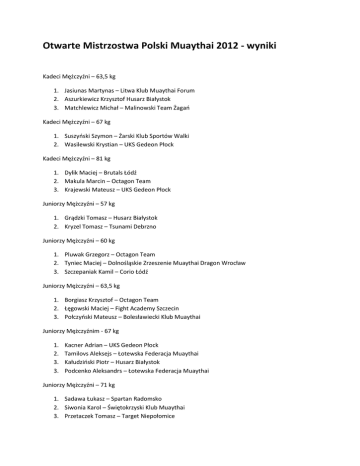 Otwarte Mistrzostwa Polski Muaythai 2012 - wyniki Kadeci Mężczyźni – 63,5 kg 1. Jasiunas Martynas – Litwa Klub Muaythai Forum 2. Aszurkiewicz Krzysztof Husarz Białystok 3. Matchlewicz Michał – Malinowski Team Żagań Kadeci Mężczyźni – 67 kg 1. Suszyński Szymon – Żarski Klub Sportów Walki 2. Wasilewski Krystian – UKS Gedeon Płock Kadeci Mężczyźni – 81 kg 1. Dylik Maciej – Brutals Łódź 2. Makula Marcin – Octagon Team 3. Krajewski Mateusz – UKS Gedeon Płock Juniorzy Mężczyźni – 57 kg 1. Grądzki Tomasz – Husarz Białystok 2. Kryzel Tomasz – Tsunami Debrzno Juniorzy Mężczyźni – 60 kg 1. Pluwak Grzegorz – Octagon Team 2. Tyniec Maciej – Dolnośląskie Zrzeszenie Muaythai Dragon Wrocław 3. Szczepaniak Kamil – Corio Łódź Juniorzy Mężczyźni – 63,5 kg 1. Borgiasz Krzysztof – Octagon Team 2. Łęgowski Maciej – Fight Academy Szczecin 3. Połczyński Mateusz – Bolesławiecki Klub Muaythai Juniorzy Mężczyźnim - 67 kg 1. 2. 3. 3. Kacner Adrian – UKS Gedeon Płock Tamilovs Aleksejs – Łotewska Federacja Muaythai Kałudziński Piotr – Husarz Białystok Podcenko Aleksandrs – Łotewska Federacja Muaythai Juniorzy Mężczyźni – 71 kg 1. Sadawa Łukasz – Spartan Radomsko 2. Siwonia Karol – Świętokrzyski Klub Muaythai 3. Przetaczek Tomasz – Target Niepołomice 3. Musiał Patryk – Krakowskie Stowarzyszenie Sztuk Walki Juniorzy Mężczyźni – 75 kg 1. 2. 3. 3. Chałko Konrad – Malinowski Team Żagań Giersz Bartłomiej – Tsunami Debrzno Kalas Radosław – Legion Bydgoszcz Irisik Michał – Malinowski Team Żagań Juniorzy Mężczyźni -81 kg 1. 2. 3. 3. Basin Ostaps – Łotewska Federacja Muaythai Kowalski Marek – The Griphouse Team Zasada Łukasz – Brutals Belousovs Antons – Łotewska Federacja Muaythai Juniorki Kobiety – 67 kg 1. Korzonek Gabriela – Octagon Team 2. Pobiegły Izabella – Perfekcja Tarnów Seniorzy Mężczyźni – 57 kg 1. Uznański Piotr – Octagon Team 2. Stańczuk Jakub – Fight Academy Szczecin Seniorzy Mężczyźni – 60 kg 1. 2. 3. 3. Dawid Rafał – Arkadia Sieradz Ciulkin Robert – Białostocki Klub Karate Kyokushin Marynowski Marcin – Am Nat Kraków Kowalski Paweł – Legion Bydgoszcz Seniorzy Mężczyźni – 63,5 kg 1. 2. 3. 3. Zugaj Cezary – Białostocki Klub Muaythai Jasiński Piotr – Szkoła Sztuk Walki Warrior Łódź Błaszczyk Krystian – Arkadia Kalisz Grzymała Tomasz – Małopolskie Zrzesznie Muaythai Raczadam Seniorzy Mężczyźni – 67 kg 1. 2. 3. 3. Łepkowski Marcin – Małopolskie Zrzeszenie Muaythai raczadam Rajewski Jakub – Legion Bydgoszcz Rotenstein Paweł – Fight Academy Szczecin Molsa Marcin – Am Nat Seniorzy Mężczyźni – 71 kg 1. Kopiec Mateusz – Garuda Warszawa 2. Kuterba Piotr – Małopolskie Zrzeszenie Muaythai Raczadam 3. Szurczak Arkadiusz – Arkadia Kalisz 3. Wędołowski Adrian – The Griphouse Team Seniorzy Mężczyźni – 75 kg 1. 2. 3. 4. Staszczak Oskar – Małopolskie Zrzeszenie Muaythai raczadam Michalecki Maciej – United Gym Łódź Krawiec Wojciech – Małopolskie Zrzeszenie Muaythai Raczadam Łada Karol – Garuda Warszawa Seniorzy Mężczyźni – 81 kg 1. 2. 3. 3. Dapkus Ernestas – Litwa Klub Muaythai Forum Janik Krzysztof – Małopolskie Zrzeszenie Muaythai Raczadam Kubiak Bartłomiej – Arkadia Kalisz Tomczyk Marcin – Gymnazion Sosnowiec Seniorzy Mężczyźni – 86 kg 1. 2. 3. 3. Szkudlarek Remigiusz – Legion Bydgoszcz Komoński Marcin – Am Nat Mutunga Bartłomiej – Arkadia Kalisz Łopatowski Kamil – Perfekcja Tarnów Seniorzy Mężczyźni – 91 kg 1. 2. 3. 3. Michalak Paweł – Czarni Słupsk Miękina Przemysław – Małopolskie Zrzeszenie Muaythai Raczadam Pochylski Mateusz – Łomiankowski Klub Sportów Walki Kobra Makula Mariusz – Octagon Team Seniorzy Mężczyźni + 91 kg 1. 2. 3. 4. Duczmal Mateusz – Arkadia Kalisz Szczepkowski Tomasz – Garuda Warszawa Dyc Mikołaj – Arkadia Kalisz Słowikowski Artur – Corio Łódź Seniorki Kobiety – 54 kg 1. Kasprzyk Magdalena – Target Niepołomice 2. Zachariasz Anna – Target Niepołomice Seniorki Kobiety – 57 kg 1. Maciuk Marlena – Brutals Łódź 2. Kocan Agnieszka – Perfekcja Tarnów Seniorki Kobiety – 60 kg 1. Jarmuła Łucja – Perfekcja Tarnów 2. Maniecka Aleksandra – Octagon Team Seniorki Kobiety – 63,5 kg 1. Rak Magdalena – Octagon Team 2. Noga Joanna – Żarski Klub Sportów Walki Seniorki Kobiety – 67 kg 1. Łyczko Ksenia – Octagon Team 2. Grisina Jana – Estonia