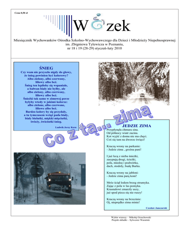 Cena 0,50 zł W zek Miesięcznik Wychowanków Ośrodka Szkolno-Wychowawczego dla Dzieci i MłodzieŜy Niepełnosprawnej im. Zbigniewa Tylewicza w Poznaniu, nr 18 i 19 (28-29) styczeń-luty 2010 ŚNIEG Czy wam nie przyszło nigdy do głowy, Ŝe śnieg powinien być kolorowy? Albo zielony, albo czerwony, liliowy albo beŜ. Śnieg ten lepiłoby się wspaniale, a bałwan biały nie byłby, ale albo zielony, albo czerwony, liliowy albo beŜ. ŚnieŜki tak samo w zimowej porze byłyby wtedy w jakimś kolorze: albo zielone, albo czerwone, liliowe albo beŜ. Bardzo kolory by się przydały, a tu tymczasem wciąŜ pada biały, biały bielutki, miękki mięciutki, świeŜy, świeŜutki śnieg. Ludwik Jerzy Kern JEDZIE ZIMA Przypłynęła chmura sina. Od północy wiatr zacina. Kot wyjść z domu nie ma chęci. Coś się tam na dworze święci! Kraczą wrony na parkanie: - Jedzie zima , groźna pani! I juŜ lecą z nieba śnieŜki, zasypują drogi, ścieŜki, pola, miedzę i podwórka, dach, stodoły, budę Burka. Kraczą wrony na jabłoni: - Jedzie zima parą koni! Mróz ściął lodem brzeg strumyka. Zając z pola w las pomyka. Krasnalowi zmarzły uszy, juŜ spod pieca się nie ruszy! Kraczą wrony na brzezinie: Oj, nieprędko zima minie! Czesław Janczarski Wybór wierszy – Mikołaj Grzechowski Projekt okładki – Sylwester Warański Dnia 9 stycznia 2010 roku odbył się bal studniówkowo-połowinkowy klas 3L i 3T oraz 2L i 2T. Impreza rozpoczęła się o godzinie 1800 w restauracji „Mr Top”. Mimo niesprzyjającej pogody, wszyscy zaproszeni goście dotarli na czas. Na początku uczniowie odtańczyli poloneza. Swoją obecnością zaszczyciła nas Pani Wicedyrektor Ewa Michalak. Wszyscy byli zadowoleni i bawili się znakomicie. DidŜejami byli Filip i Marcin. Parkiet nigdy nie był pusty. Bal trwał do późnych godzin nocnych. Tomasz Wojewoda i Wojciech Niemyt Skąd się wzięła studniówka? Jakie są jej tradycje? Korzeni tego zwyczaju doszukiwać się naleŜy w czasach bardzo odległych, w których powstawały pierwsze społeczności, ich hierarchie i kształtowały się obrzędy im towarzyszące. JuŜ członkowie plemion pierwotnych poddawani byli róŜnego typu inicjacjom zapewniającym im miejsce w grupie, a poprzedzanym okresem przygotowań wypełnionym nauką i nierzadko w ostatniej fazie medytacjami w odosobnieniu. Od zarania dziejów towarzyszyły im obrzędy magiczne, rytuały przejścia mające uchronić przed złem, nadać lub wzmocnić najbardziej poŜądane cechy, zapewnić szczęście i powodzenie na nowym etapie Ŝycia. Wspólnym dla wszystkich niemal kultur był zwyczaj uroczystego przechodzenia z jednej fazy Ŝycia do kolejnej, a wiązał się ze zmianą statusu rodzinnego i społecznego. Przełomowe etapy w Ŝyciu człowieka to przejście z okresu dziecięctwa w okres dojrzewania, wejście młodego człowieka w dorosłość. Rytuałami takimi były choćby "postrzyŜyny" siedmioletnich chłopców na znak przejścia pod męską opiekę czy Ŝakowski zwyczaj "otrzęsin". W wielu kulturach niektóre rytuały przetrwały w formie niemal niezmienionej, w innych ich ślady moŜna odnaleźć w zwyczajach współczesnych. Matura i wytyczony przez studniówkę czas ją poprzedzający jest jednym z nich. Obchodzi się je 14 lutego w dniu świętego Walentego. Święto wywodzi się z kultury anglosaskiej, ma ponad pięciowiekową tradycję, a święty Walenty patronuje mu od około XV wieku. Dlaczego w tym dniu, a patrona chorych na epilepsję i choroby umysłowe obrano takŜe patronem zakochanych? MoŜe dlatego, Ŝe stan uczuciowy zakochanych niezaleŜnie od ilorazu inteligencji, płci i wieku chwilami przypomina umysłową chorobę? Być moŜe ma teŜ symboliczny związek z okresem godowym ptaków łączących się w pary, który na Wyspach Brytyjskich przypada na ten właśnie czas? Para gołębi przecieŜ takŜe stała się symbolem zakochanych. Etymologii doszukiwać się naleŜy w pasterskim rzymskim święcie Lupercalia, obchodzonym w dniach 14 i 15 lutego, kiedy to kapłani Fauna, Luperkowie (Luperci), w grocie, w której wilczyca wychowała legendarnych załoŜycieli Rzymu, Remusa i Romulusa, składali Faunowi ofiarę, poświęcając kozę na znak płodności i psa na znak oczyszczenia. Atrybuty kozy, a raczej jej męskiego przedstawiciela, znanego z demonstrowania swej siły seksualnej przypisano bogowi płodności i patronowi pasterzy Faunowi. Rzemyki z pociętej koziej skóry zanurzano w jej krwi, ich dotyk miał zapewniać płodność i urodzaj. Wokół Palatynu odbywał się wyścig dwóch męskich druŜyn, w którym młodzi zawodnicy odziani w skóry poświęconych kóz, biegnąc chłostali widzów ich skrawkami. Dotknięcie takim skrawkiem kobiety miało sprawić, Ŝe wkrótce stanie się matką, co jest ukoronowaniem ludzkiego związku. W Dniu Świętego Walentego Masz Ŝyczenia z serca mego! Od początku znajomości w moim sercu stale gościsz I zostaniesz tam do końca, Bo to rzecz nieustająca xxx W Walentynki piękny świat, więc Ci Ŝyczę uroczyście: Ŝyj przynajmniej ze sto lat. Ze mną oczywiście! Pisać długo, to zbyteczne, lepiej krótko, lecz serdecznie. Przyjmij moje zapewnienie, Ŝe Cię kocham, wielbię, cenię. xxx Jak ogień się pali, Jak woda się leje, Tak moje serce, Za twoim szaleje. Patrycja Chudzińska Z BIBLIOTECZNEJ PÓŁKI… Drodzy Czytelnicy ☺ Wraz z końcem roku kalendarzowego pojawiło się w bibliotece sporo nowych, bardzo ciekawych pozycji ksiąŜkowych. Oto tytuły niektórych z nich: 1. Jacek Dukaj, Wroniec. 2. Nicholas Evans, Przepaść. 3. Rene Goscinny, Nieznane przygody Mikołajka. 4. Herta Müller, Sercątko. 5. E. M. Remarque, Dom marzeń. 6. Olga Tokarczuk, Prowadź swój pług przez kości umarłych. 7. E.E. Schmidt, Marzycielka z Ostendy. 8. William Wharton, Al. 9. Paulo Coelho, Weronika postanawia umrzeć. 10. Stephenie Meyer, Zmierzch. Serdecznie zachęcam do złoŜenia wizyty w szkolnej bibliotece. Barbara Nowak