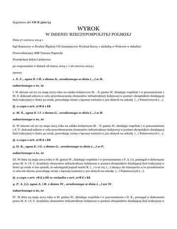 Sygnatura akt VII K 520/13 WYROK W IMIENIU RZECZYPOSPOLITEJ POLSKIEJ Dnia 27 czerwca 2014 r. Sąd Rejonowy w Środzie Śląskiej VII Zamiejscowy Wydział Karny z siedzibą w Wołowie w składzie: Przewodniczący SSR Tomasz Paprocki Protokolant Edyta Lickiewicz po rozpoznaniu w dniach 18 marca 2014 r. i 26 czerwca 2014 r. sprawy 1. S. U., syna S. i H. z domu S., urodzonego w dniu (...) w B. oskarżonego o to, że I. W okresie od 20-22 maja 2013 roku na szlaku kolejowym M. - Ś. gmina W. działając wspólnie i w porozumieniu z M. S. dokonał zaboru w celu przywłaszczenia elementów infrastruktury kolejowej w postaci obciążników działającej linii trakcyjnej w ilości 42 sztuk, powodując straty o łącznej wartości 2 310 złotych na szkodę (...) Państwowych (...), tj. o czyn z art. 278 § 1 kk 2. M. S., syna S. i I. z domu G., urodzonego w dniu (...) w B. oskarżonego o to, że II. W okresie od 20-22 maja 2013 roku na szlaku kolejowym M. - Ś. gmina W. działając wspólnie i w porozumieniu z S. U. dokonał zaboru w celu przywłaszczenia elementów infrastruktury kolejowej w postaci obciążników działającej linii trakcyjnej w ilości 42 sztuk, powodując straty o łącznej wartości 2 310 złotych na szkodę (...) Państwowych (...), tj. o czyn z art. 278 § 1 kk 3. D. K., syna E. i G. z domu G., urodzonego w dniu (...) w P. oskarżonego o to, że III. W dniu 23 maja 2013 roku w M. gmina W., działając wspólnie i w porozumieniu z P. A. (1), pomagał w dokonaniu przez M. S. i S. U. kradzieży elementów infrastruktury kolejowej w postaci obciążników działającej linii trakcyjnej w ilości 42 sztuk w ten sposób, że udostępnił pojazd marki R. (...) o nr rej. (...) służący do transportu w/w przedmiotów w celu ich zbycia, powodując straty o łącznej wartości 2 310 złotych na szkodę (...) Państwowych (...), tj. o czyn z art. 18 § 3 kk w związku z art. 278 § 1 kk 4. P. A. (1), syna A. i B. z domu W., urodzonego w dniu (...) we W. oskarżonego o to, że IV. W dniu 23 maja 2013 roku w M. gmina W., działając wspólnie i w porozumieniu z D. K., pomagał w dokonaniu przez M. S. i S. U. kradzieży elementów infrastruktury kolejowej w postaci obciążników działającej linii trakcyjnej w ilości 42 sztuk w ten sposób, że uczestniczył przy załadunku skradzionego mienia, tj. przedmiotów w celu ich zbycia, powodując straty o łącznej wartości 2 310 złotych na szkodę (...) Państwowych (...), tj. o czyn z art. 18 § 3 kk w związku z art. 278 § 1 kk ****************** I. uznaje oskarżonego S. U. i M. S. za winnych tego, że w dniu 21 maja 2013 r. w M., gmina W., działając wspólnie i w porozumieniu przywłaszczyli należące do (...) Państwowych SA – (...) mienie w postaci 42 metalowych obciążników linii trakcyjnej o łącznej wartości 2310 zł, to jest uznaje ich za winnych popełnienia przestępstwa z art. 284 § 1 kk i za to, na podstawie art. 58 § 3 kk w zw. z art. 284 § 1 kk wymierza im kary: - S. U. karę 200 stawek dziennych grzywny, ustalając wysokość jednej stawki na 10 zł, - M. S. karę 150 stawek dziennych grzywny, ustalając wysokość jednej stawki na 10 zł; II. uniewinnia D. K. i P. A. (1) od popełnienia zarzucanych im czynów opisanych w części wstępnej wyroku; III. na podstawie art. 63 § 1 kk zalicza oskarżonym S. U. i M. S. na poczet orzeczonych kar okres ich zatrzymania w dniach 23 i 24 maja 2013 r., ustalając że jest on równy czterem dziennym stawkom grzywny; IV. na podstawie art. 627 kpk i art. 3 ust. 1 ustawy z 23 czerwca 1973 r. o opłatach w sprawach karnych zasądza od oskarżonych S. U. i M. S. na rzecz Skarbu Państwa koszty sądowe, w tym opłaty od S. U. 200 zł i od M. S. 150 zł, a na mocy art. 632 pkt 2 kpk w części uniewinniającej kosztami postępowania obciąża Skarb Państwa. Sygn. akt VII K 520/13 UZASADNIENIE W dniu 21 maja 2013 r. S. U. i M. S., przechodząc przez tory kolejowe w drodze na ryby w miejscowości M., zauważyli leżące w rowie metalowe obciążniki (krążki) służące do naprężania trakcji kolejowej. Obaj postanowili zabrać obciążniki i sprzedać je w skupie złomu. W związku z tym zabrali i przewieźli rowerem 42 obciążniki do szopy S. U.. Krążki stanowiły własność (...) Państwowych SA – (...) a ich wartość wynosiła 2310 zł. Następnego dnia S. U. zadzwonił do D. K., prosząc go o pomoc w przetransportowaniu samochodem obciążników do skupu złomu. Następnie S. U. spotkał P. A. (1) i jego również poprosił o pomoc przy przewożeniu obciążników. Około godz. 12 D. K. przyjechał samochodem w okolice szopy. S. U., M. S. i P. A. (1) załadowali 13 sztuk obciążników do samochodu i wszyscy udali się do skupu złomu. W trakcie załadunku D. K. nie wysiadał z samochodu. P. A. (1) i D. K. nie wiedzieli, że obciążniki pochodzą z przestępstwa i D. U. oraz M. S. nie mówili im o tym. Po dotarciu do skupu złomu S. U. sprzedał krążki za 333,20 zł, z czego 40 zł dał D. K. a resztę podzielił między pozostałą trójkę. Następnego dnia, tj. 23 maja 2013 r. około godz. 7 S. U., M. S., D. K. i P. A. (1) ponownie spotkali się koło szopy i załadowali pozostałe obciążniki do samochodu D. K., który znów nie brał udziału w załadunku i nie wysiadał z samochodu. Następnie znów udali się do skupu złomu, gdzie zostali zatrzymani przez policję. Dowód: - zeznania P. G., k. 12, 82, 213, - protokoły oględzin, k. 14-15, 17-18, 23, - zeznania J. S., k. 21, 214, - wyjaśnienia S. U., k. 35, 134, 209-210, - wyjaśnienia M. S., k. 41, 153, 209-210, - wyjaśnienia P. A. (1), k. 47, 158, 209-210, - wyjaśnienia D. K., k. 53, 142, 209-210 - zeznania B. H., k. 60-61, 212, - dokumentacja fotograficzna, k. 124-129. W postępowaniu przygotowawczym wszyscy oskarżeni przyznali się do zarzuconych im czynów (w tym S. U. i M. S. do zarzutu kradzieży, jak i do zarzutu przywłaszczenia). W postępowaniu sądowym P. A. (1) nie przyznał się do p