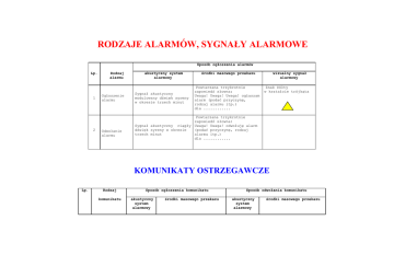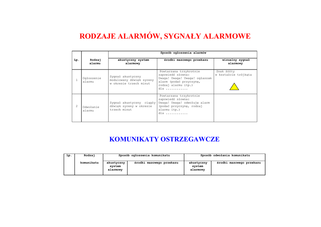 RODZAJE ALARMÓW, SYGNAŁY ALARMOWE Sposób ogłoszenia alarmów Lp. 1 2 Rodzaj alarmu Ogłoszenie alarmu Odwołanie alarmu akustyczny system alarmowy Sygnał akustyczny modulowany dźwięk syreny w okresie trzech minut środki masowego przekazu Powtarzana trzykrotnie zapowiedź słowna: Uwaga! Uwaga! Uwaga! ogłaszam alarm (podać przyczynę, rodzaj alarmu itp.) dla ............ wizualny sygnał alarmowy Znak żółty w kształcie trójkąta Powtarzana trzykrotnie zapowiedź słowna: Sygnał akustyczny ciągły Uwaga! Uwaga! odwołuję alarm dźwięk syreny w okresie (podać przyczynę, rodzaj trzech minut alarmu itp.) dla ............ KOMUNIKATY OSTRZEGAWCZE Lp. Rodzaj komunikatu Sposób ogłoszenia komunikatu akustyczny system alarmowy środki masowego przekazu Sposób odwołania komunikatu akustyczny system alarmowy środki masowego przekazu 1 Uprzedzenie o zagrożeniu skażeniami 2 Uprzedzenie o zagrożeniu zakażeniami 3 Uprzedzenie o klęskach żywiołowych i zagrożeniu środowiska Powtarzana trzykrotnie zapowiedź słowna: Uwaga! Uwaga! Osoby znajdująca się na terenie ......... około godz. ........ min. ......... może nastąpić skażenie ............ (podać rodzaj skażenia) w kierunku ........................ (podać kierunek) Powtarzana trzykrotnie zapowiedź słowna: Uwaga! Uwaga! Odwołuję uprzedzenie o zagrożeniu ........... (rodzaj skażenia) dla ......... Formę i treść komunikatu uprzedzenia o zagrożeniu zakażeniami ustalają organy Państwowej Inspekcji Sanitarnej Powtarzana trzykrotnie zapowiedź słowna: Uwaga! Uwaga! Odwołuję uprzedzenie o zagrożeniu ........... (rodzaj zakażenia) dla ......... Powtarzana trzykrotnie zapowiedź słowna: Informacja o zagrożeniu i sposobie postępowania mieszkańców …………………………………………………………………. (podać rodzaj zagrożenia, spodziewany czas wystąpienia i wytyczne dla mieszkańców) Powtarzana trzykrotnie zapowiedź słowna: Uwaga! Uwaga! Odwołuję uprzedzenie o zagrożeniu ........... (podać rodzaj klęski) dla ......... Rozporządzenie Rady Ministrów z dnia 07 stycznia 2013 r. w sprawie systemów wykrywania skażeń i powiadamiania o ich wystąpieniu oraz właściwości organów w tych sprawach (Dz. U. 2013.96) OBRONA CYWILNA RADZI ZAPOZNAJ SIĘ Z SYGNAŁAMI ALARMOWYMI ORAZ KOMUNIKATAMI OSTRZEGAWCZYMI RODZAJE ALARMÓW, SYGNAŁY ALARMOWE Sposób ogłaszania alarmów Lp. Rodzaje alarmu Akustyczny system alarmowy Sygnał akustyczny – modulowany dźwięk syreny w okresie trzech minut Środki masowego przekazu Powtarzana trzykrotnie zapowiedź słowna: Uwaga! Uwaga! Uwaga! Ogłaszam alarm (podać przyczynę, 1 Ogłoszenie alarmu Wizualny sygnał alarmowy Znak żółty w kształcie trójkąta lub w uzasadnionych przypadkach innej figury geometrycznej rodzaj alarmu itp.) ................................. dla .......................... 3 minuty 2 Odwołanie alarmu Sygnał akustyczny – ciągły dźwięk syreny w okresie trzech minut Powtarzana trzykrotnie zapowiedź słowna: Uwaga! Uwaga! Uwaga! Odwołuję alarm (podać przyczynę, ----------------------------------- rodzaj alarmu itp.) .............................. dla .......................... 3 minuty KOMUNIKATY OSTRZEGAWCZE Sposób ogłaszania komunikatu Lp. 1 2 Rodzaj komunikatu Uprzedzenie o zagrożeniu skażeniami Uprzedzenie o zagrożeniu zakażeniami Akustyczny system alarmowy Środki masowego przekazu ------------------- Powtarzana trzykrotnie zapowiedź słowna: Uwaga! Uwaga! Osoby znajdujące się na terenie .......... około godz. ........ min. ...... może nastąpić skażenie ............................... ( podać rodzaj skażenia ) w kierunku ................... ( podać kierunek ) ------------------- Formę i treść komunikatu uprzedzenia o zagrożeniu zakażeniami ustalają organy Państwowej Inspekcji Sanitarnej Sposób odwołania komunikatu Akustyczny system alarmowy ------------------- ------------------- Środki masowego przekazu Powtarzana trzykrotnie zapowiedź słowna: Uwaga! Uwaga! Odwołuję uprzedzenie o zagrożeniu ................ (podać rodzaj skażenia) dla ............... Powtarzana trzykrotnie zapowiedź słowna: Uwaga! Uwaga! Odwołuję uprzedzenie o zagrożeniu ................ (podać rodzaj zakażenia) dla ............... 3 Uprzedzenie o klęskach żywiołowych i zagrożeniu środowiska ------------------- Powtarzana trzykrotnie zapowiedź słowna: Informacja o zagrożeniu i sposobie postępowania mieszkańców ............................... ( podać rodzaj zagrożenia, spodziewany czas wystąpienia i wytyczne dla mieszkańców ) ------------------- Powtarzana trzykrotnie zapowiedź słowna: Uwaga! Uwaga! Odwołuję uprzedzenie o zagrożeniu ................ (podać rodzaj klęski) dla ............... Rozporządzenie Rady Ministrów z dnia 7 stycznia 2013 r. w sprawie systemów wykrywania skażeń i powiadamiania o ich właściwości organów w tych sprawach ( Dz. U. 2013. 96). wystąpieniu oraz PO USŁYSZENIU SYGNAŁU ALARMOWEGO CZY KOMUNIKATU OSTRZEGAWCZEGO NALEŻY : 1. Nie wywoływać paniki, zastosować się do poleceń nadawanych w tych komunikatach - ostrzec sąsiadów o alarmie. 2. Ograniczyć do niezbędnego minimum ruch pieszy i pojazdów mechanicznych. 3. Udzielać sobie wzajemnej pomocy podczas samoewakuacji ( pomóc słabszym i chorym ) –ewakuować się najkrótszą drogą . 4. Osoby pozostające w pomieszczeniach powinny uszczelnić okna, drzwi i ciągi wentylacyjne wykorzystując ścinki miękkich szmat, watę, ligninę itp. 5. W ukryciu przebywać do chwili otrzymania polecenia opuszczenia obiektu od służb porządkowych ( ratowniczych ) – posiadając bateryjny odbiornik radiowy włączyć go na pasmo rozgłośni lokalnej.
