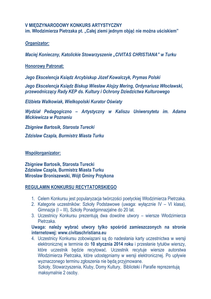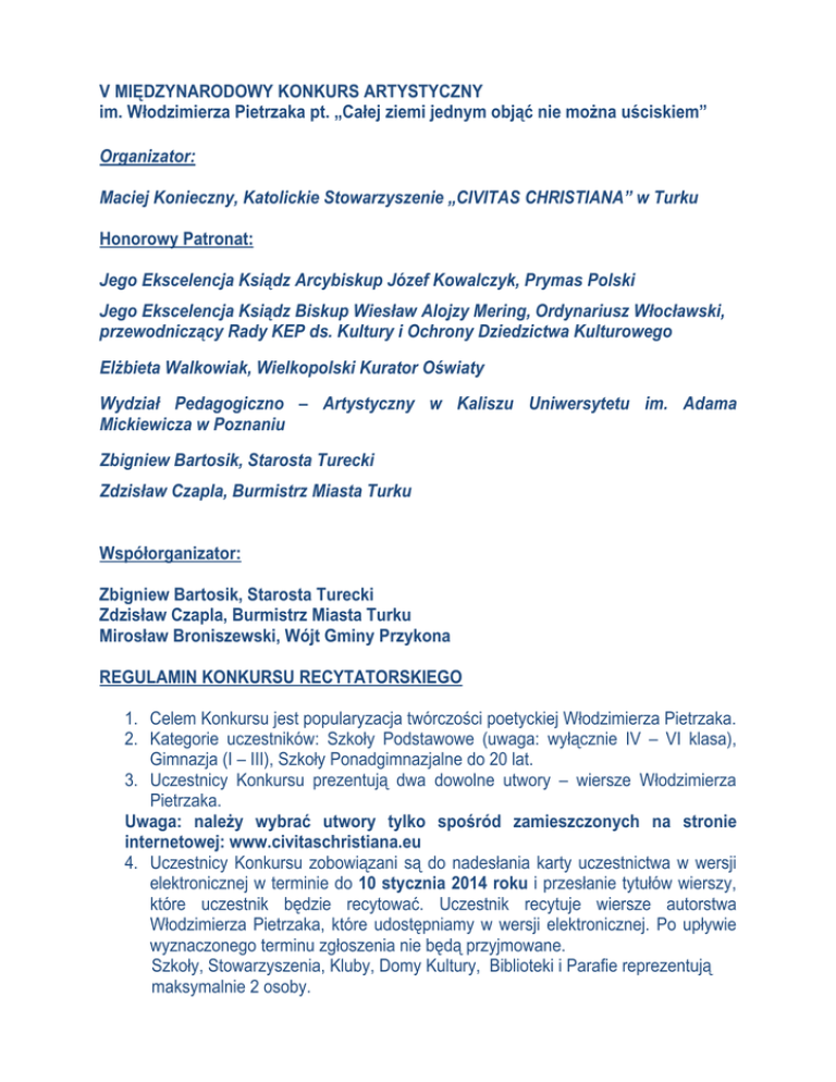 V MIĘDZYNARODOWY KONKURS ARTYSTYCZNY im. Włodzimierza Pietrzaka pt. „Całej ziemi jednym objąć nie można uściskiem” Organizator: Maciej Konieczny, Katolickie Stowarzyszenie „CIVITAS CHRISTIANA” w Turku Honorowy Patronat: Jego Ekscelencja Ksiądz Arcybiskup Józef Kowalczyk, Prymas Polski Jego Ekscelencja Ksiądz Biskup Wiesław Alojzy Mering, Ordynariusz Włocławski, przewodniczący Rady KEP ds. Kultury i Ochrony Dziedzictwa Kulturowego Elżbieta Walkowiak, Wielkopolski Kurator Oświaty Wydział Pedagogiczno – Artystyczny w Kaliszu Uniwersytetu im. Adama Mickiewicza w Poznaniu Zbigniew Bartosik, Starosta Turecki Zdzisław Czapla, Burmistrz Miasta Turku Współorganizator: Zbigniew Bartosik, Starosta Turecki Zdzisław Czapla, Burmistrz Miasta Turku Mirosław Broniszewski, Wójt Gminy Przykona REGULAMIN KONKURSU RECYTATORSKIEGO 1. Celem Konkursu jest popularyzacja twórczości poetyckiej Włodzimierza Pietrzaka. 2. Kategorie uczestników: Szkoły Podstawowe (uwaga: wyłącznie IV – VI klasa), Gimnazja (I – III), Szkoły Ponadgimnazjalne do 20 lat. 3. Uczestnicy Konkursu prezentują dwa dowolne utwory – wiersze Włodzimierza Pietrzaka. Uwaga: należy wybrać utwory tylko spośród zamieszczonych na stronie internetowej: www.civitaschristiana.eu 4. Uczestnicy Konkursu zobowiązani są do nadesłania karty uczestnictwa w wersji elektronicznej w terminie do 10 stycznia 2014 roku i przesłanie tytułów wierszy, które uczestnik będzie recytować. Uczestnik recytuje wiersze autorstwa Włodzimierza Pietrzaka, które udostępniamy w wersji elektronicznej. Po upływie wyznaczonego terminu zgłoszenia nie będą przyjmowane. Szkoły, Stowarzyszenia, Kluby, Domy Kultury, Biblioteki i Parafie reprezentują maksymalnie 2 osoby. 5. Warunkiem uczestnictwa w Konkursie jest przysłanie poprawnej karty zgłoszeniowej, która powinna zawierać czytelną informację: a) imię i nazwisko, wiek uczestnika, dokładny adres zamieszkania z numerem telefonu, email. b) imię i nazwisko nauczyciela, adres placówki dydaktycznej, numer telefonu, email. Osoby, które przyjadą na Konkurs, a nie przyślą karty zgłoszeniowej, nie będą mogły brać udziału w Konkursie recytatorskim. 6. Uczestników Konkursu w poszczególnych kategoriach wiekowych oceniać będzie profesjonalne jury powołane przez organizatorów. 7. Kryteria oceny: interpretacja tekstu, kultura słowa (dykcja, intonacja, tempo recytacji, akcentowanie – ogólny wyraz artystyczny. 8. Decyzja komisji artystycznej jest ostateczna. 9. O podziale nagród decyduje organizator Konkursu. 10. W Konkursie przyznane zostaną: I, II, III nagroda w każdej kategorii oraz nagrody specjalne. 11. Uwaga: Nagrody nie podlegają zamianie na inne, ani zamianie na ekwiwalent pieniężny. Organizator zastrzega sobie prawo do innego podziału nagród, bądź też nieprzyznania wyróżnień. 12. Wszyscy uczestnicy i ich opiekunowie otrzymają podziękowania i dyplomy 13. Organizatorzy Konkursu nie pokrywają kosztów podróży oraz noclegu. 14. Finał Konkursu recytatorskiego odbędzie się 15 lutego 2014 roku w Turku. 15. Katolickie Stowarzyszenie „Civitas Christiana” w Turku zastrzega sobie prawo do bezpłatnego wykorzystania wizerunku na potrzeby Konkursu i wystaw, we wszystkich publikacjach, prezentacjach TV, internetowych, prasowych, a także na innych nośnikach przetwarzania danych. 16. Organizator zastrzega sobie prawo do zmiany regulaminu konkursu. DODATKOWE INFORMACJE NA TEMAT KONKURSU MOŻNA UZYSKAĆ: www.civitaschristianaturek.eu lub email: [email protected] ZGŁOSZENIA PROSIMY PRZESYŁAĆ TYLKO W WERSJI ELEKTRONICZNEJ email: [email protected] Serdecznie zapraszamy do udziału w Konkursie, czekają atrakcyjne nagrody Uczestnicy Konkursu recytatorskiego wyrażają zgodę na wykorzystanie przez Organizatora danych osobowych dla potrzeb przeprowadzenia Konkursu, na warunkach określonych w ustawie z dn. 29 sierpnia 1997 r., o ochronie danych osobowych (tekst jednolity Dz. U. z 2002 r. Nr 101, poz. 926). Administratorem danych osobowych zebranych podczas niniejszego Konkursu jest – w rozumieniu ustawy z dnia 29 sierpnia 1997 r., o ochronie danych osobowych (tekst jednolity Dz. U. z 2002 r. Nr 101, poz. 926) – Organizator Konkursu. Uczestnicy Konkursu są świadomi prawa o odstępie oraz możliwości poprawienia swoich danych zgodnie z przepisami ustawy z dnia 29.08.1997 r. o ochronie danych osobowych (Dz. U. z 2002 r. Nr 101, poz. 926, ze zm.). Oświadczenie Załącznik do Regulaminu Konkursu Recytatorskiego V MIĘDZYNARODOWY KONKURS ARTYSTYCZNY EDYCJA RECYTATORSKA „Całej ziemi jednym objąć nie można uściskiem” _____________________________ ______________________________ Imię i nazwisko, klasa i wiek uczestnika adres zamieszkania, kod pocztowy i email ____________________________ _______________________________ telefon, email uczestnika nazwa, adres szkoły z telefonem ,email 1. Uczestnicy Konkursu recytatorskiego wyrażają zgodę na wykorzystanie przez Organizatora danych osobowych dla potrzeb przeprowadzenia Konkursu, na warunkach określonych w ustawie z dn. 29 sierpnia 1997 r. o ochronie danych osobowych (tekst jednolity Dz. U. z 2002 r. Nr 101, poz. 926). Administratorem danych osobowych zebranych podczas niniejszego Konkursu jest – w rozumieniu ustawy z dnia 29 sierpnia 1997 r., o ochronie danych osobowych (tekst jednolity Dz. U. z 2002 r. Nr 101, poz. 926) – Organizator Konkursu. Uczestnicy Konkursu są świadomi prawa o odstępie oraz możliwości poprawienia swoich danych zgodnie z przepisami ustawy z dnia 29.08.1997 r. o ochronie danych osobowych (Dz. U. z 2002 r. Nr 101, poz. 926, ze zm.). 2. Oświadczam, że zapoznałem (-am) się z treścią regulaminu i warunkami, które akceptuję. _______________ data ____________________________________________ podpis uczestnika Konkursu 3. Oświadczam, ze zapoznałem (-am) się z treścią regulaminu, akceptuję jego warunki i wyrażam zgodę na udział mojej córki/
