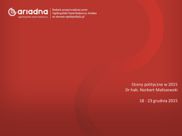 Wizerunki polityków. Zmiana postrzegania Oceny polityczne w 2015 Dr hab. Norbert Maliszewski premier Kopacz po expose 18 - 23 grudnia 2015 1-5 października 2014 roku Jak ogólnie oceniasz rząd Platformy Obywatelskiej w 2015 roku? 38% 53% 9% Pozytywnie Negatywnie Trudno powiedzieć Jak ogólnie oceniasz rząd Prawa i Sprawiedliwości w 2015 roku? 35% 55% 10% Pozytywnie Negatywnie Trudno powiedzieć Pomiar został przeprowadzony w dniach 10-15 lipca 2015 roku metodą CAWI na ogólnopolskiej próbie Polaków liczącej N=1053 osób dobranych z panelu Ariadna. Próba losowo-kwotowa. Kwoty dobrane wg reprezentacji w populacji Polaków w wieku 18 lat i więcej dla płci, wieku, wykształcenia i wielkości miejscowości zamieszkania. Jak ogólnie oceniasz rząd Platformy Obywatelskiej w 2015 roku? Odpowiedzi: zdecydowanie + raczej pozytywnie 91% 59% 40% 19% 3% Jak ogólnie oceniasz rząd Prawa i Sprawiedliwości w 2015 roku? 89% 30% 7% 5% 3% Pomiar został przeprowadzony w dniach 10-15 lipca 2015 roku metodą CAWI na ogólnopolskiej próbie Polaków liczącej N=1053 osób dobranych z panelu Ariadna. Próba losowo-kwotowa. Kwoty dobrane wg reprezentacji w populacji Polaków w wieku 18 lat i więcej dla płci, wieku, wykształcenia i wielkości miejscowości zamieszkania. Jak sądzisz jakie będą rządy Prawa i Sprawiedliwości w 2016 roku? 55% 36% 9% Pozytywne Negatywne Trudno powiedzieć Pomiar został przeprowadzony w dniach 10-15 lipca 2015 roku metodą CAWI na ogólnopolskiej próbie Polaków liczącej N=1053 osób dobranych z panelu Ariadna. Próba losowo-kwotowa. Kwoty dobrane wg reprezentacji w populacji Polaków w wieku 18 lat i więcej dla płci, wieku, wykształcenia i wielkości miejscowości zamieszkania. Jak sądzisz jakie będą rządy Prawa i Sprawiedliwości w 2016 roku? Odpowiedzi: zdecydowanie + raczej pozytywne 90% 35% 5% 4% 3% Pomiar został przeprowadzony w dniach 10-15 lipca 2015 roku metodą CAWI na ogólnopolskiej próbie Polaków liczącej N=1053 osób dobranych z panelu Ariadna. Próba losowo-kwotowa. Kwoty dobrane wg reprezentacji w populacji Polaków w wieku 18 lat i więcej dla płci, wieku, wykształcenia i wielkości miejscowości zamieszkania. Jak ogólnie oceniasz przywództwo premier Ewy Kopacz w 2015 roku? 43% 51% 6% Pozytywnie Negatywnie Trudno powiedzieć Jak ogólnie oceniasz przywództwo premier Beaty Szydło w 2015 roku? 36% 52% 12% Pozytywnie Negatywnie Trudno powiedzieć Pomiar został przeprowadzony w dniach 10-15 lipca 2015 roku metodą CAWI na ogólnopolskiej próbie Polaków liczącej N=1053 osób dobranych z panelu Ariadna. Próba losowo-kwotowa. Kwoty dobrane wg reprezentacji w populacji Polaków w wieku 18 lat i więcej dla płci, wieku, wykształcenia i wielkości miejscowości zamieszkania. Jak ogólnie oceniasz przywództwo premier Ewy Kopacz w 2015 roku? Odpowiedzi: zdecydowanie + raczej pozytywnie 91% 58% 52% 28% 13% Jak ogólnie oceniasz przywództwo premier Beaty Szydło w 2015 roku? 91% 28% 10% 5% 5% Pomiar został przeprowadzony w dniach 10-15 lipca 2015 roku metodą CAWI na ogólnopolskiej próbie Polaków liczącej N=1053 osób dobranych z panelu Ariadna. Próba losowo-kwotowa. Kwoty dobrane wg reprezentacji w populacji Polaków w wieku 18 lat i więcej dla płci, wieku, wykształcenia i wielkości miejscowości zamieszkania. Jak sądzisz jakie będą rządy premier Beaty Szydło w 2016 roku? 51% 36% 13% Pozytywne Negatywne Trudno powiedzieć Pomiar został przeprowadzony w dniach 10-15 lipca 2015 roku metodą CAWI na ogólnopolskiej próbie Polaków liczącej N=1053 osób dobranych z panelu Ariadna. Próba losowo-kwotowa. Kwoty dobrane wg reprezentacji w populacji Polaków w wieku 18 lat i więcej dla płci, wieku, wykształcenia i wielkości miejscowości zamieszkania. Jak sądzisz jakie będą rządy premier Beaty Szydło w 2016 roku? Odpowiedzi: zdecydowanie + raczej pozytywne 88% 38% 9% 5% 3% Pomiar został przeprowadzony w dniach 10-15 lipca 2015 roku metodą CAWI na ogólnopolskiej próbie Polaków liczącej N=1053 osób dobranych z panelu Ariadna. Próba losowo-kwotowa. Kwoty dobrane wg reprezentacji w populacji Polaków w wieku 18 lat i więcej dla płci, wieku, wykształcenia i wielkości miejscowości zamieszkania. Jak ogólnie oceniasz prezydenturę Bronisława Komorowskiego w 2015 roku? 45% 48% 7% Pozytywnie Negatywnie Trudno powiedzieć Jak ogólnie oceniasz prezydenturę Andrzeja Dudy w 2015 roku? 41% 52% 7% Pozytywnie Negatywnie Trudno powiedzieć Pomiar został przeprowadzony w dniach 10-15 lipca 2015 roku metodą CAWI na ogólnopolskiej próbie Polaków liczącej N=1053 osób dobranych z panelu Ariadna. Próba losowo-kwotowa. Kwoty dobrane wg reprezentacji w populacji Polaków w wieku 18 lat i więcej dla płci, wieku, wykształcenia i wielkości miejscowości zamieszkania. Jak ogólnie oceniasz prezydenturę Bronisława Komorowskiego w 2015 roku? Odpowiedzi: zdecydowanie + raczej pozytywnie 88% 68% 50% 32% 6% Jak ogólnie oceniasz prezydenturę Andrzeja Dudy w 2015 roku? 94% 47% 14% 11% 7% Pomiar został przeprowadzony w dniach 10-15 lipca 2015 roku metodą CAWI na ogólnopolskiej próbie Polaków liczącej N=1053 osób dobranych z panelu Ariadna. Próba losowo-kwotowa. Kwoty dobrane wg reprezentacji w populacji Polaków w wieku 18 lat i więcej dla płci, wieku, wykształcenia i wielkości miejscowości zamieszkania. Jak sądzisz jaka będzie prezydentura Andrzeja Dudy w nowym 2016 roku? 39% 49% 12% Pozytywna Negatywna Trudno powiedzieć Pomiar został przeprowadzony w dniach 10-15 lipca 2015 roku metodą CAWI na ogólnopolskiej próbie Polaków liczącej N=1053 osób dobranych z panelu Ariadna. Próba losowo-kwotowa. Kwoty dobrane wg reprezentacji w populacji Polaków w wieku 18 lat i więcej dla płci, wieku, wykształcenia i wielkości miejscowości zamieszkania. Jak sądzisz jaka będzie prezydentura Andrzeja Dudy w nowym 2016 roku? Odpowiedzi: zdecydowanie + raczej pozytywna 89% 46% 8% 8% 5% Pomiar został pr