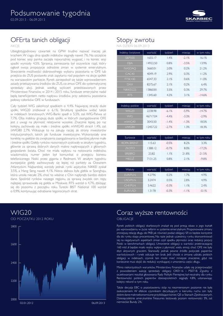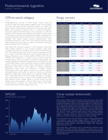 Podsumowanie tygodnia 02.09.2013 - 06.09.2013 OFErta tanich obligacji Stopy zwrotu AKCJE NA DZIEŃ 06.09.2013 Ubiegłotygodniowy czwartek na GPW trudno nazwać inaczej jak krachem. W ciągu dnia spadki indeksów sięgnęły nawet 7%. Na szczęście pod koniec sesji panika zaczęła najwyraźniej wygasać, i na koniec sesji spadki wyniosły 4,5%. Sprawcą zamieszania był oczywiście rząd, który ogłosił swoja propozycje odnośnie zmian w systemie emerytalnym. Stworzenie możliwości dobrowolnego wyboru pozostania w OFE lub przejścia do ZUS postawiło znak zapytania nad popytem na akcje spółek na warszawskim parkiecie. Rynek zaniepokoił się także wprowadzeniem zasady przekazywania środków do ZUS, co zmusi OFE do systematycznej sprzedaży akcji. Jednak według wyliczeń przedstawionych przez Ministerstwo Finansów, w 2014 i 2015 roku, fundusze emerytalne nadal będą beneficjentem netto napływu środków, przy założeniu pozostania połowy członków OFE w funduszach. Cały tydzień WIG zakończył spadkiem o 4,4%. Najwięcej straciły duże spółki, WIG20 zniżkował o 6,1%. Strukturę spadków widać także w indeksach branżowych. WIG-Banki spadł o 5,5%, zaś WIG-Paliwa aż 7,7%. Oba indeksy grupują duże spółki, w których zaangażowanie OFE jest z uwagi na płynność relatywnie wysokie. Znacznie lepiej, po raz kolejny, zachowały się małe i średnie spółki. mWIG40 stracił 1,4%, zaś sWIG80 2,7%. Wskazuje to na zakupy raczej ze strony inwestorów instytucjonalnych, takich jak fundusze inwestycyjne. Wykorzystały one korektę na giełdzie do zwiększenia zaangażowania w bardziej płynne małe i średnie spółki. Giełdy rynków rozwiniętych zyskiwały w zeszłym tygodniu, głównie za sprawą dobrych danych makro napływających z głównych gospodarek świata. Choć nie miała wpływu na notowania indeksów, wiadomością numer jeden był komunikat o przejęciu biznesu telefonicznego Nokii przez giganta z Redmont. W zeszłym tygodniu europejskie giełdy zachowywały się lepiej niż parkiety za Oceanem Atlantyckim. Najbardziej wzrosły jednak rynki azjatyckie. NIKKEI zyskał 3,5%, a Hang Seng nawet 4,1%. Nieco słabsza była giełda w Szanghaju, która urosła niecałe 2%, choć to właśnie z Chin napłynęły bardzo dobre dane. Spośród rynków naszego regionu, za sprawą zwyżek cen ropy, najlepiej sprawowała się giełda w Moskwie. RTS wzrósł o 4,7%, zbliżając się do poziomu z początku roku. Turecki BIST National 100 wzrósł o 0,9%, kontynuując odrabianie tegorocznych strat. Indeksy światowe wartość tydzień miesiąc w tym roku S&P500 1655.17 1.4% -2.1% 16.1% DJIA 14922.50 0.8% -3.5% 13.9% NASDAQ 3660.01 2.0% 0.2% 21.2% CAC40 4049.19 2.9% 0.3% 11.2% FTSE100 6547.33 2.1% 0.6% 11.0% DAX 8275.67 2.1% 0.2% 6.4% NIKKEI225 13860.81 3.5% 0.3% 29.7% RTS 1345.60 4.2% 3.1% -14.6% Indeksy polskie wartość tydzień miesiąc w tym roku WIG20 2238.98 -6.1% -5.9% -14.7% WIG 46717.04 -4.4% -3.3% -2.9% mWIG40 3043.50 -1.4% -1.3% 18.5% sWIG80 12457.22 -2.7% 1.3% 18.3% Surowce wartość tydzień miesiąc w tym roku ROPA BRENT 115.63 -0.5% 8.2% 3.3% ZŁOTO 1388.12 -0.7% 8.0% -17.2% SREBRO 23.82 1.1% 21.8% -21.5% MIEDŹ 7131.25 0.8% 2.1% -9.8% Waluty wartość tydzień miesiąc w tym roku EUR/PLN 4.2796 0.2% 1.7% 4.9% USD/PLN 3.2474 0.5% 2.8% 4.9% CHF/PLN 3.4622 -0.3% 1.1% 2.4% EUR/USD 1.3178 -0.3% -1.1% -0.1% WIG20 Coraz wyższe rentowności OD POCZĄTKU 2012 ROKU OBLIGACJE 2800 2400 Rynek polskich obligacji skarbowych znalazł się pod presją obaw o jego kształt po wprowadzeniu w życie reform w systemie emerytalnym. Proponowane zmiany zmniejszą relację długu do PKB jak również podaż obligacji SP, co będzie korzystne dla do rynku stopy procentowej. Na razie jednak uczestnicy rynku skoncentrowali się na negatywnych aspektach zmian czyli spadku płynności oraz redukcji pozycji Polski w benchmarkach obligacji. Umorzenie obligacji o wartości przekraczającej 160 mld zł będzie miało realny wpływ z płynność wielu emisji, choć OFE nie były zbyt aktywnym graczem. Stanowiły jednak pewne źródło pożyczek papierów wartościowych i rynek odczuje ten brak. Jeśli chodzi o zmianę udziału polskich obligacji w indeksach, czynnik ten może mieć mniejsze znaczenie, gdyż nie koniecznie musi dojść do redukcji wynikającej z umorzenia części długu. 2200 Mimo niekorzystnych warunków, Ministerstwu Finansów udało się przeprowadzić z powodzeniem aukcję sprzedaży obligacji OK0116 i PS0718. Zgodny z oczekiwaniami rezultat głosowania Rady Polityki Pieniężnej był neutralny dla rynku. Rentowności polskich papierów dziesięcioletnich sięgnęły 4,8%, ustanawiając kolejny rekord w tym roku. 2600 2000 02.01.2012 06.09.2013 Także decyzja EBC o pozostawieniu stóp na niezmienionym poziomie nie była zaskoczeniem. W efekcie czynnikiem decydującym o kierunku ruchu cen były dobre dane makroekonomiczne przybliżające koniec QE w Stanach Zjednoczonych. Dziesięcioletnie amerykańskie Treasuries testowały poziom rentowności 3%, zaś niemieckie Bundy 2%. Podsumowanie tygodnia 02.09.2013 - 06.09.2013 Napięcie wspiera złoto i ropę OFE, RPP, EBC, ISM, PMI SUROWCE OTOCZENIE MAKROEKONOMICZNE Napięcie związane z sytuacja w Syrii nieco opadło wobec braku działania i spadku międzynarodowego poparcia dla zbrojnej interwencji. Nie na tyle jednak, aby zmienić ogólny obraz sytuacji. Nadal dobrze trzyma się ropa naftowa. Co prawda Brent stracił niecałe pół procenta, za to niemal o 2,7% wzrosła cena ropy na rynku amerykańskim. WTI zyskiwała także z uwagi na spadek zapasów zaraportowany przez Departament Energii. Z uwagi na prognozy umiarkowanych temperatur, na giełdzie towarowej w Nowym Jorku taniał gaz ziemny. Notowaniom nie pomogła dodatkowa podaż surowca, jak ujawniła się w tym tygodniu w systemie. Wobec niepewności geopolitycznej, nieźle radziły sobie metale szlachetne. Złoto utrzymało się na poziomie nieco poniżej 1400 USD