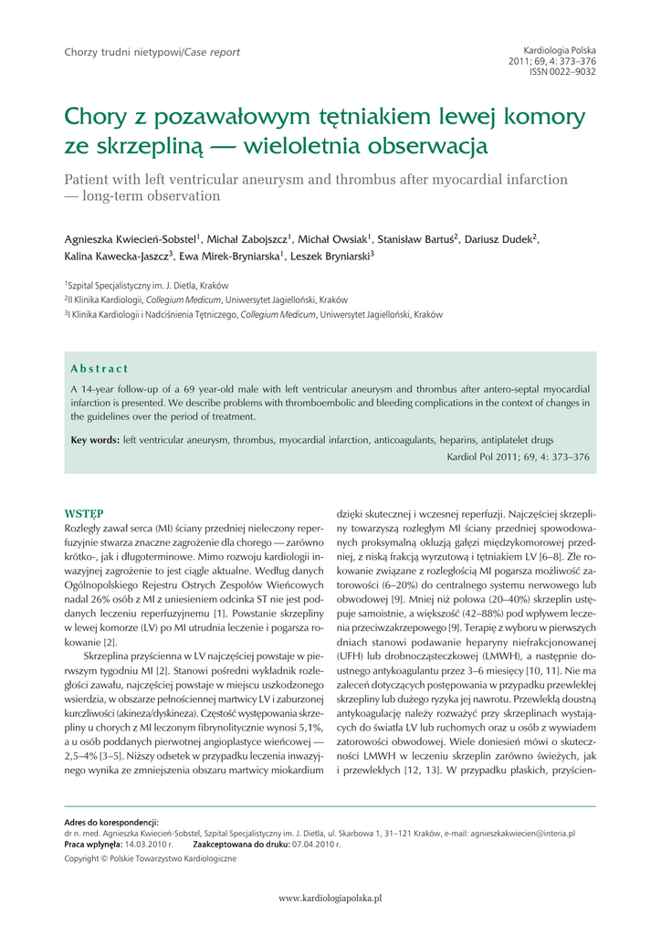 Kardiologia Polska 2011; 69, 4: 373–376 ISSN 0022–9032 Chorzy trudni nietypowi/Case report Chory z pozawałowym tętniakiem lewej komory ze skrzepliną — wieloletnia obserwacja Patient with left ventricular aneurysm and thrombus after myocardial infarction — long-term observation Agnieszka Kwiecień−Sobstel1, Michał Zabojszcz1, Michał Owsiak1, Stanisław Bartuś2, Dariusz Dudek2, Kalina Kawecka−Jaszcz3, Ewa Mirek−Bryniarska1, Leszek Bryniarski3 1Szpital Specjalistyczny im. J. Dietla, Kraków 2II Klinika Kardiologii, Collegium Medicum, Uniwersytet Jagielloński, Kraków 3I Klinika Kardiologii i Nadciśnienia Tętniczego, Collegium Medicum, Uniwersytet Jagielloński, Kraków Abstract A 14-year follow-up of a 69 year-old male with left ventricular aneurysm and thrombus after antero-septal myocardial infarction is presented. We describe problems with thromboembolic and bleeding complications in the context of changes in the guidelines over the period of treatment. Key words: left ventricular aneurysm, thrombus, myocardial infarction, anticoagulants, heparins, antiplatelet drugs Kardiol Pol 2011; 69, 4: 373–376 WSTĘP Rozległy zawał serca (MI) ściany przedniej nieleczony reperfuzyjnie stwarza znaczne zagrożenie dla chorego — zarówno krótko-, jak i długoterminowe. Mimo rozwoju kardiologii inwazyjnej zagrożenie to jest ciągle aktualne. Według danych Ogólnopolskiego Rejestru Ostrych Zespołów Wieńcowych nadal 26% osób z MI z uniesieniem odcinka ST nie jest poddanych leczeniu reperfuzyjnemu [1]. Powstanie skrzepliny w lewej komorze (LV) po MI utrudnia leczenie i pogarsza rokowanie [2]. Skrzeplina przyścienna w LV najczęściej powstaje w pierwszym tygodniu MI [2]. Stanowi pośredni wykładnik rozległości zawału, najczęściej powstaje w miejscu uszkodzonego wsierdzia, w obszarze pełnościennej martwicy LV i zaburzonej kurczliwości (akineza/dyskineza). Częstość występowania skrzepliny u chorych z MI leczonym fibrynolitycznie wynosi 5,1%, a u osób poddanych pierwotnej angioplastyce wieńcowej — 2,5–4% [3–5]. Niższy odsetek w przypadku leczenia inwazyjnego wynika ze zmniejszenia obszaru martwicy miokardium dzięki skutecznej i wczesnej reperfuzji. Najczęściej skrzepliny towarzyszą rozległym MI ściany przedniej spowodowanych proksymalną okluzją gałęzi międzykomorowej przedniej, z niską frakcją wyrzutową i tętniakiem LV [6–8]. Złe rokowanie związane z rozległością MI pogarsza możliwość zatorowości (6–20%) do centralnego systemu nerwowego lub obwodowej [9]. Mniej niż połowa (20–40%) skrzeplin ustępuje samoistnie, a większość (42–88%) pod wpływem leczenia przeciwzakrzepowego [9]. Terapię z wyboru w pierwszych dniach stanowi podawanie heparyny niefrakcjonowanej (UFH) lub drobnocząsteczkowej (LMWH), a następnie doustnego antykoagulantu przez 3–6 miesięcy [10, 11]. Nie ma zaleceń dotyczących postępowania w przypadku przewlekłej skrzepliny lub dużego ryzyka jej nawrotu. Przewlekłą doustną antykoagulację należy rozważyć przy skrzeplinach wystających do światła LV lub ruchomych oraz u osób z wywiadem zatorowości obwodowej. Wiele doniesień mówi o skuteczności LMWH w leczeniu skrzeplin zarówno świeżych, jak i przewlekłych [12, 13]. W przypadku płaskich, przyścien- Adres do korespondencji: dr n. med. Agnieszka Kwiecień-Sobstel, Szpital Specjalistyczny im. J. Dietla, ul. Skarbowa 1, 31–121 Kraków, e-mail: [email protected] Praca wpłynęła: 14.03.2010 r. Zaakceptowana do druku: 07.04.2010 r. Copyright © Polskie Towarzystwo Kardiologiczne www.kardiologiapolska.pl 374 Agnieszka Kwiecień-Sobstel et al. nych skrzeplin „wyścielających” jamę tętniaka można zrezygnować z przewlekłego leczenia przeciwzakrzepowego, gdyż ryzyko zatorowości (0,35–1% rocznie) jest mniejsze niż ryzyko powikłań krwotocznych [9]. W niektórych przypadkach ruchomych skrzeplin dających powikłania zatorowe alternatywą pozostaje operacja kardiochirurgiczna z wycięciem tętniaka, ewakuacją skrzepliny i plastyką LV [14]. Leczenie fibrynolityczne jest przeciwwskazane ze względu na duże ryzyko zatorowości [15]. OPIS PRZYPADKU Powyższe aspekty ilustruje przypadek jednego z chorych będących w trakcie wieloletniej obserwacji. Jest to mężczyzna, obecnie w wieku 69 lat, z wieloletnim nadciśnieniem tętniczym (od 1984 r.), hipercholesterolemią, palący tytoń (30 papierosów/d. przez 30 lat), z obciążającym wywiadem rodzinnym. W sierpniu 1996 r. w wieku 55 lat doznał rozległego MI ściany przednio-bocznej, będącego pierwszą manifestacją choroby niedokrwiennej serca, a ze względu na późne zgłoszenie się do szpitala nie był leczony fibrynolitycznie (pierwotna PCI nie była dostępna w tym czasie). Przebieg był powikłany nagłym zatrzymaniem krążenia w mechanizmie migotania komór i lewokomorową niewydolnością serca. W przezklatkowym badaniu echokardiograficznym (TTE) LV była niepowiększona, frakcja wyrzutowa wynosiła 57%, ale w dyskinetycznym koniuszku utworzyła się niewielka przyścienna skrzeplina, mimo stosowania heparyny w ostrej fazie MI. W przewlekłym leczeniu zastosowano kwas acetylosalicylowy (ASA) w dawce 150 mg dziennie, ponadto beta-adrenolityk, inhibitor ACE, antagonistę wapnia, diuretyk pętlowy, statynę i acenokumarol. W kontrolnym TTE po 6 miesiącach stwierdzono remodeling LV ze spadkiem frakcji wyrzutowej do 35%, wytworzeniem tętniaka ściany przednio-przegrodowej i koniuszka i nadal obecną skrzepliną. Utrzymano acenokumarol, co spowodowało rozpuszczenie się skrzepliny potwierdzone kolejnymi badaniami TTE. W listopadzie 1998 r. (po 2 latach od MI) doszło do krwawienia z górnego odcinka przewodu pokarmowego, z potwierdzonym gastroskopowo owrzodzeniem we wpuście oraz nadżerkami krwotocznymi w trzonie i części przedodźwiernikowej — z tego powodu odstawiono acenokumarol. W czerwcu 1999 r. doszło do powtórnego krwawienia z przewodu pokarmowego