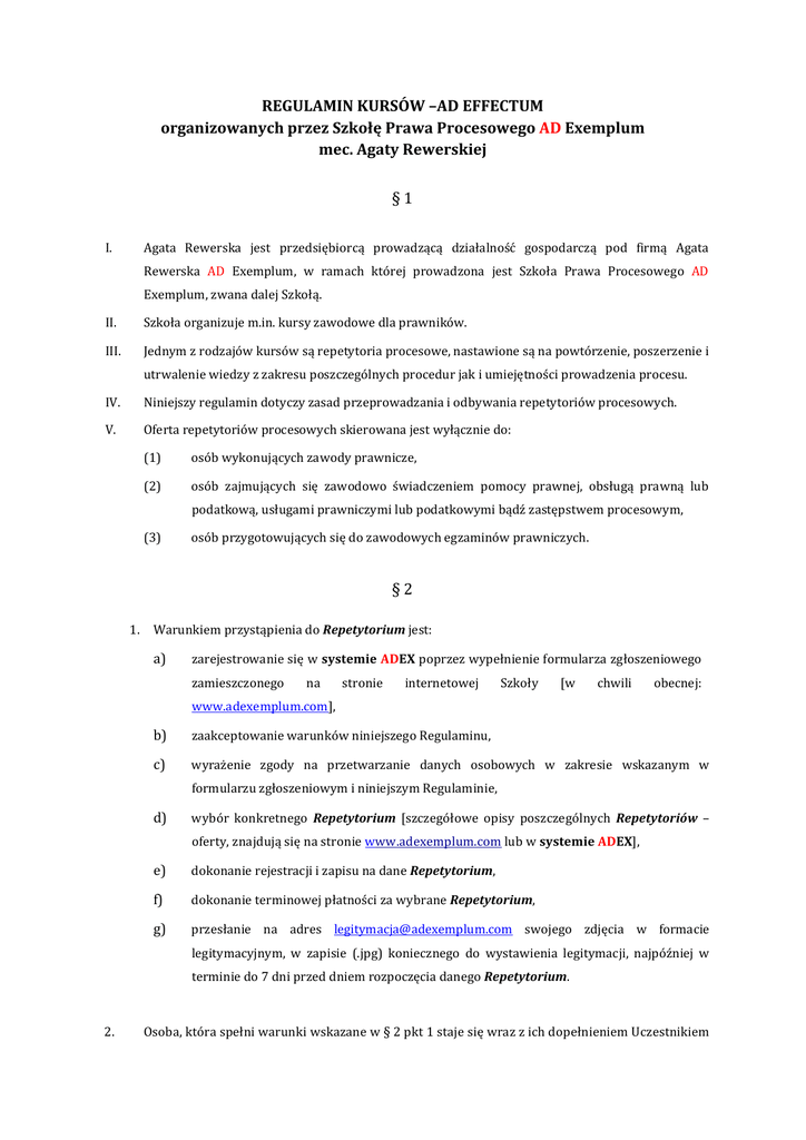 REGULAMINKURSÓW–ADEFFECTUM organizowanychprzezSzkołęPrawaProcesowegoADExemplum mec.AgatyRewerskiej §1 I. Agata Rewerska jest przedsiębiorcą prowadzącą działalność gospodarczą pod firmą Agata Rewerska AD Exemplum, w ramach której prowadzona jest Szkoła Prawa Procesowego AD Exemplum,zwanadalejSzkołą. II. Szkołaorganizujem.in.kursyzawodowedlaprawników. III. Jednymzrodzajówkursówsąrepetytoriaprocesowe,nastawionesąnapowtórzenie,poszerzeniei utrwaleniewiedzyzzakresuposzczególnychprocedurjakiumiejętnościprowadzeniaprocesu. IV. Niniejszyregulamindotyczyzasadprzeprowadzaniaiodbywaniarepetytoriówprocesowych. V. Ofertarepetytoriówprocesowychskierowanajestwyłączniedo: (1) osóbwykonującychzawodyprawnicze, (2) osób zajmujących się zawodowo świadczeniem pomocy prawnej, obsługą prawną lub podatkową,usługamiprawniczymilubpodatkowymibądźzastępstwemprocesowym, (3) osóbprzygotowującychsiędozawodowychegzaminówprawniczych. §2 1. WarunkiemprzystąpieniadoRepetytoriumjest: a) zarejestrowaniesięwsystemieADEXpoprzezwypełnienieformularzazgłoszeniowego zamieszczonego na stronie internetowej Szkoły [w chwili obecnej: www.adexemplum.com], b) zaakceptowaniewarunkówniniejszegoRegulaminu, c) wyrażenie zgody na przetwarzanie danych osobowych w zakresie wskazanym w formularzuzgłoszeniowymininiejszymRegulaminie, d) wybór konkretnego Repetytorium [szczegółowe opisy poszczególnych Repetytoriów – oferty,znajdująsięnastroniewww.adexemplum.comlubwsystemieADEX], e) dokonanierejestracjiizapisunadaneRepetytorium, f) dokonanieterminowejpłatnościzawybraneRepetytorium, g) przesłanie na adres [email protected] swojego zdjęcia w formacie legitymacyjnym, w zapisie (.jpg) koniecznego do wystawienia legitymacji, najpóźniej w terminiedo7dniprzeddniemrozpoczęciadanegoRepetytorium. 2. Osoba,któraspełniwarunkiwskazanew§2pkt1stajesięwrazzichdopełnieniemUczestnikiem Repetytorium.UczestnikRepetytoriumjestUżytkownikiemsystemuADEX. 3. Zarejestrowanie się i założenie indywidualnego konta w systemie ADEX nie jest tożsame z zapisaniemsięnaRepetytorium. 4. Wypełnienie formularza zgłoszeniowego, zaakceptowanie Regulaminu, zarejestrowanie się i zapisanie na dane Repetytorium za pomocą systemu ADEX jest równoznaczne z zawarciemumowy. 5. Szkoła zastrzega sobie prawo odmowy przyjęcia formularza rejestracyjnego, jak i udzielania dostępudosytemuADEXbezpodaniaprzyczyny. 6. Wszystkie postanowienia łączące Strony zawarte są w niniejszym REGULAMINIE oraz ofercie danegoRepetytorium. §3 1. Wysłanie formularza rejestracyjnego oznacza akceptację warunków Regulaminu oraz zgodę na gromadzenie, przetwarzanie oraz wykorzystywanie podanych danych zarówno przez Szkołę, jak i innepodmiotyzniąwspółpracujące,wcelachzwiązanychzdoskonaleniemzawodowymiedukacją, w tym w szczególności kwestiami dotyczącymi organizacji i przeprowadzenia danego Repetytorium,jakiwcelachstatystycznych,marketingowychipromocyjnychorazprzesyłaniaofert handlowych Szkoły oraz współpracujących z nią podmiotów. Dane mogą być także gromadzone i przetwarzane w zbiorach danych, które mogą być utrwalane dowolną techniką, m.in. w systemach informatycznychiinnychzbiorachdanych,nadowolnejilościirodzajunośników. 2. PrzezzaakceptowaniewarunkówzawartychwRegulaminieUczestniczka/Uczestnikoświadcza,że zapoznałasię/zapoznałsięztreściąRegulaminuiwyrażazgodęnawłączeniegodotreściumowy. 3. Zawarcie umowy stanowi zobowiązanie Uczestniczki/Uczestnika do stosowania postanowień Regulaminu w całości, w tym w szczególności w zakresie załączania prac domowych i egzaminacyjnychorazpoufności,tajemnicykorespondencjiitajemnicyhandlowejSzkoły. 4. Szkoła dołoży staranności w przeprowadzeniu Repetytorium, niemniej nie ponosi żadnej odpowiedzialności za rezultat szkolenia, w tym także za wyniki jakichkolwiek egzaminów – także prawniczych egzaminów zawodowych – m.in. radcowskiego i adwokackiego, do których Uczestniczka/Uczestnikzdecydujesięprzystąpić. §4 1. Repetytorium składa się z zajęć szkoleniowych w ilości wskazanej w opisie poszczególnych Repetytoriów [przy czym 1 godzina szkoleniowa obejmuje 40 minut]. 2. Repetytoriumrozpoczynasięwdniuwyznaczonymnaprzeprowadzeniepierwszychzajęćzgodnie zharmonogramemitrwadodniaostatniegozdniegzaminuzawodowegowyznaczonegoprzezMS. 3. DzieńzakończeniaRepetytoriumprzypadanaostatnidzieńegzaminówzawodowych[odpowiednio radcowskiegoiadwokackiego]wskazanywogłoszeniuMinistraSprawiedliwości. 4. UdziałwzajęciachRepetytoriumniejestobowiązkowy. 5. W ramach organizacji Repetytorium Szkoła współpracuje m.in. zFundacją Radców Prawnych na RzeczNaukioProcesieIudiciumArsEst. §5 1. Niniejszym Uczestniczka/Uczestnik Repetytorium wyraża zgodę na otrzymywanie za pośrednictwem systemu ADEX (czyli na swoje indywidualne konto w systemie ADEX) bądź/orazpodanywformularzuzgłoszeniowymadresmailowybądź/oraztelefon: → materiałówdydaktycznych, → indywidualnychrecenzjipracdomowych, → indywidualnychrecenzjipraczegzaminówpróbnych, → informacji dotyczących terminów i miejsc zajęć, ich zmiany bądź odwołania z przyczyn losowych, → proponowanychrozwiązańcasusów, → wzorcowychapelacji,skargiumów, → materiałówaudiowizualnych, → opracowańposzczególnychinstytucjiprawamaterialnegobądźprocesowego, → orzeczeń sądowych, w tym opracowań i komentarzy dotyczących poszczególnych linii orzeczniczych, → glosdoorzeczeń, → informacji o publikacjach dydaktyczno-naukowych Wydawnictwa Naukowo-Prawniczego ADExemplumorazinnychwydawnictw, → informacji o wydarzeń prawniczych, w tym konferencjach, szkoleniach, klubach dyskusyjnych,wyjazdachintegracyjnych,szkoleniachzagranicznych,etc., → informacjidotyczącychśrodowiskaprawniczegotakichjaknp.gale,rozdaniacertyfikatów, wręczenianagród,konkursy,spotkaniaokolicznościowe,etc., → informacji dotyczących kwestii związanych z wykonywaniem zawodu i jego organ